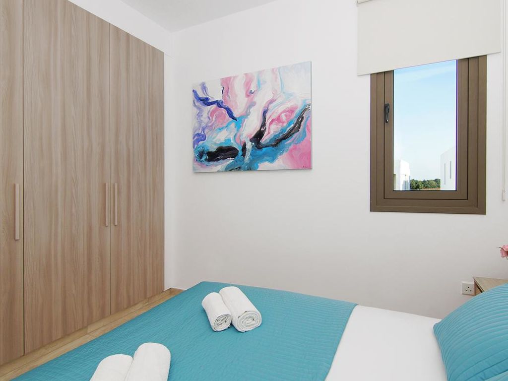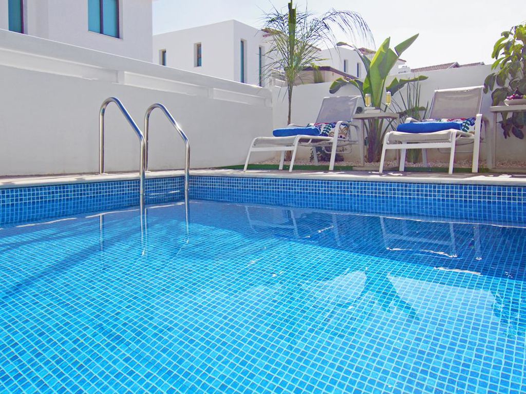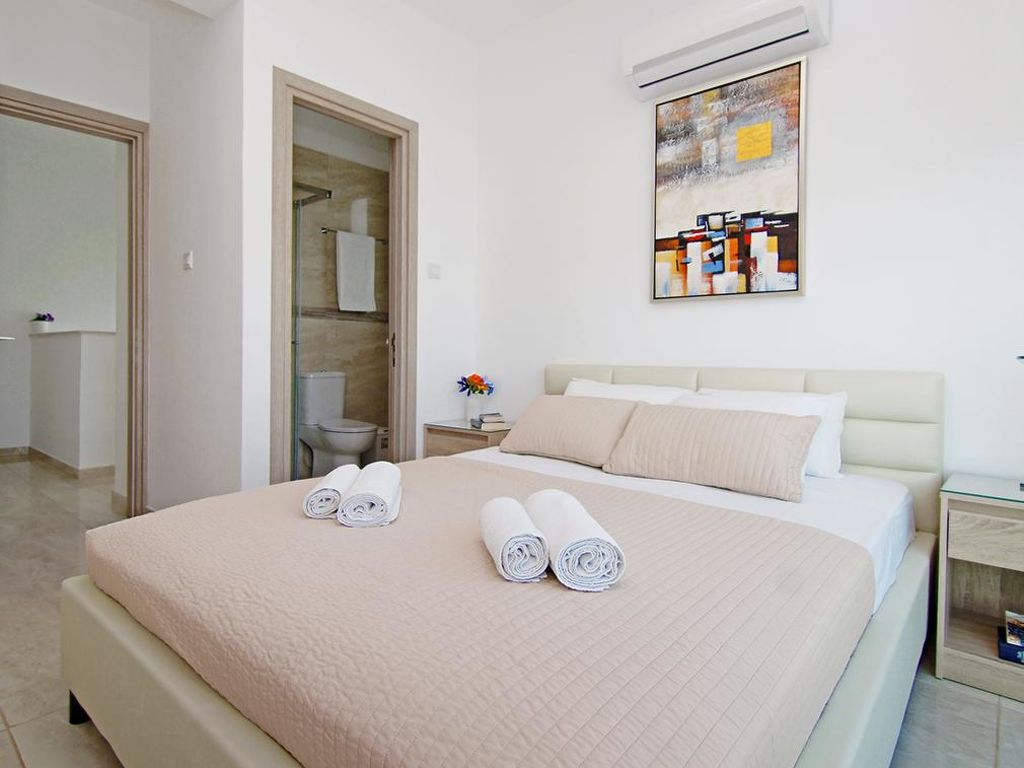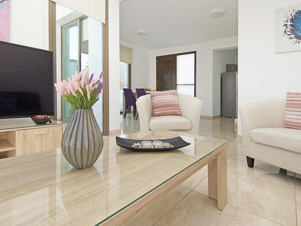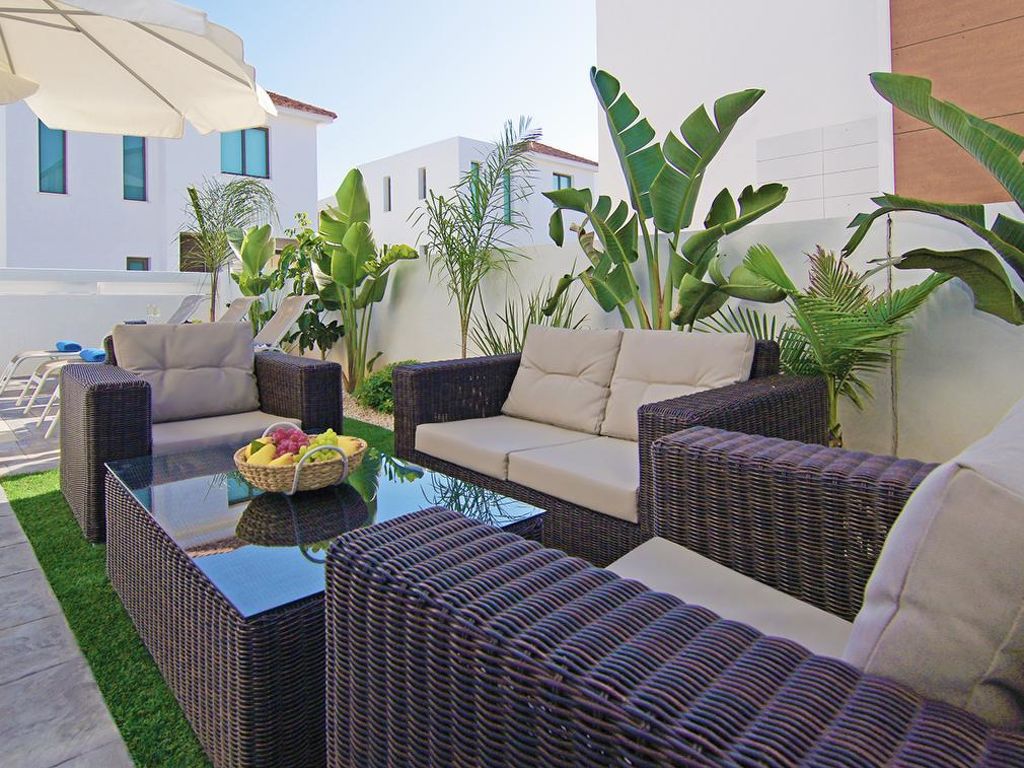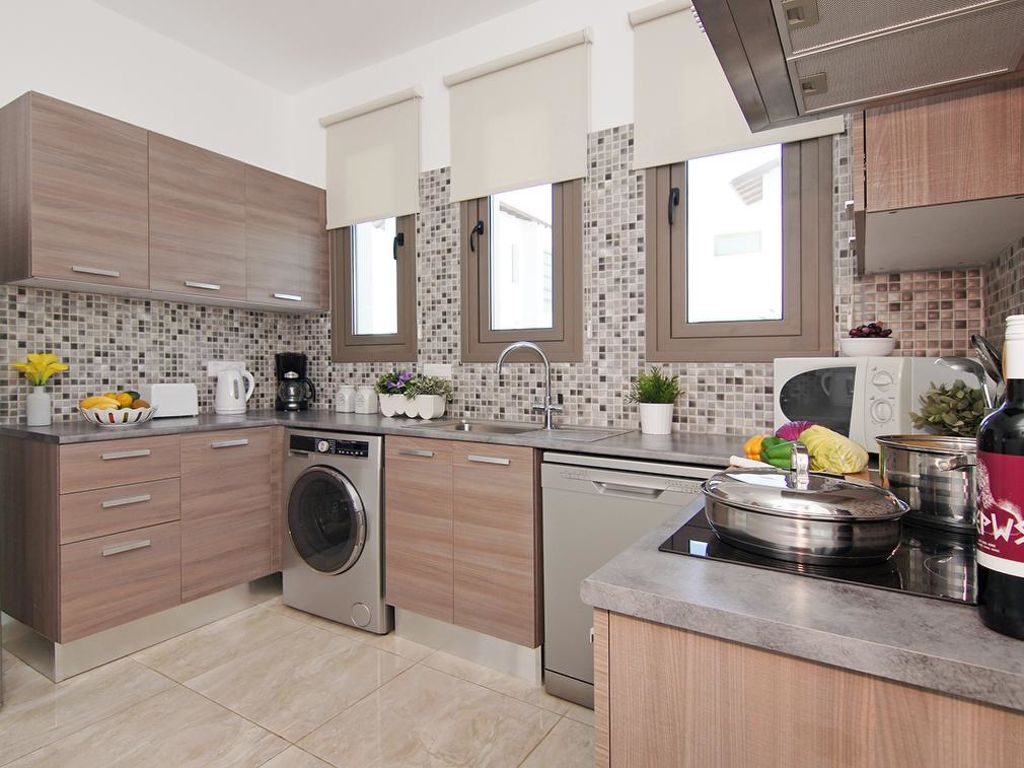 Moderne Villa "ATLEV43". Hausausstattung: Klimaanlage, Waschmaschine (zur Alleinbenutzung). Zufahrt & Parkmöglichkeiten: reservierter Parkplatz. Ganzjährig Zufahrt bis zum Haus möglich. Lage: im Ortszentrum von Ayia Triada, am Ortsrand von Protaras. Umgebung des Hauses: Swimming Pool (zur Alleinbenutzung, Länge 3 m x Breite 6 m), Aussendusche (zur Alleinbenutzung). Infrastruktur und Distanzen: Supermarkt 1 km, Restaurant 1 km, Sandstrand 1.3 km.