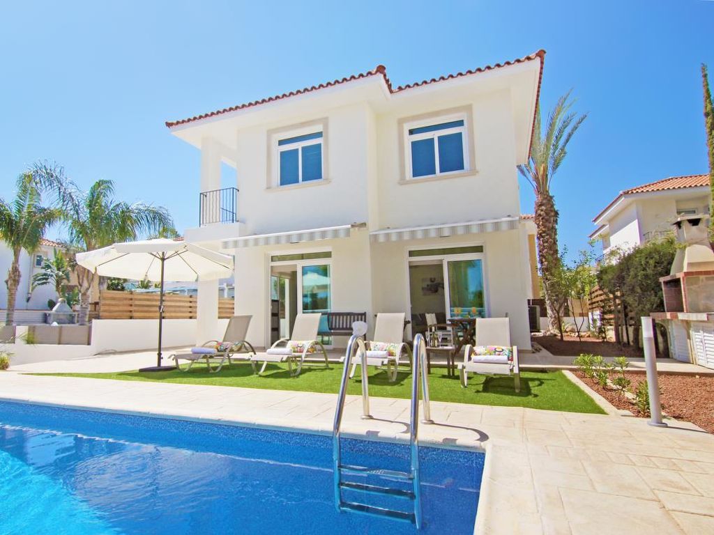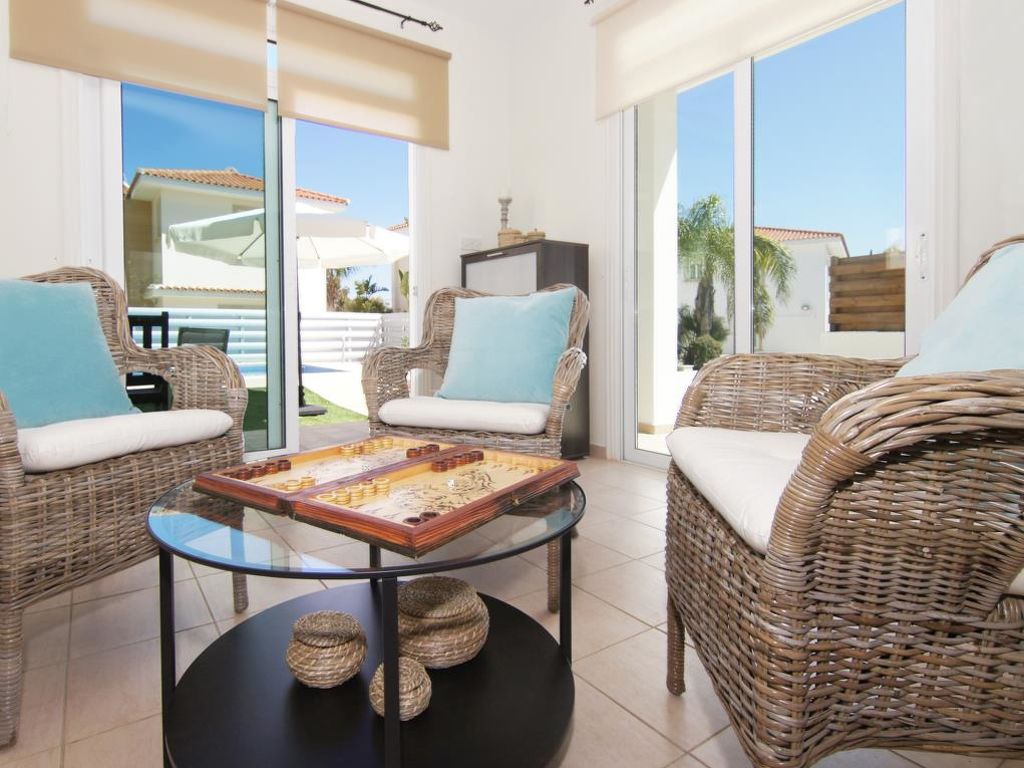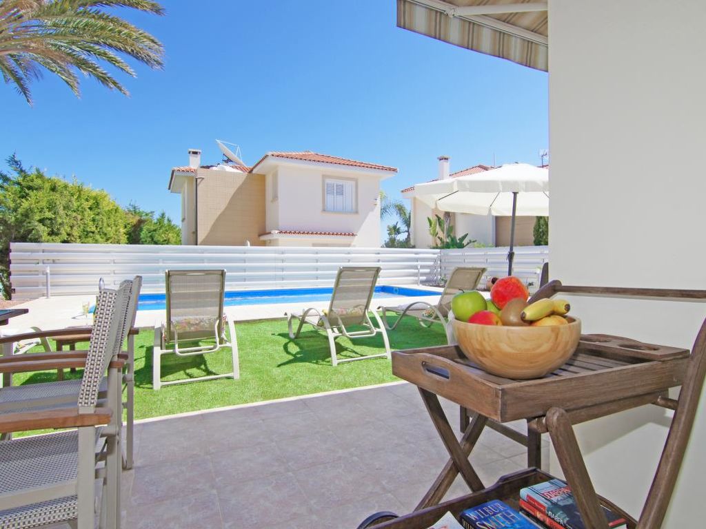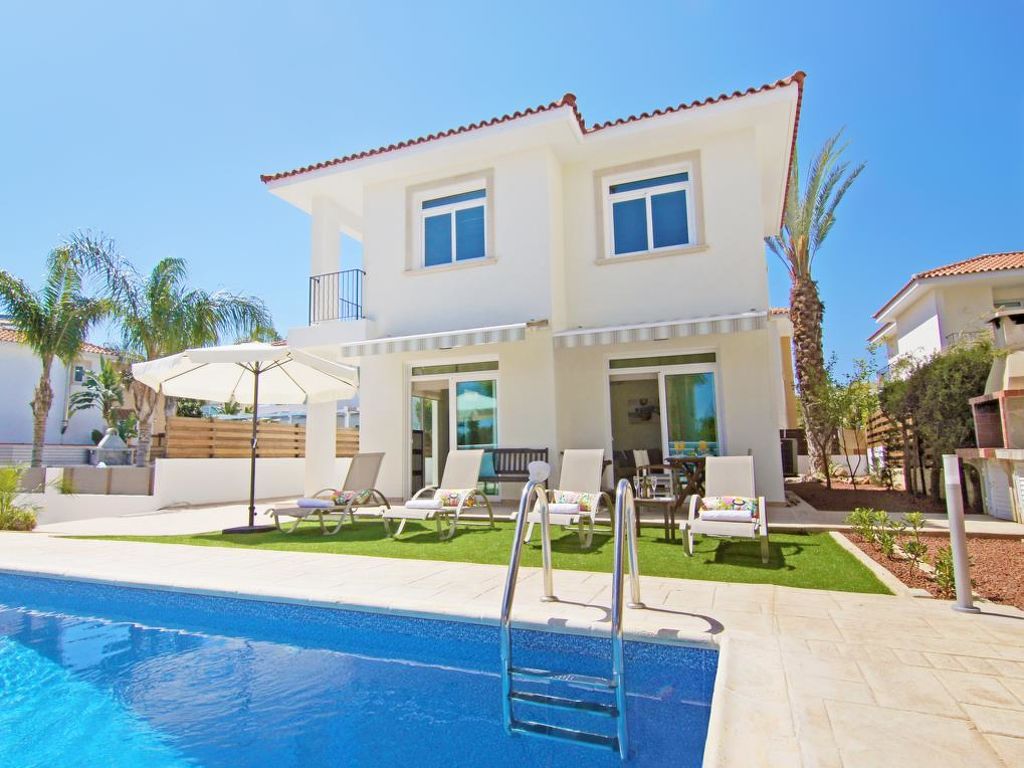 Moderne Villa "PRMEA11". Hausausstattung: Klimaanlage, Waschmaschine (zur Alleinbenutzung). Zufahrt & Parkmöglichkeiten: reservierter Parkplatz. Ganzjährig Zufahrt bis zum Haus möglich. Lage: im Ortszentrum von Protaras, zentrale Lage am Meer. Aussicht von der Wohnung auf den Garten. Umgebung des Hauses: Grundstück (zur Alleinbenutzung), Garten (zur Alleinbenutzung), Liegewiese (zur Alleinbenutzung), Swimming Pool (zur Alleinbenutzung, Länge 8 m x Breite 4 m), Aussendusche (zur Alleinbenutzung). Infrastruktur und Distanzen: Supermarkt 400 m, Restaurant 400 m, Sandstrand 500 m, Kieselstrand 150 m.