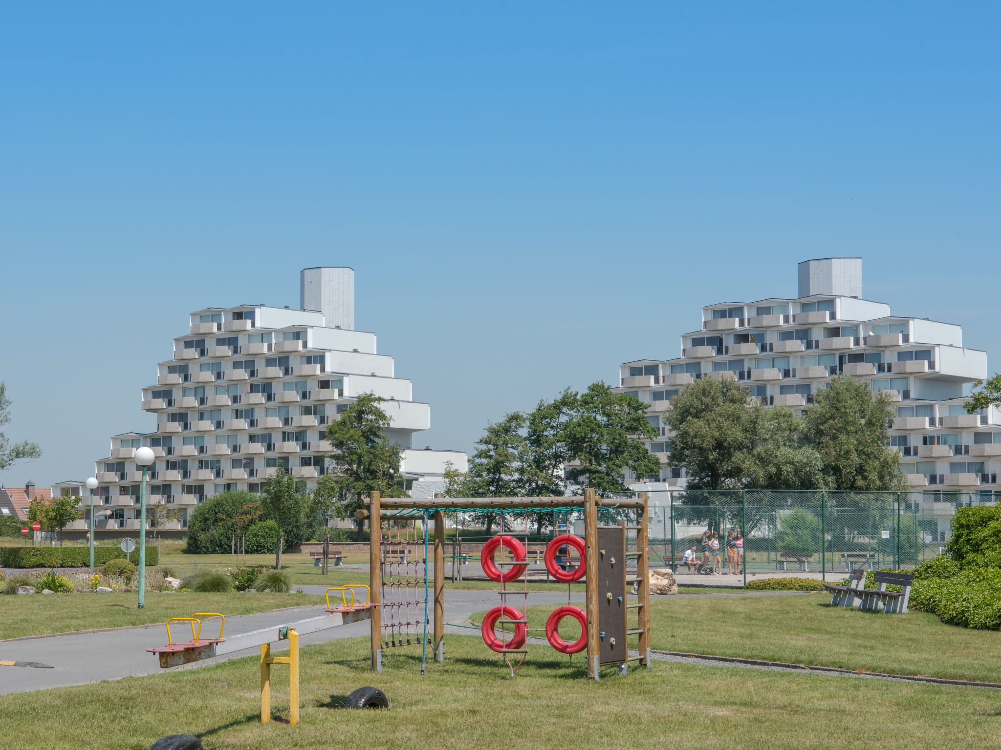 Kinderfreundliche Feriensiedlung "Mimosa", auf 8 Stockwerken, umgeben von Feldern. Am Ortsrand, 2 km vom Zentrum von De Haan, verkehrsberuhigte Zone, 1 km vom Meer, 1 km vom Strand. Zur Mitbenutzung: Grundstück 10 ha (eingezäunt). Tennis, Basketball, Boccia, Volleyballfeld, Grill, Kinderspielplatz. In der Anlage: Fahrstuhl. Parkplatz beim Haus. Supermarkt 3 km, Restaurant 500 m, Bäckerei 400 m, Straßenbahn "de Haan Vosseslag" 700 m, Bushaltestelle "Vosseslag" 700 m. Golfplatz 300 m. Nahe gelegene Sehenswürdigkeiten: Brugge 17 km, Plopsaland 50 km, Gent 65 km, Sea Life Marine Park 13 km, Hof Ter Meulen 4 km, ‘t Reigershof 5 km. Bitte beachten: Fahrstuhl nur bis 7. Stock.