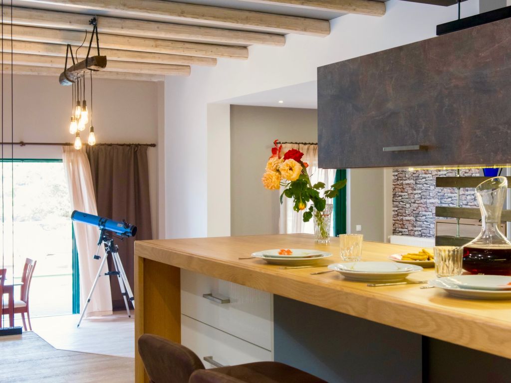 "Murtal", 4-Zimmer-Villa. Komfortabel und modern eingerichtet: grosses Wohn-/Esszimmer mit 2 Diwanbetten, Sat-TV, CD und Klimaanlage. Ausgang zum Schwimmbad. 1 Doppelzimmer mit 1 Doppelbett und Klimaanlage. Ausgang zur Terrasse. Grosse Küche (Backofen, 2 Glaskeramikherd Platten). Ausgang zum Garten. Bad. Obergeschoss: 2 Doppelzimmer, jedes Zimmer mit 1 Doppelbett, Bad und Klimaanlage. Ausgang zum Balkon. Holzböden. Gartengrill. Herrliche Panoramasicht auf das Meer, das Schwimmbad und die Landschaft. Zur Verfügung: Waschmaschine, Wäschetrockner, Bügeleisen, Kinderhochstuhl, Babybett. Geeignet für Familien. 1067411