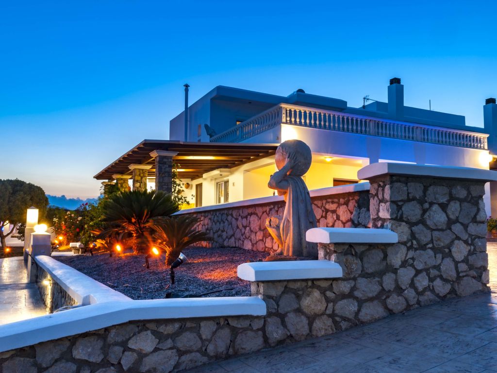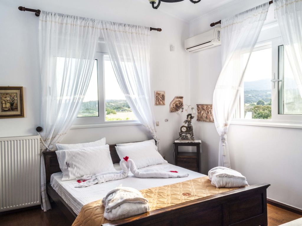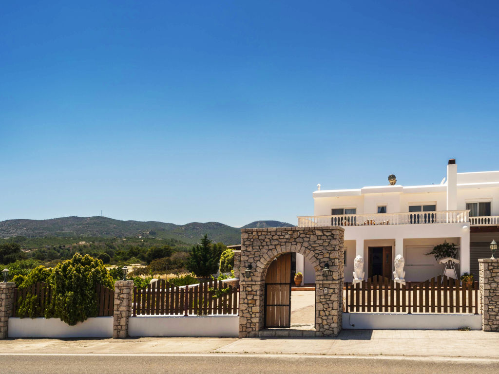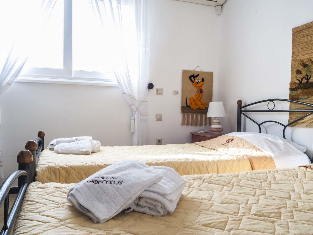 "Dionysus", 5-Zimmer-Villa 160 m2 auf 2 Stockwerken. Geräumig und hell, komfortabel und schön eingerichtet: offenes Wohn-/Esszimmer mit offenem Kamin und Sat-TV (Flachbildschirm), DVD. Ausgang zum Garten, zum Schwimmbad. 1 Doppelzimmer mit 1 Bett und 1 Doppelbett. 1 Doppelzimmer mit 1 Doppelbett. Offene Küche (Backofen, Geschirrspüler, 4 Glaskeramikherd Platten, Toaster, Wasserkocher, Mikrowelle, elektrische Kaffeemaschine) mit Esstisch. Bad/WC. Klimaanlage. Obergeschoss: (geländerlose Treppe) 1 Doppelzimmer mit 1 Doppelbett. Ausgang zum Balkon. 1 Doppelzimmer mit 2 Betten. Bad/WC. Klimaanlage. Grosser Balkon, grosse Terrasse teilweise überdacht. Gartengrill. Schöne Sicht auf das Meer und die Landschaft. Zur Verfügung: Waschmaschine, Safe, Bügeleisen, Haartrockner. Internet (Wireless LAN, gratis).