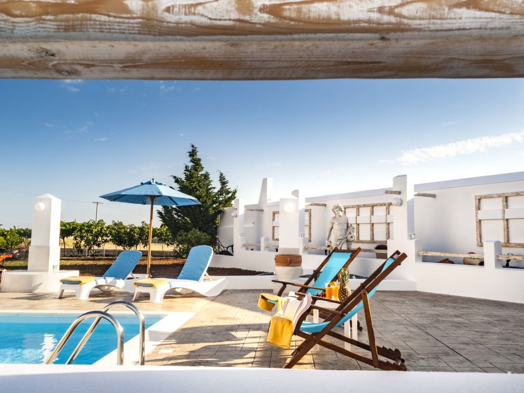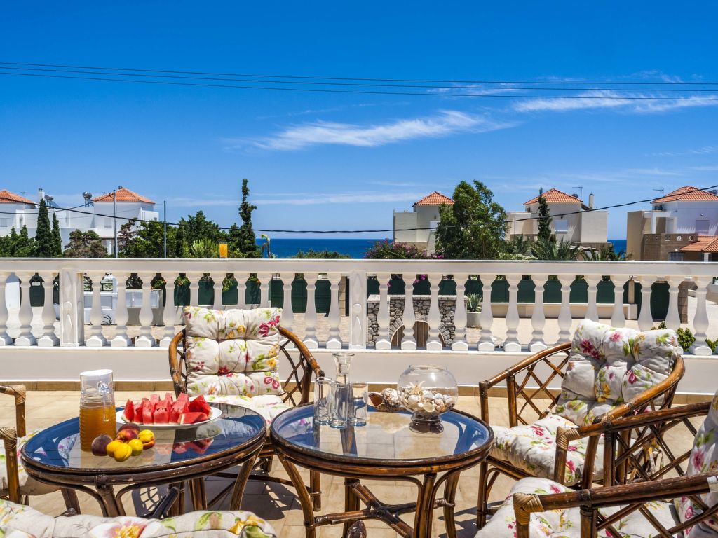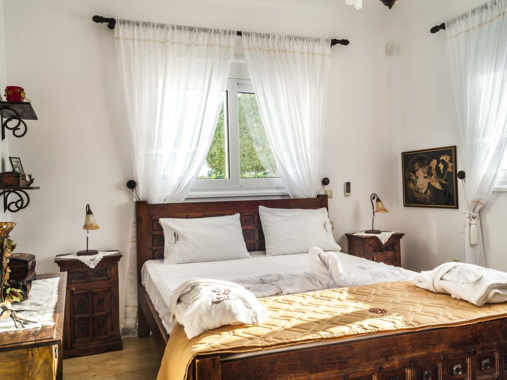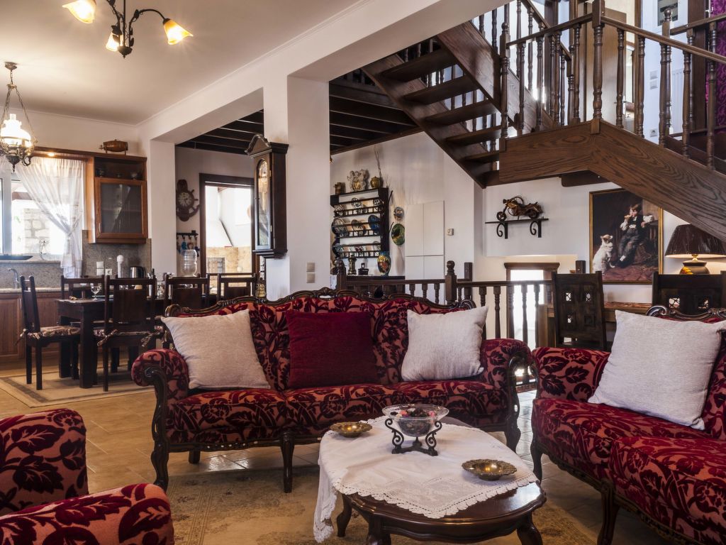 "Dionysus", 5-Zimmer-Villa 160 m2 auf 2 Stockwerken. Geräumig und hell, komfortabel und schön eingerichtet: offenes Wohn-/Esszimmer mit offenem Kamin und Sat-TV (Flachbildschirm), DVD. Ausgang zum Garten, zum Schwimmbad. 1 Doppelzimmer mit 1 Bett und 1 Doppelbett. 1 Doppelzimmer mit 1 Doppelbett. Offene Küche (Backofen, Geschirrspüler, 4 Glaskeramikherd Platten, Toaster, Wasserkocher, Mikrowelle, elektrische Kaffeemaschine) mit Esstisch. Bad/WC. Klimaanlage. Obergeschoss: (geländerlose Treppe) 1 Doppelzimmer mit 1 Doppelbett. Ausgang zum Balkon. 1 Doppelzimmer mit 2 Betten. Bad/WC. Klimaanlage. Grosser Balkon, grosse Terrasse teilweise überdacht. Gartengrill. Schöne Sicht auf das Meer und die Landschaft. Zur Verfügung: Waschmaschine, Safe, Bügeleisen, Haartrockner. Internet (Wireless LAN, gratis).