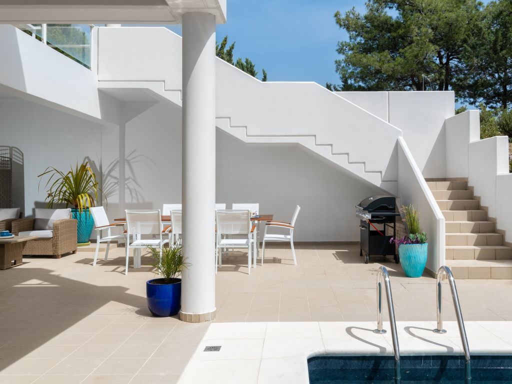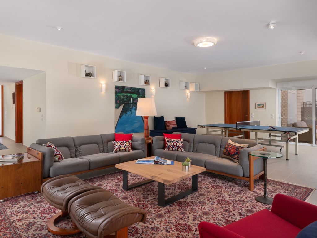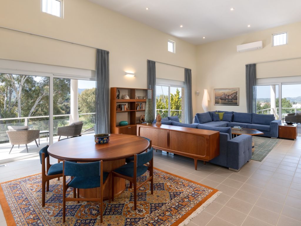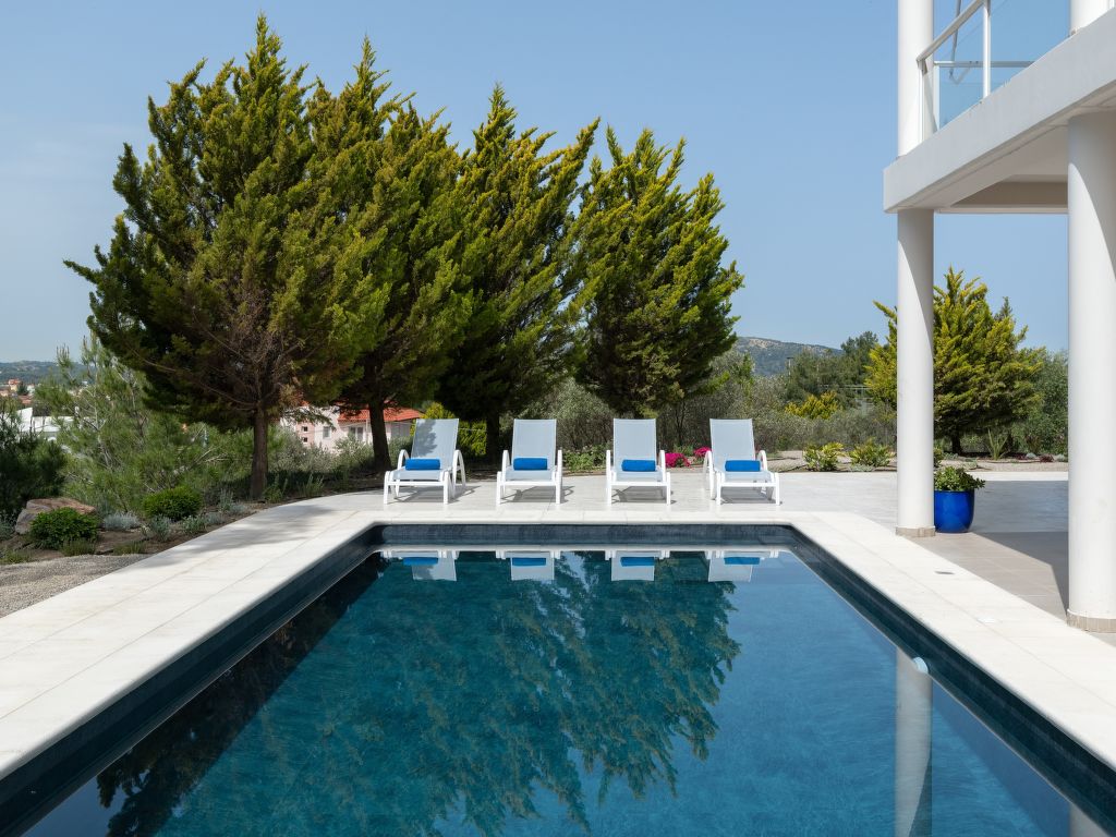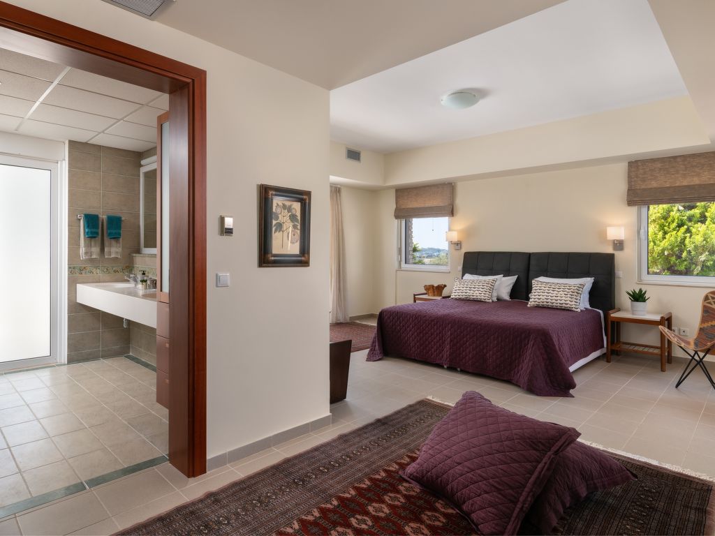 "Hill Top", 5-Zimmer-Villa 400 m2 auf 2 Stockwerken. Geräumig und hell, komfortabel und schön eingerichtet: offenes Wohn-/Esszimmer mit Esstisch und Sat-TV (Flachbildschirm), Radio. Ausgang zum Garten, zum Schwimmbad. 1 Doppelzimmer mit 2 Betten, 1 Doppelbett und Dusche/WC. Ausgang zum Garten. 1 Doppelzimmer mit 3 Betten und Dusche/WC. Ausgang zum Garten. Offene Küche (Backofen, Geschirrspüler, 4 Flammen, Toaster, Wasserkocher, Mikrowelle, elektrische Kaffeemaschine). Klimaanlage. Obergeschoss: (geländerlose Treppe) 1 Doppelzimmer mit 1 Doppelbett und Dusche/WC. Ausgang zum Balkon. 1 Doppelzimmer mit 3 Betten und Dusche/WC. Ausgang zum Balkon. Klimaanlage. 2 grosse Balkone. Gartengrill. Schöne Sicht auf die Landschaft. Zur Verfügung: Waschmaschine, Wäschetrockner, Safe, Bügeleisen, Haartrockner. Internet (Wireless LAN, gratis).