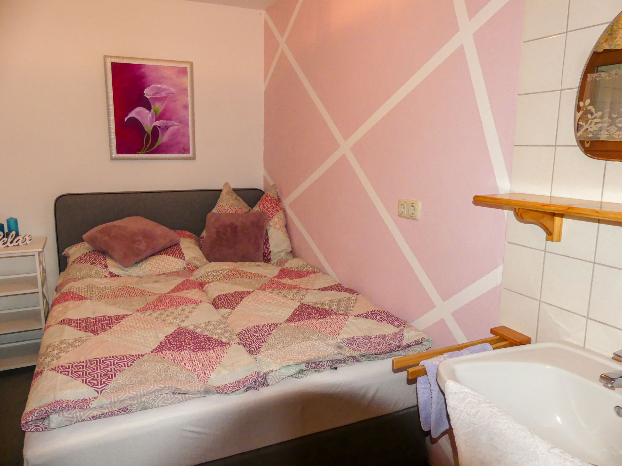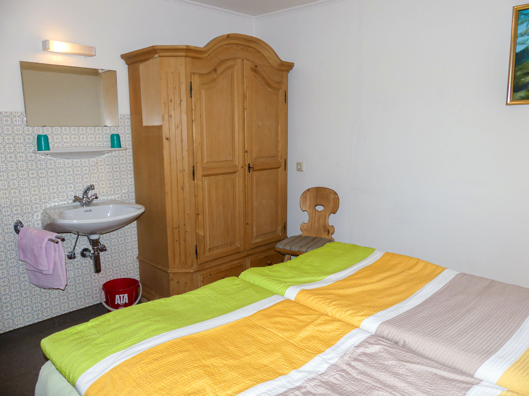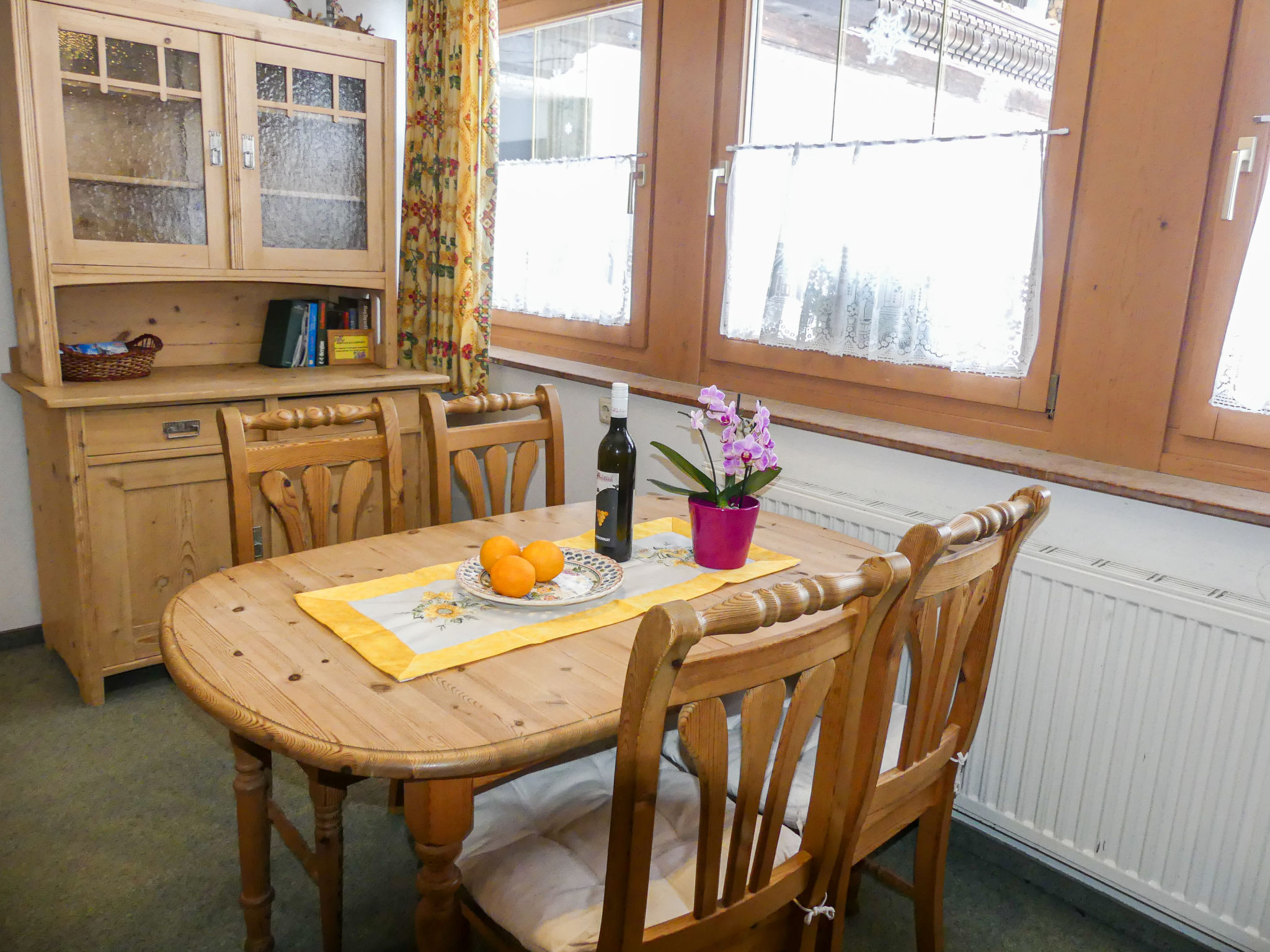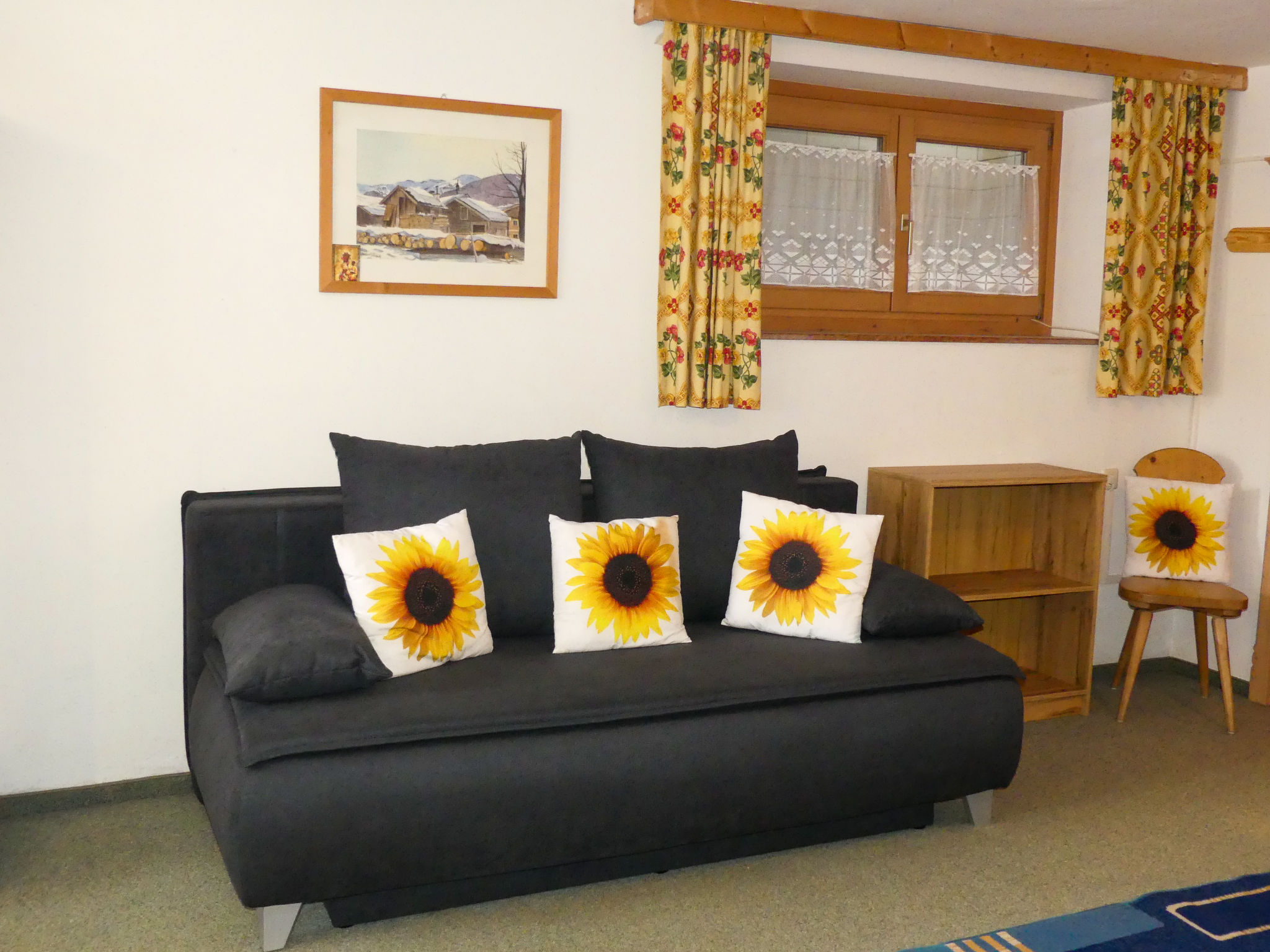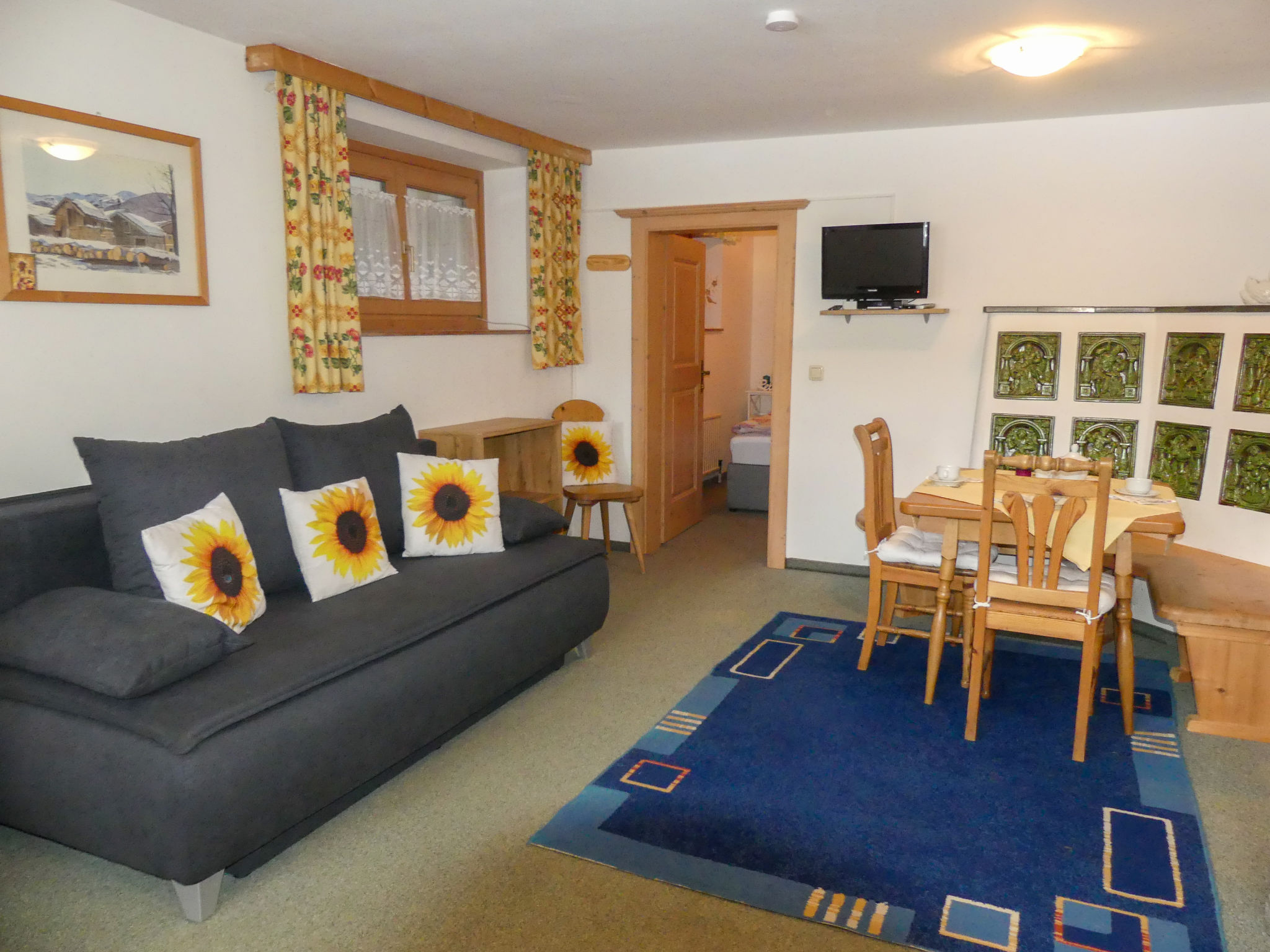"Eusch (SLB340)", 3-Zimmer-Wohnung 60 m2, im Erdgeschoss. Gemütlich eingerichtet: Wohn-/Schlafzimmer mit 1 Doppeldiwanbett, Esstisch, Sat-TV und Kachelofen. 1 Zimmer mit 1 franz. Bett (140 cm), Waschbecken. 1 Zimmer mit 1 Doppelbett und Waschbecken. Offene Küche (4 Kochplatten, Backofen, Geschirrspüler, Toaster, Wasserkocher, Mikrowelle, elektrische Kaffeemaschine). Dusche/WC, sep. WC. Heizung. Teppichboden. Bitte beachten: ein Doppelzimmer liegt außerhalb der Wohnung. Nichtraucher-Unterkunft. 3-Zimmer-Wohnung, Erdgeschoss/Untergeschoss (Hanglage), ca. 60 m². Wohn-/Schlafraum mit Doppelbettcouch, Sitzecke mit Kachelofen, Essplatz und Küchenzeile (4 Platten, Backofen, Mikrowelle, Geschirrspüler, Kühlschrank, Kaffeemaschine, Toaster, Wasserkocher). Schlafzimmer mit franz. Bett (140cm breit) und Waschbecken. Dusche/WC. Neben der Wohnung separates Doppelzimmer mit Waschbecken. 50625-000155-2020