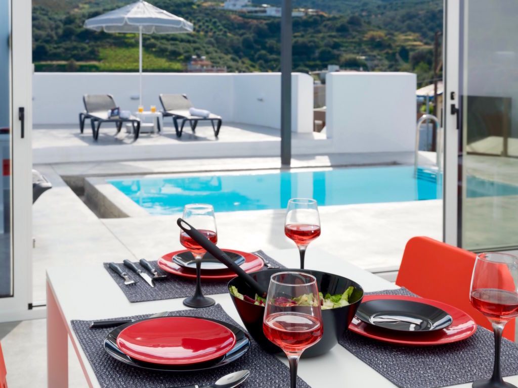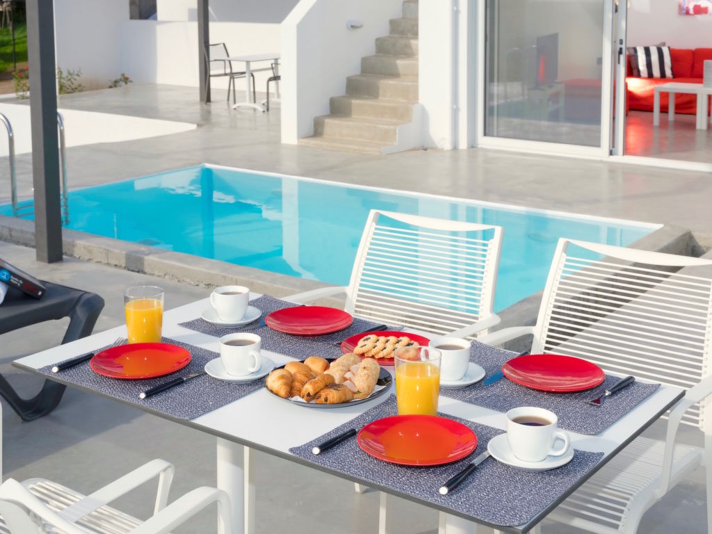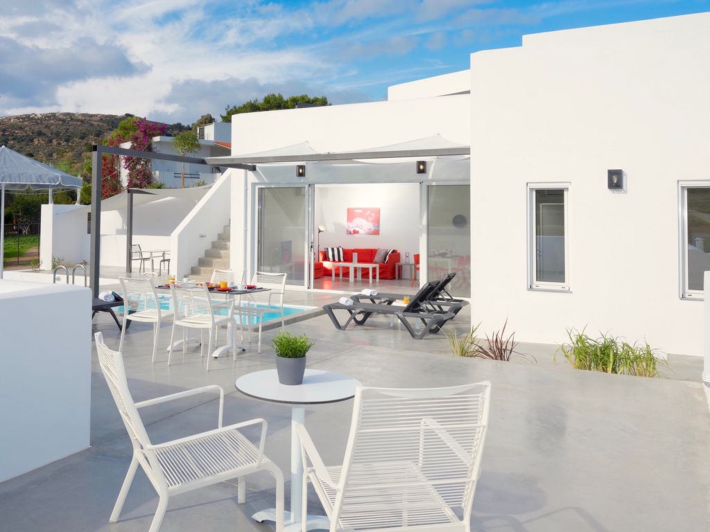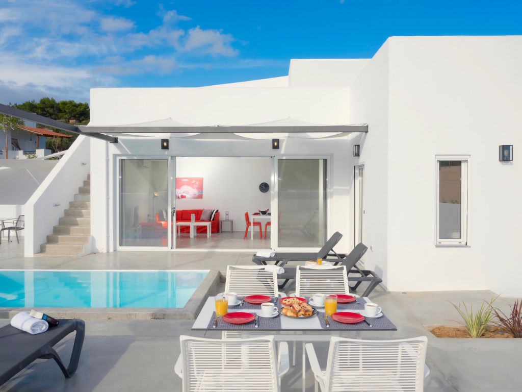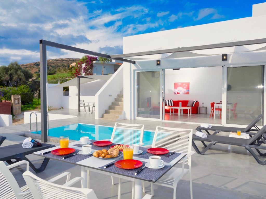 Sehr moderne, einfache Villa "Paradiso III", einseitig angebaut, Baujahr 2019. Im Ort, 400 m vom Zentrum von Agia Pelagia, ruhige, sonnige Lage, 500 m vom Strand. Zur Alleinbenutzung: kleiner, schöner Garten mit Blumen und Bäumen, Schwimmbad (20 m2, 150 cm tief, 01.04.-31.10.). Aussendusche, Terrasse, Grill. Wäschewechsel 2 mal wöchentlich. Handtuchwechsel 2 mal wöchentlich. Wohnungsreinigung 2 mal wöchentlich. Öffentliche Parkplätze 10 m auf der Strasse. Supermarkt 400 m, Restaurant, Bar 500 m, Sandstrand "Agia Pelagia beach" 500 m. Golfplatz (18 Loch) 48 km. Nahe gelegene Sehenswürdigkeiten: El Greco Museum 10 km, Heraklion Archaeological Museum 23 km, Koules Fortress 25 km. Bitte beachten: Fahrzeug empfohlen. Babyausstattung auf Anfrage (inkl.). Jugendgruppen nur auf Anfrage. In diesem Haus sind weitere Ferienwohnungen mietbar. Ferienwohnung Ref. GR6006.9.1 befindet sich auf dem gleichen Grundstück. In dieser Anlage zusätzlich mietbar: 3 Häuser.