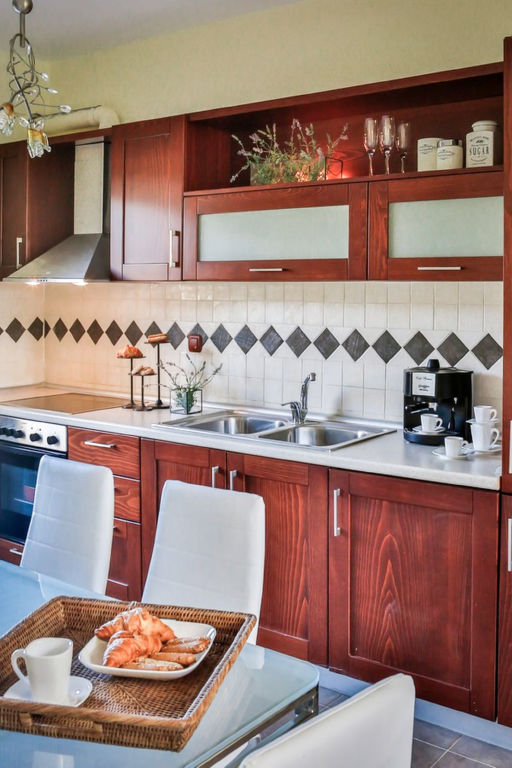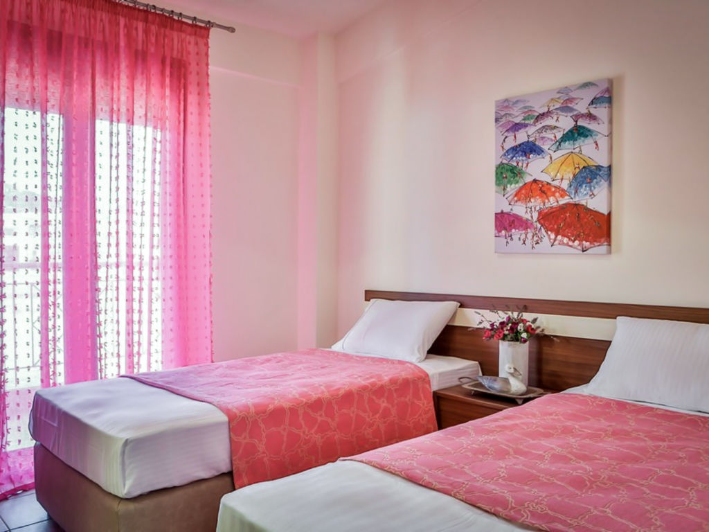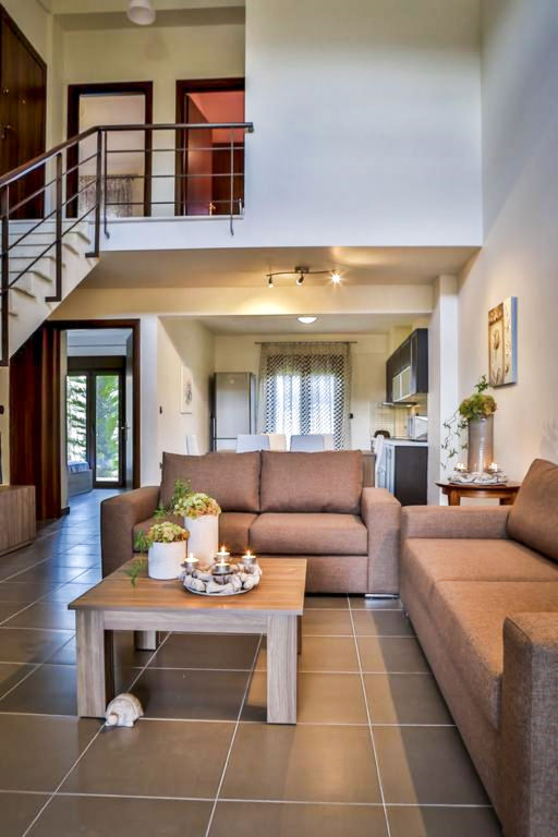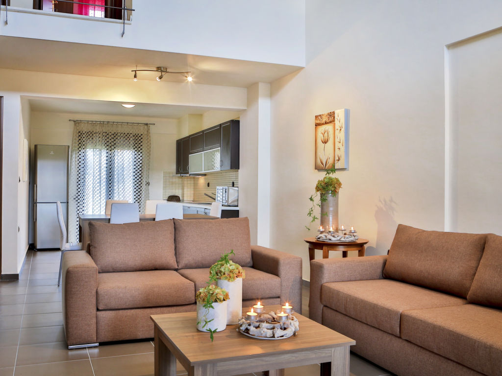 "Nefeli Villa", 4-Zimmer-Villa 110 m2 auf 2 Stockwerken. Geräumig und hell, komfortabel und modern eingerichtet: 1 grosses Zimmer mit 1 Doppelbett. Grosses Wohn-/Esszimmer mit Esstisch und Sat-TV (Flachbildschirm), CD und Klimaanlage. Ausgang zum Garten. Offene Küche (Backofen, Geschirrspüler, 4 Glaskeramikherd Platten, Mikrowelle, elektrische Kaffeemaschine). Bad/WC. Klimaanlage. Obergeschoss: (geländerlose Treppe) 1 grosses Zimmer mit 1 Doppelbett und Klimaanlage. 1 grosses Zimmer mit 2 Betten und Klimaanlage. Dusche/WC. Terrasse, Garten 300 m2. Terrassenmöbel. Schöne Sicht auf den Garten. Zur Verfügung: Waschmaschine, Safe, Bügeleisen, Haartrockner. Internet (Wireless LAN, gratis). Bitte beachten: geeignet für Familien. Nichtraucher-Haus. Maximal 1 Haustier/Hund erlaubt. 0938K91000712101