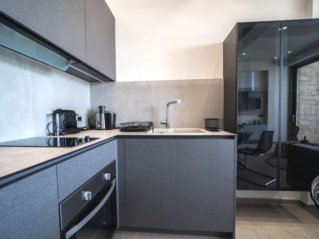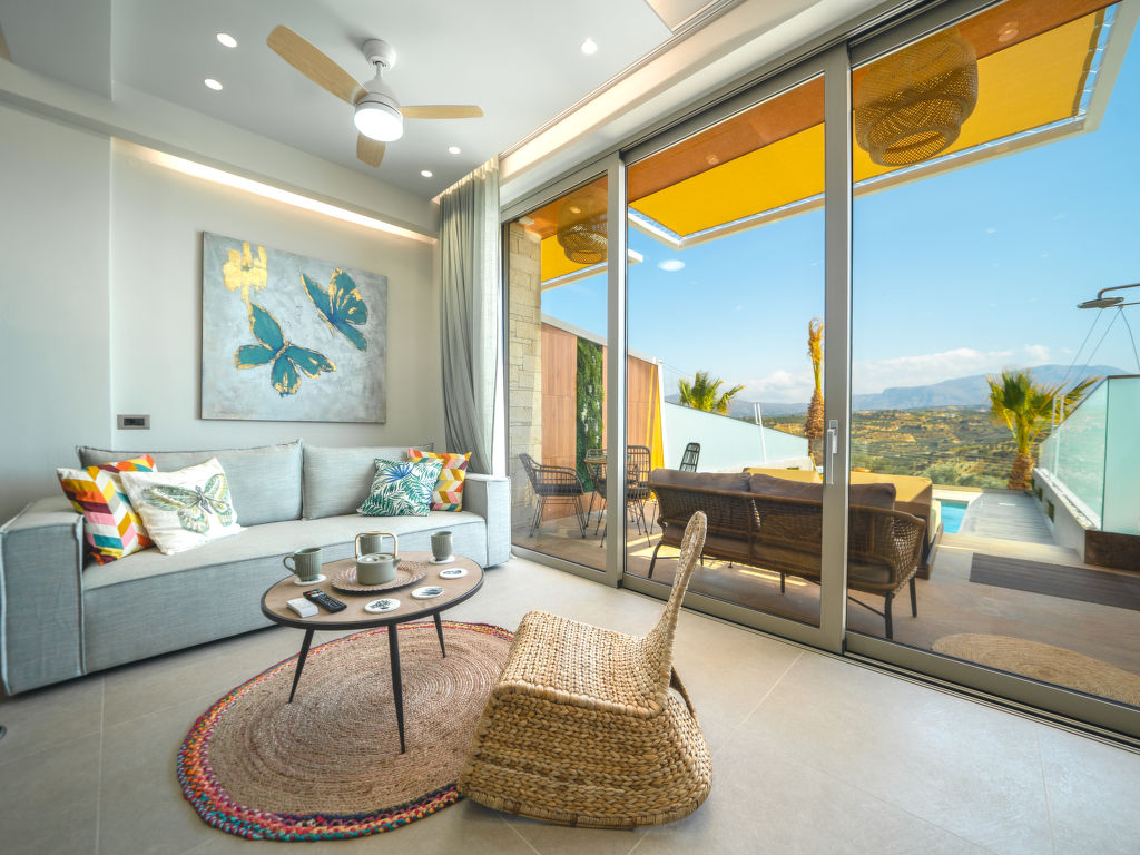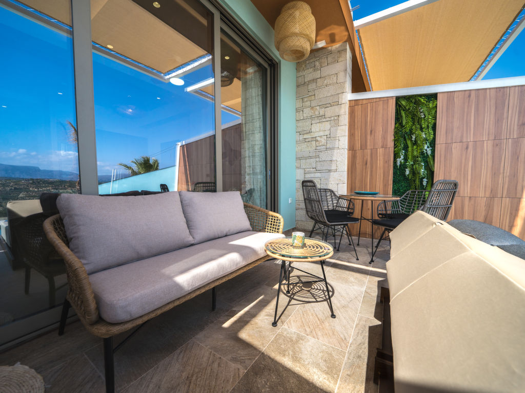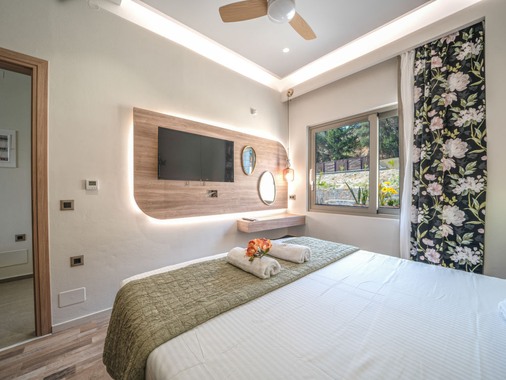 "Oleas Luxury Suite Venus", 2-Zimmer-Bungalow 60 m2. Geräumig und hell, sehr modern eingerichtet: offenes Wohn-/Schlafzimmer mit Schiebetür mit 2 Diwanbetten und Sat-TV (Flachbildschirm). Ausgang zur Terrasse, zum Schwimmbad. 1 Doppelzimmer mit 1 Doppelbett und Sat-TV (Flachbildschirm), Klimaanlage. Offene Küche (2 Glaskeramikherd Platten, Wasserkocher, Mikrowelle, elektrische Kaffeemaschine). Dusche/WC. Terrassenmöbel, Gartengrill (mobil). Schöne Sicht auf das Schwimmbad und die Landschaft. Zur Verfügung: Haartrockner. Internet (Wireless LAN, gratis). Bitte beachten: Nichtraucher-Haus. Rauchmelder, Feuerlöscher. 1218167