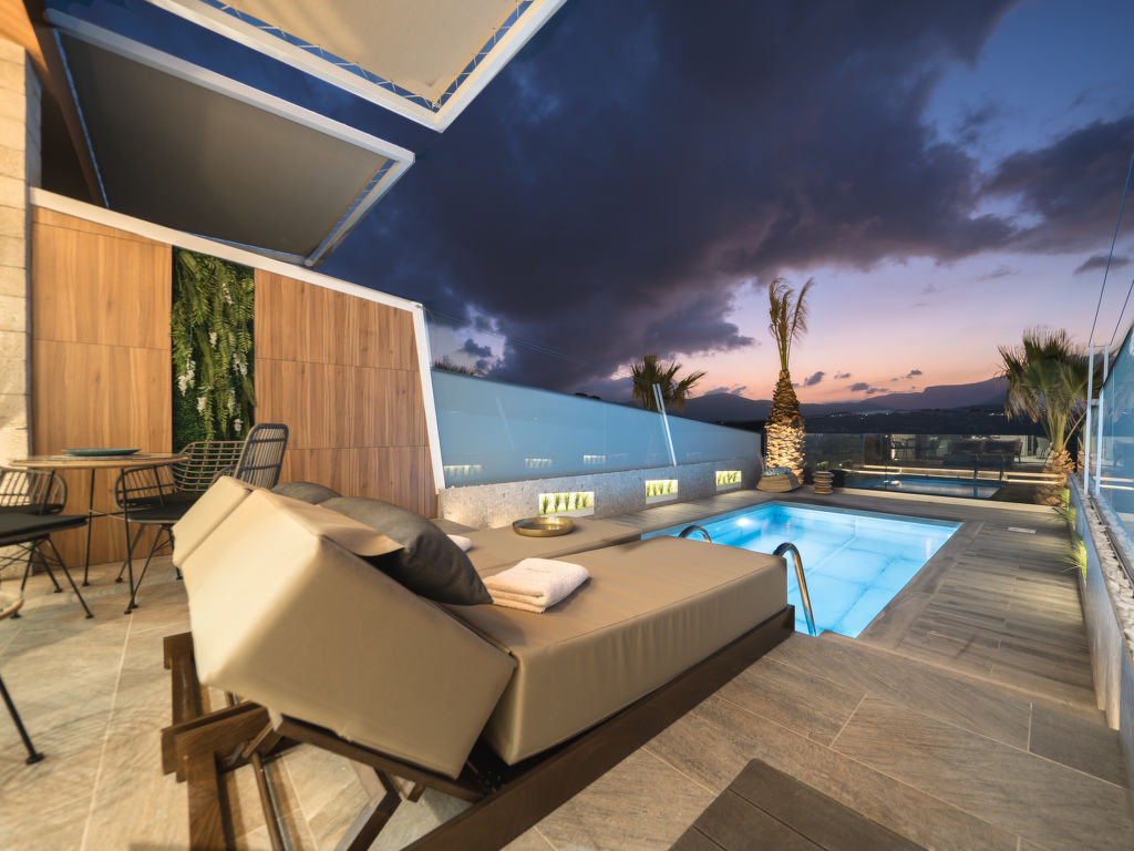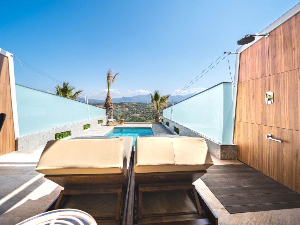 Voutes 9 km von Heraklion: Sehr moderner Bungalow "Oleas Luxury Suite Venus", Baujahr 2021, umgeben von Bäumen. Am Ortsrand, 9 km vom Zentrum von Heraklion, ruhige, sonnige Lage im Villenviertel, 8 km vom Meer, 8 km vom Strand. Zur Alleinbenutzung: Grundstück (eingezäunt), Schwimmbad (3 x 5 m, 145 - 150 cm tief, 01.04.-31.10.). Aussendusche. Wäschewechsel 2 mal wöchentlich. Handtuchwechsel 2 mal wöchentlich. Wohnungsreinigung 2 mal wöchentlich (inkl.). Parkplatz (für 2 Autos) beim Haus. Lebensmittelgeschäft 2 km, Supermarkt 9 km, Einkaufszentrum 9 km, Restaurant 2 km, Bar 6 km, Bäckerei 2 km, Café 5 km, Sandstrand "Ammoudara" 8 km. Golfplatz (18 Loch) 45 km, Tennis 9 km. Nahe gelegene Sehenswürdigkeiten: Watersports 8 km, Archaeological Museum Heraklion 9 km, Knossos Palace 12 km, Historical Center Heraklion 9 km. Bitte beachten: Fahrzeug empfohlen. Nicht geeignet für Kinder unter 12 Jahren. Jugendgruppen nur auf Anfrage. In diesem Haus sind weitere Ferienwohnungen mietbar.