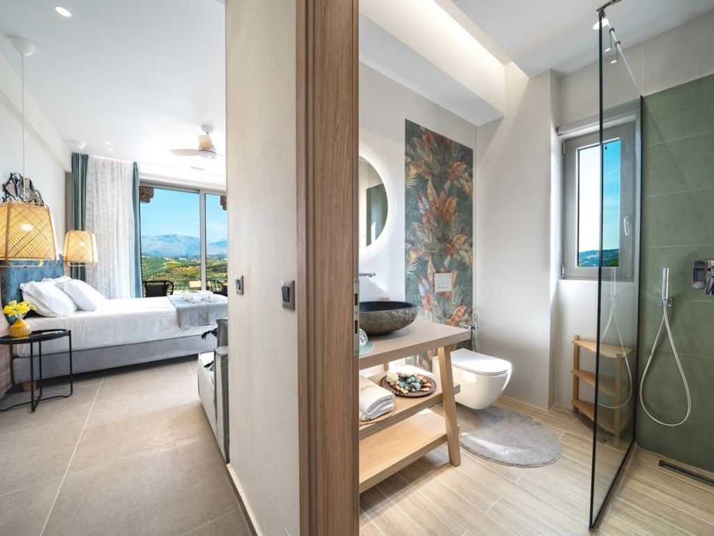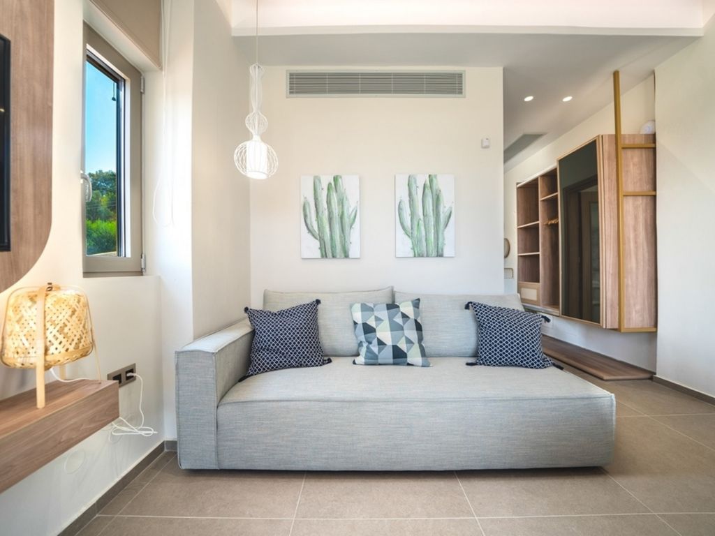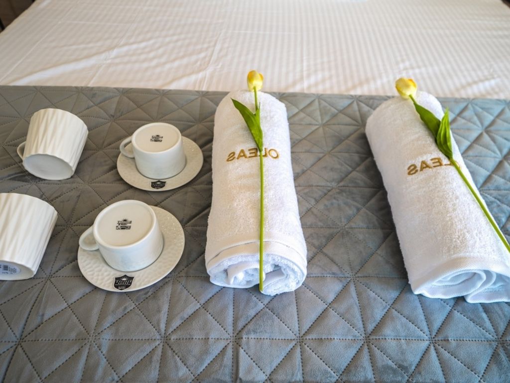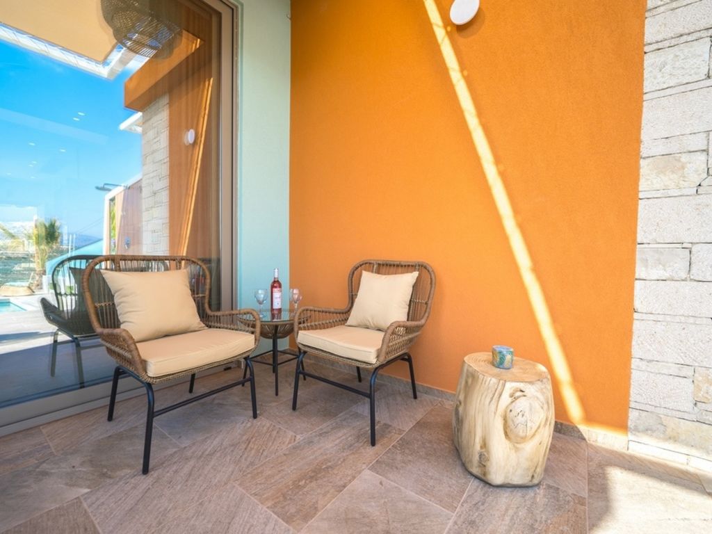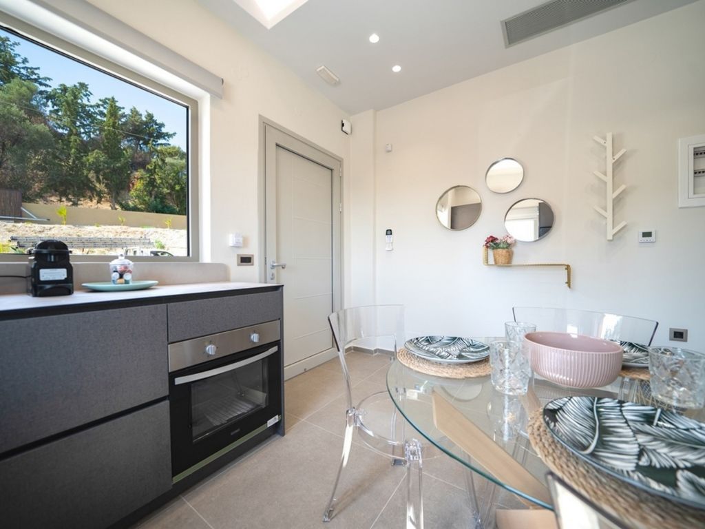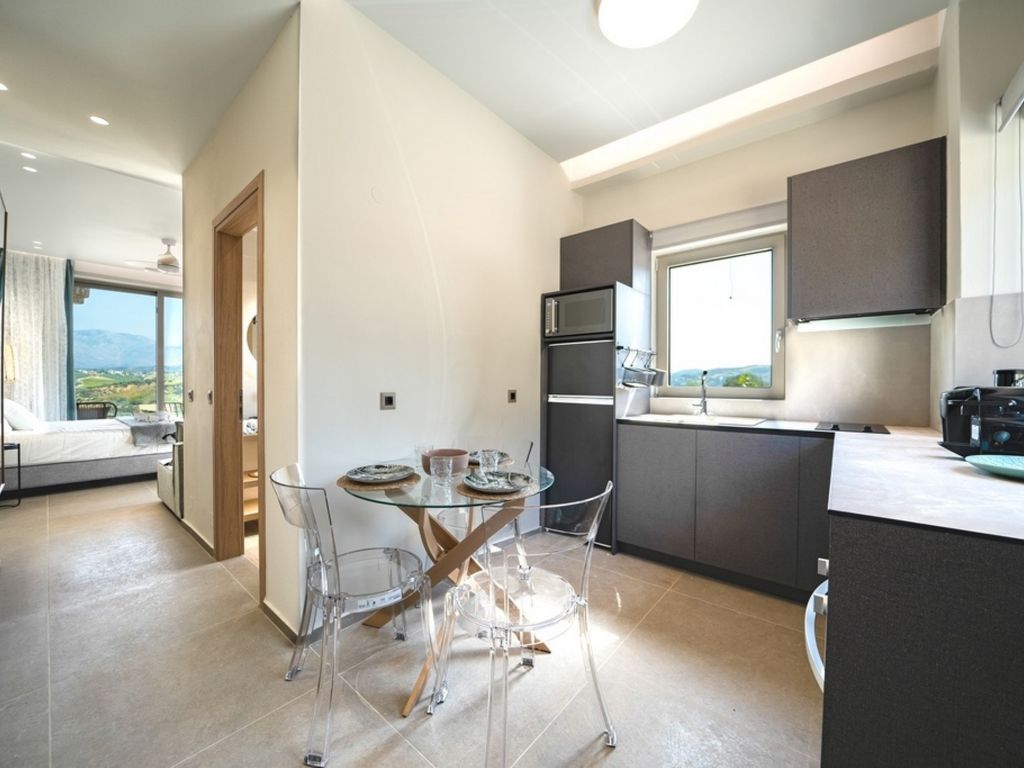 "Oleas Luxury Suite Moon", 1-Zimmer-Studio 40 m2. Geräumig und hell, sehr modern eingerichtet: offenes Wohn-/Schlafzimmer mit Schiebetür mit 1 Diwanbett, 1 Doppelbett und Sat-TV (Flachbildschirm), Klimaanlage. Ausgang zur Terrasse, zum Schwimmbad. Offene Küche (Backofen, 2 Glaskeramikherd Platten, Toaster, Wasserkocher, Mikrowelle, elektrische Kaffeemaschine) mit Esstisch. Dusche/WC. Terrassenmöbel, Gartengrill (mobil), Sitzplatz. Schöne Sicht auf das Schwimmbad und die Landschaft. Zur Verfügung: Safe, Haartrockner. Internet (Wireless LAN, gratis). Bitte beachten: Nichtraucher-Haus. Rauchmelder, Feuerlöscher. 1218167