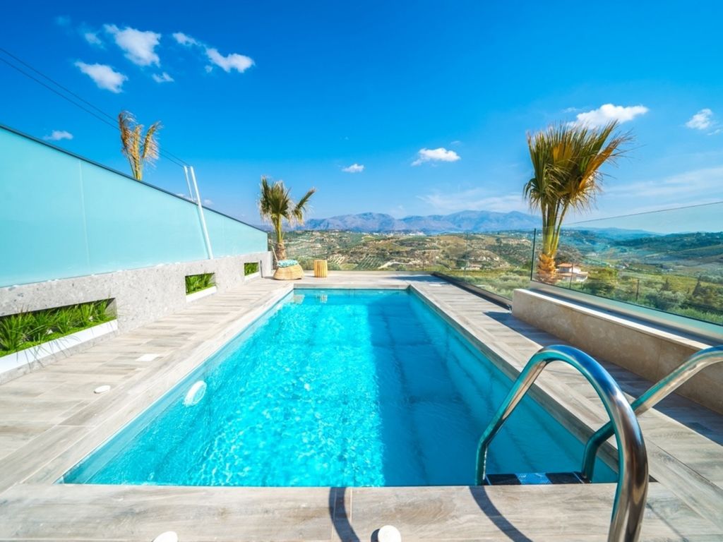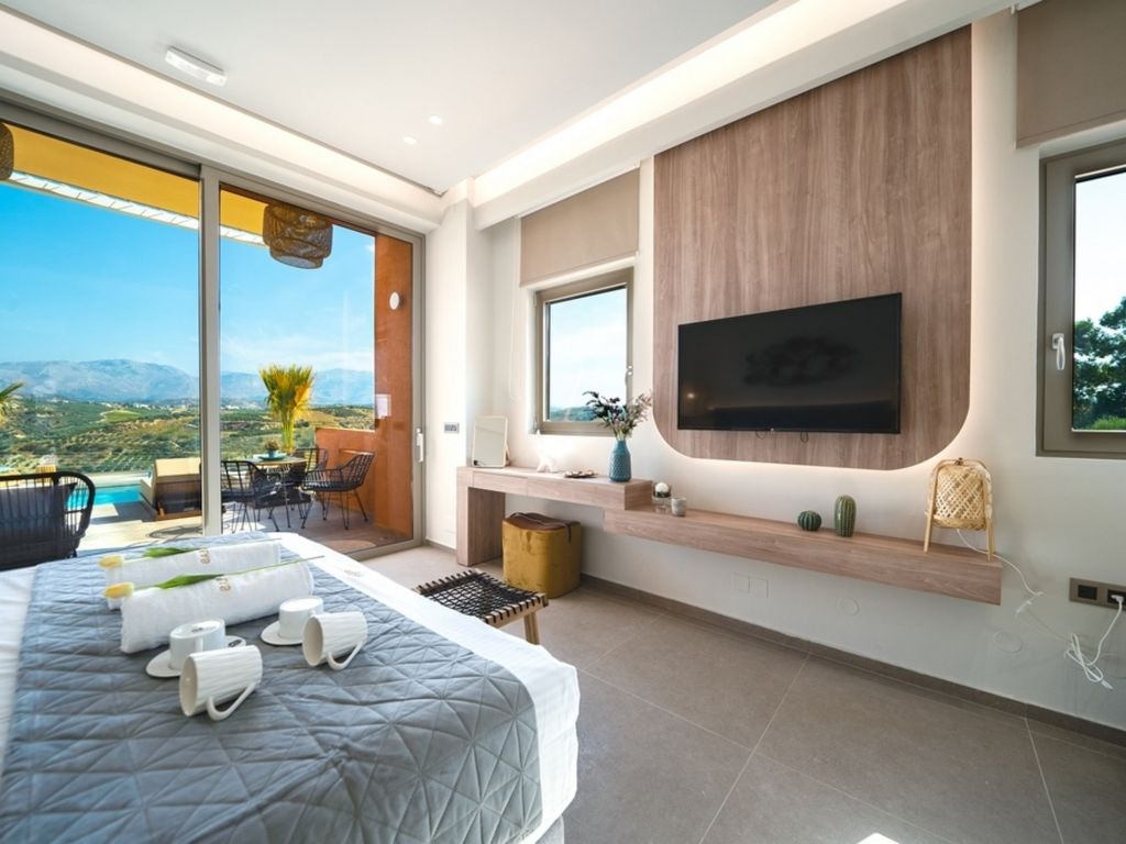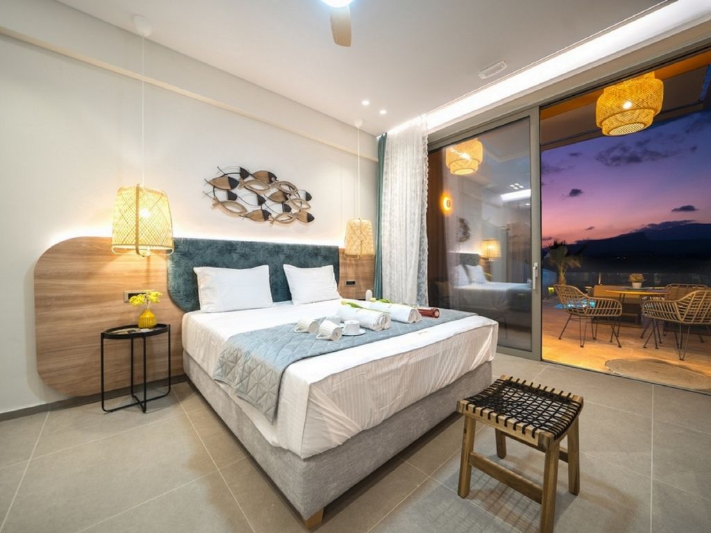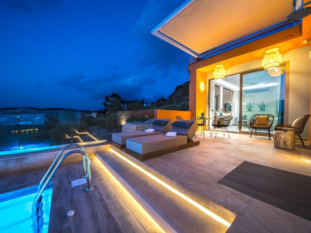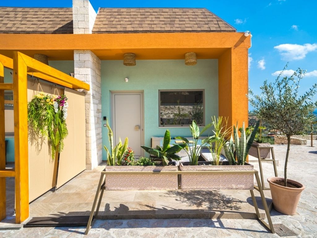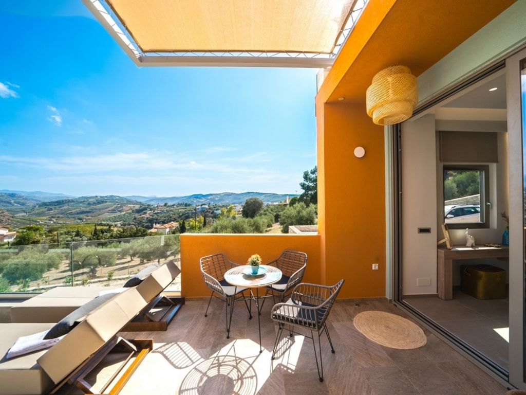 "Oleas Luxury Suite Moon", 1-Zimmer-Studio 40 m2. Geräumig und hell, sehr modern eingerichtet: offenes Wohn-/Schlafzimmer mit Schiebetür mit 1 Diwanbett, 1 Doppelbett und Sat-TV (Flachbildschirm), Klimaanlage. Ausgang zur Terrasse, zum Schwimmbad. Offene Küche (Backofen, 2 Glaskeramikherd Platten, Toaster, Wasserkocher, Mikrowelle, elektrische Kaffeemaschine) mit Esstisch. Dusche/WC. Terrassenmöbel, Gartengrill (mobil), Sitzplatz. Schöne Sicht auf das Schwimmbad und die Landschaft. Zur Verfügung: Safe, Haartrockner. Internet (Wireless LAN, gratis). Bitte beachten: Nichtraucher-Haus. Rauchmelder, Feuerlöscher. 1218167
