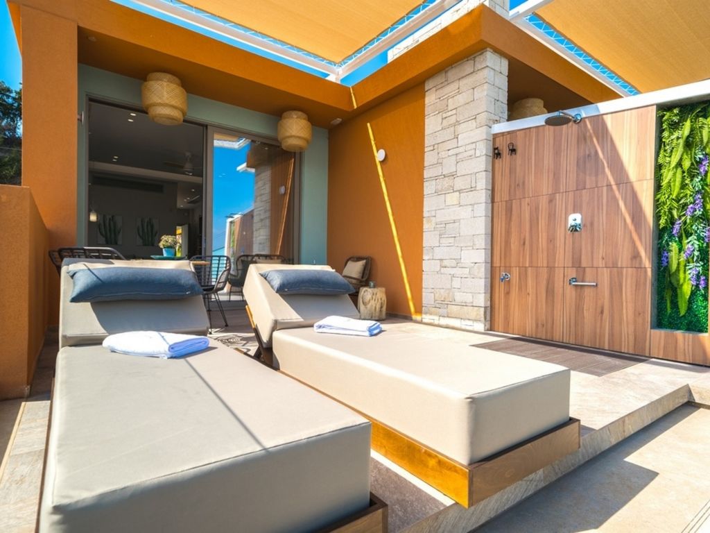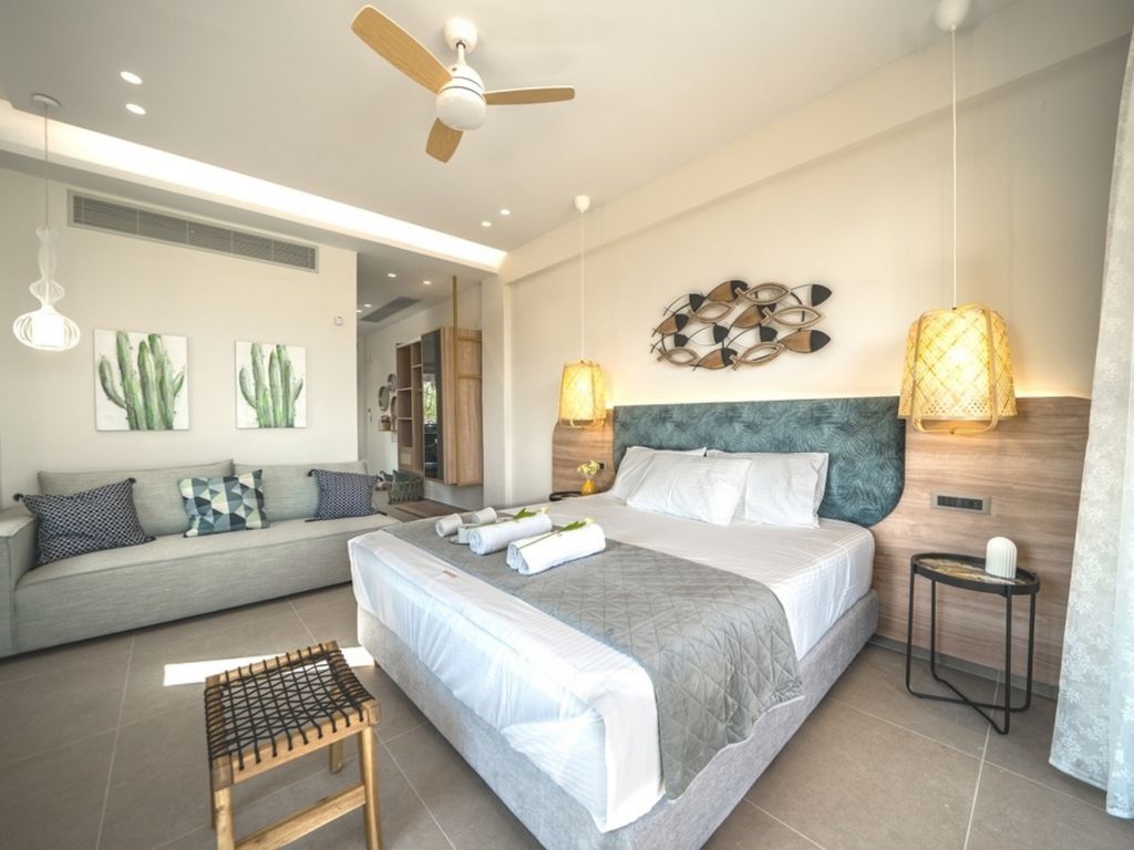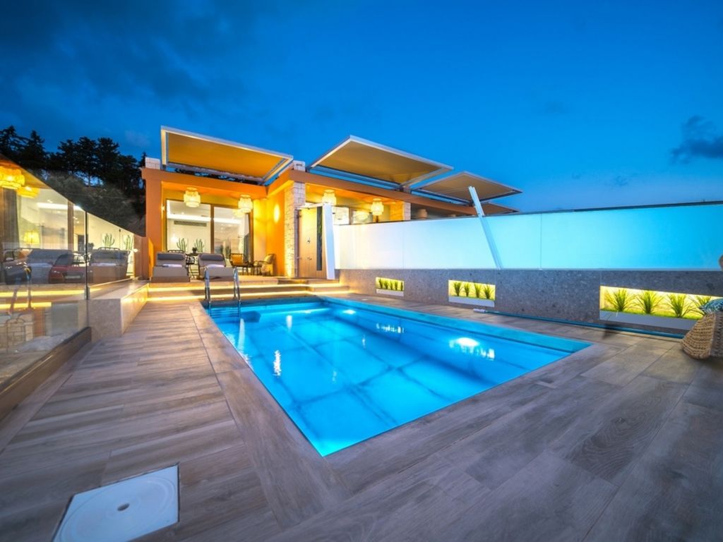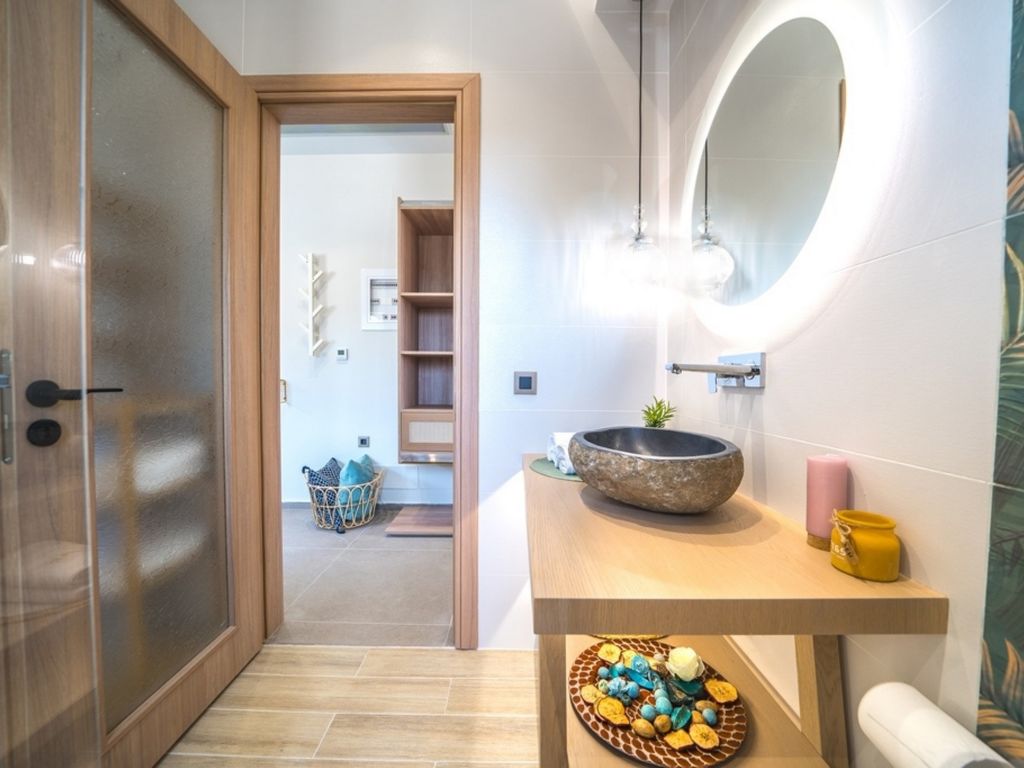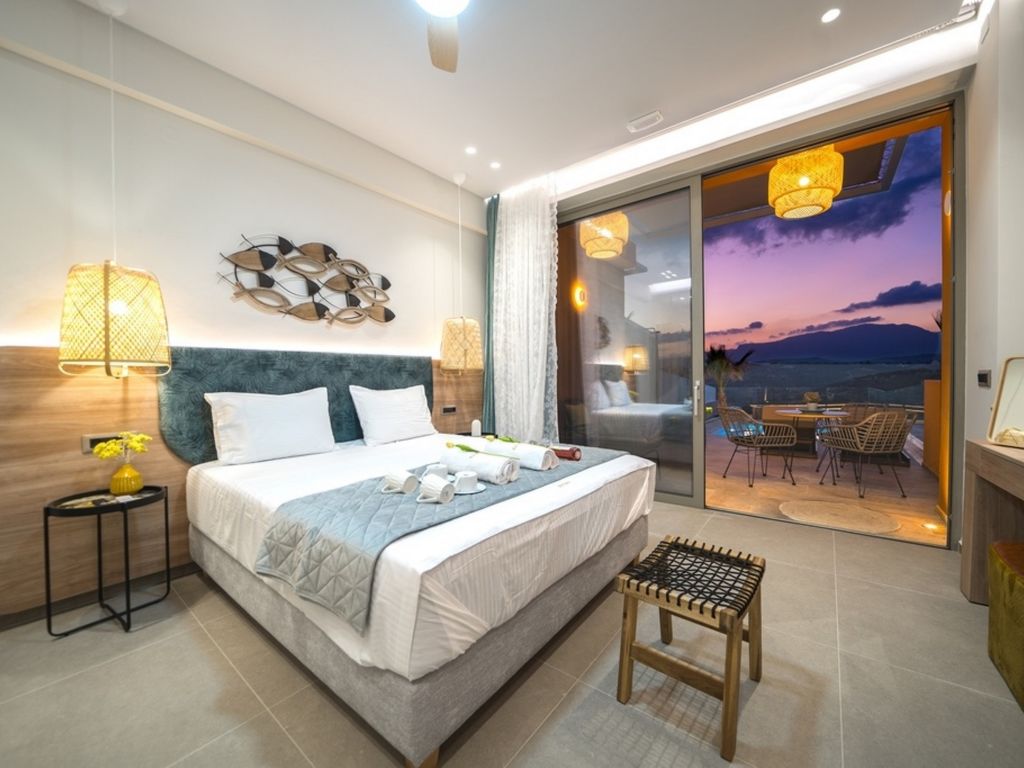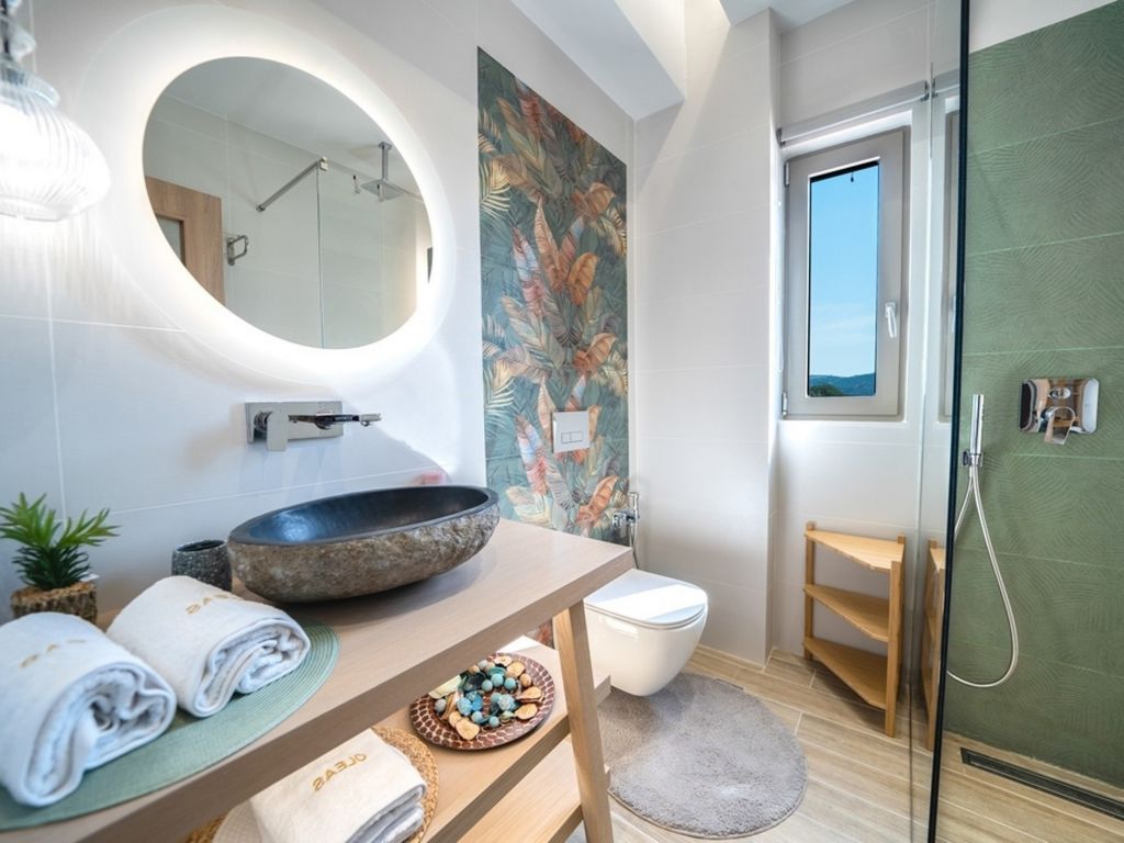 "Oleas Luxury Suite Moon", 1-Zimmer-Studio 40 m2. Geräumig und hell, sehr modern eingerichtet: offenes Wohn-/Schlafzimmer mit Schiebetür mit 1 Diwanbett, 1 Doppelbett und Sat-TV (Flachbildschirm), Klimaanlage. Ausgang zur Terrasse, zum Schwimmbad. Offene Küche (Backofen, 2 Glaskeramikherd Platten, Toaster, Wasserkocher, Mikrowelle, elektrische Kaffeemaschine) mit Esstisch. Dusche/WC. Terrassenmöbel, Gartengrill (mobil), Sitzplatz. Schöne Sicht auf das Schwimmbad und die Landschaft. Zur Verfügung: Safe, Haartrockner. Internet (Wireless LAN, gratis). Bitte beachten: Nichtraucher-Haus. Rauchmelder, Feuerlöscher. 1218167