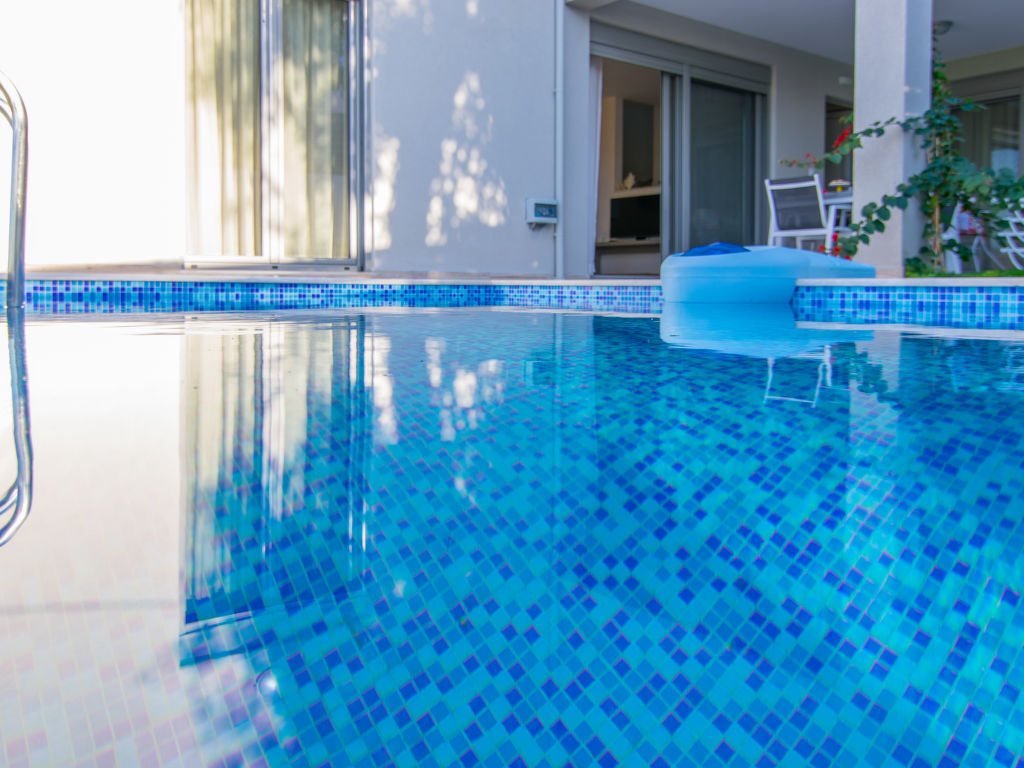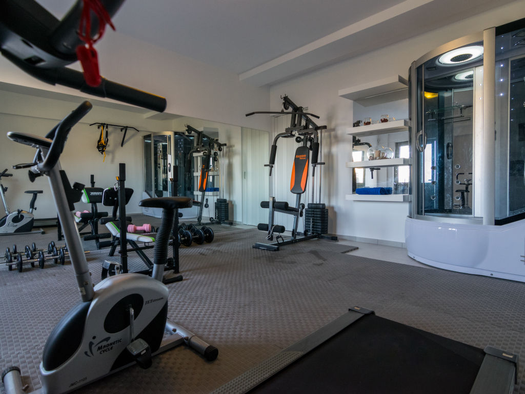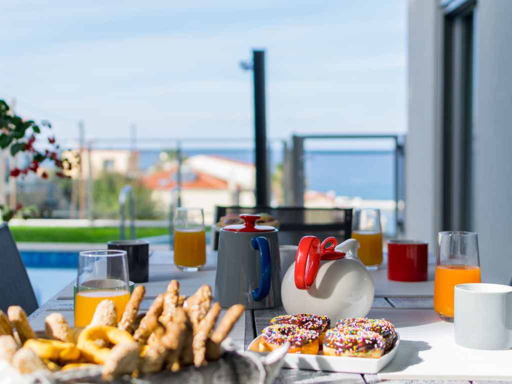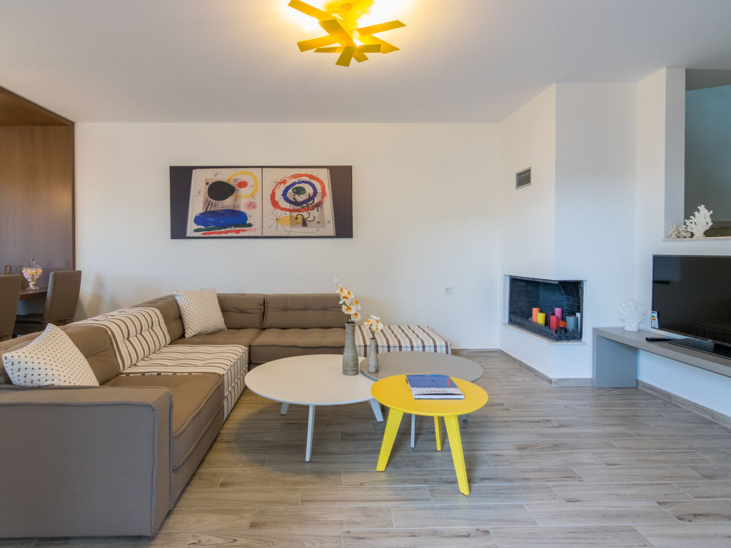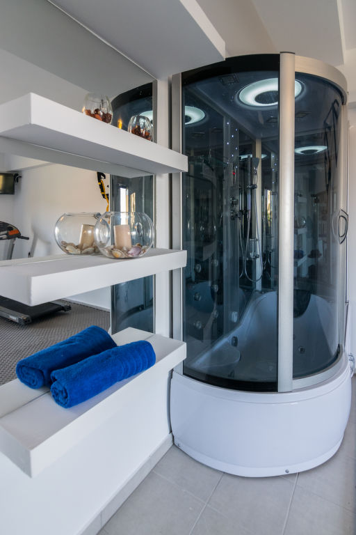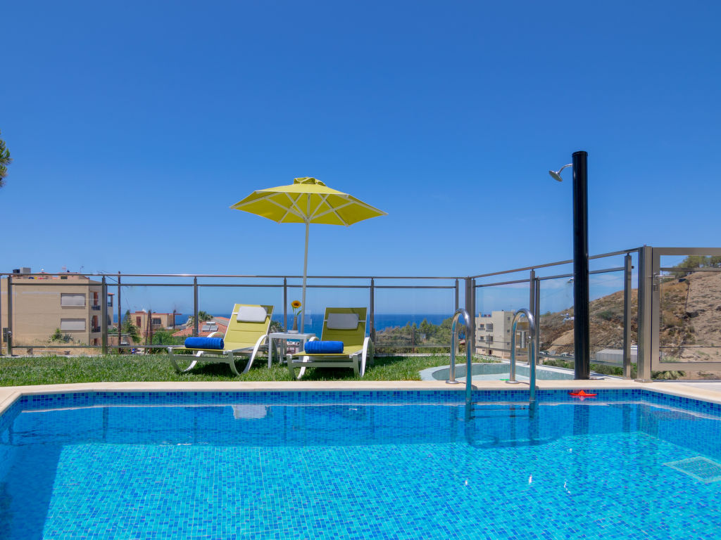 "Helianthos", 5-Zimmer-Villa 147 m2 auf 3 Stockwerken. Geräumig und hell, komfortabel und modern eingerichtet: offenes Wohnzimmer mit offenem Kamin und Sat-TV (Flachbildschirm), Radio. Ausgang zum Garten, zum Schwimmbad. 1 Doppelzimmer mit 1 Doppelbett, Dusche/WC und Sat-TV (Flachbildschirm). Ausgang zum Garten. Offene Küche (Backofen, Geschirrspüler, 4 Glaskeramikherd Platten, Mikrowelle, elektrische Kaffeemaschine) mit Esstisch. Klimaanlage. Unteres Geschoss: (geländerlose Treppe) 1 Zimmer mit Hydromassage-Dusche. Obergeschoss: (geländerlose Treppe) 1 Doppelzimmer mit 1 Doppelbett, Dusche/WC und Sat-TV (Flachbildschirm). Ausgang zum Balkon. 1 Doppelzimmer mit 2 Betten, Dusche/WC und Sat-TV (Flachbildschirm). Ausgang zum Balkon. Klimaanlage. 2 Balkone. Gartengrill. Schöne Sicht auf das Meer. Zur Verfügung: Waschmaschine, Wäschetrockner, Safe, Bügeleisen, Haartrockner. Internet (Wireless LAN, gratis). Bitte beachten: geeignet für Familien. Nichtraucher-Haus. 1041 K910 0315 7801