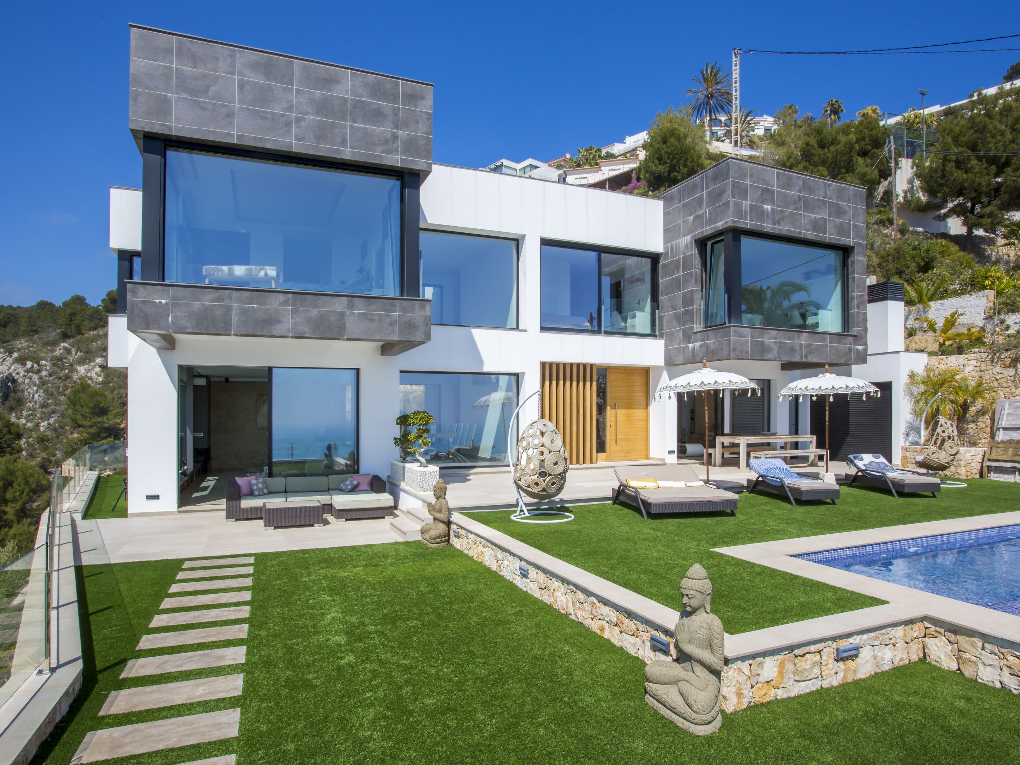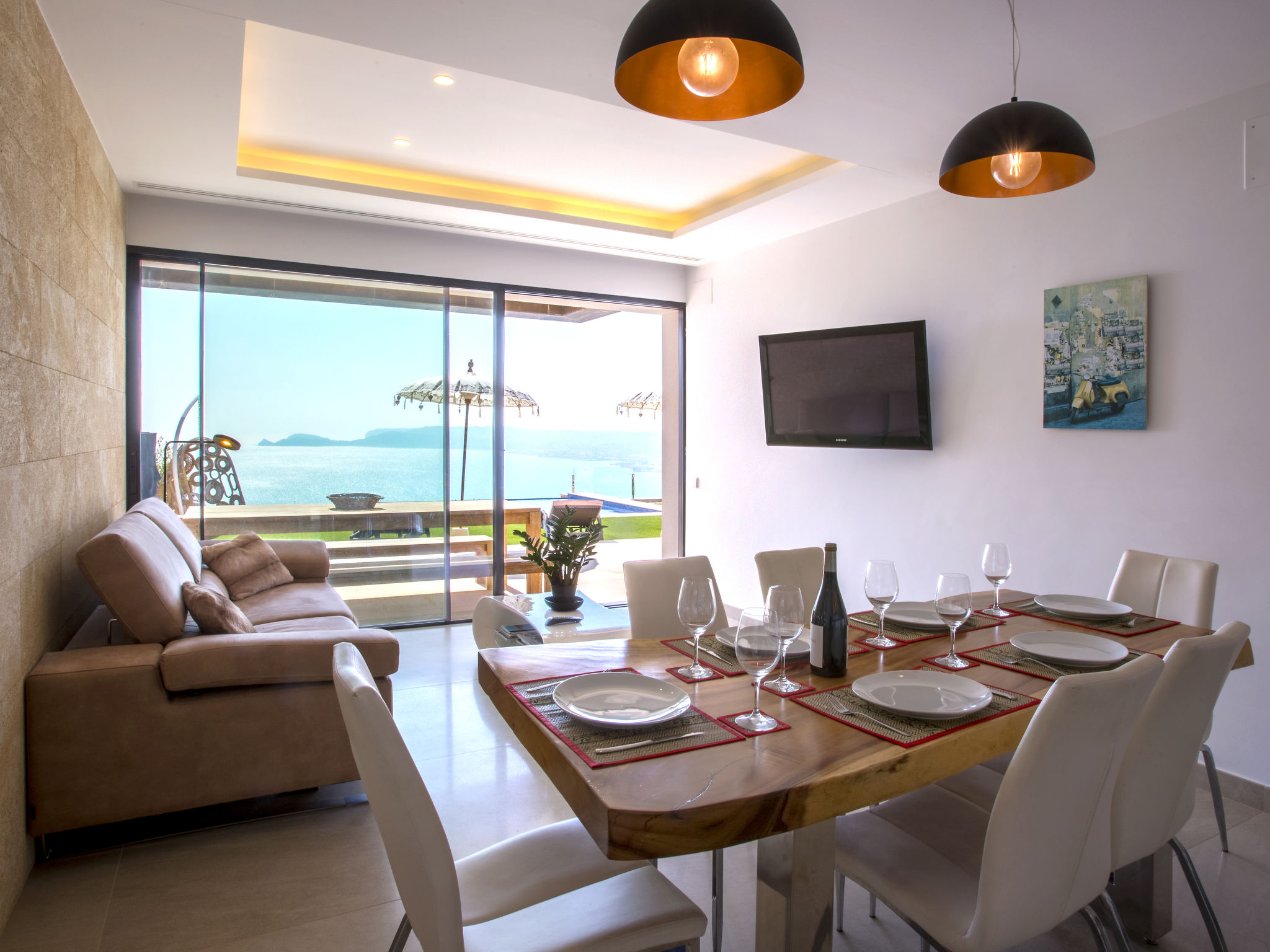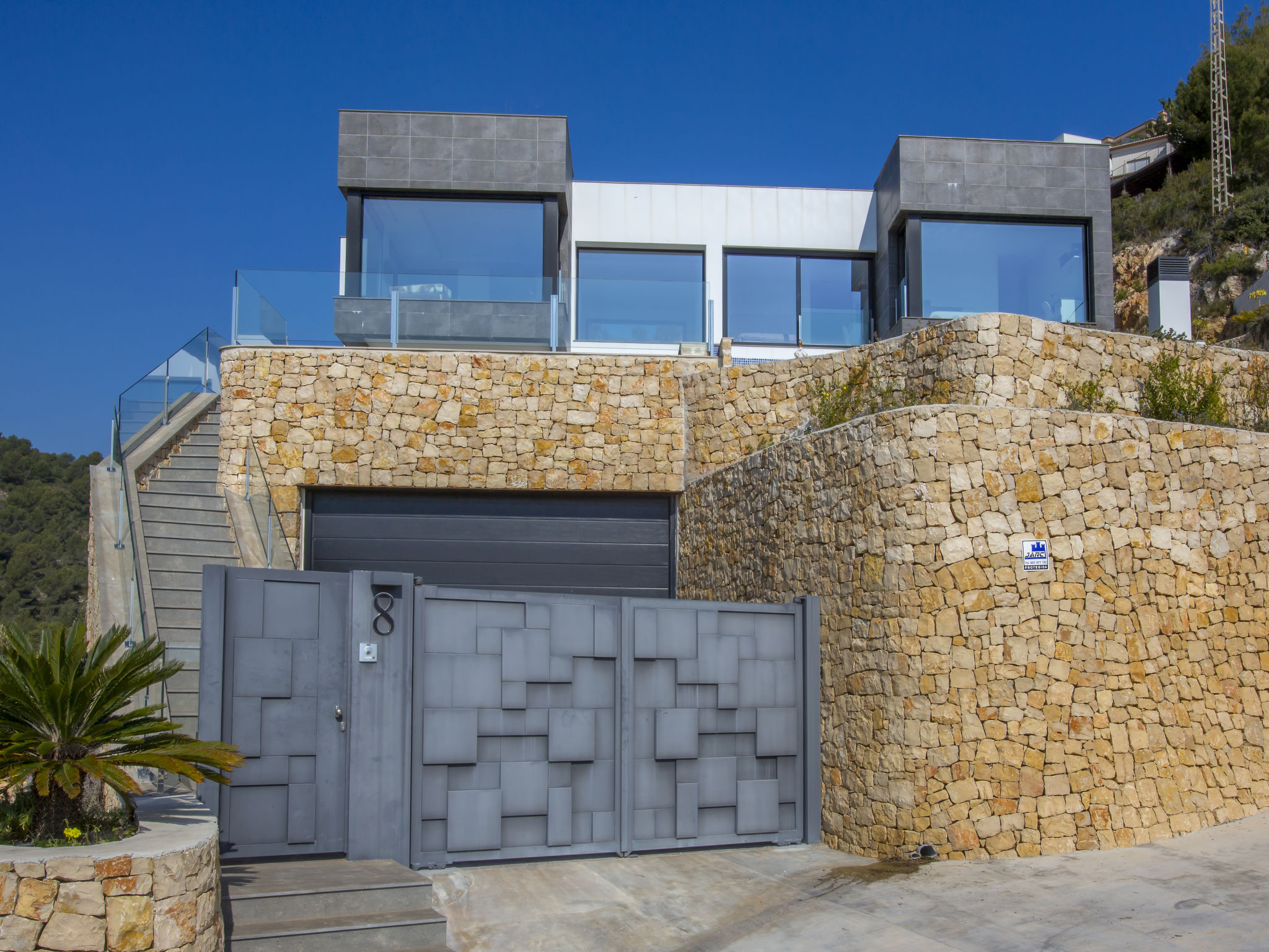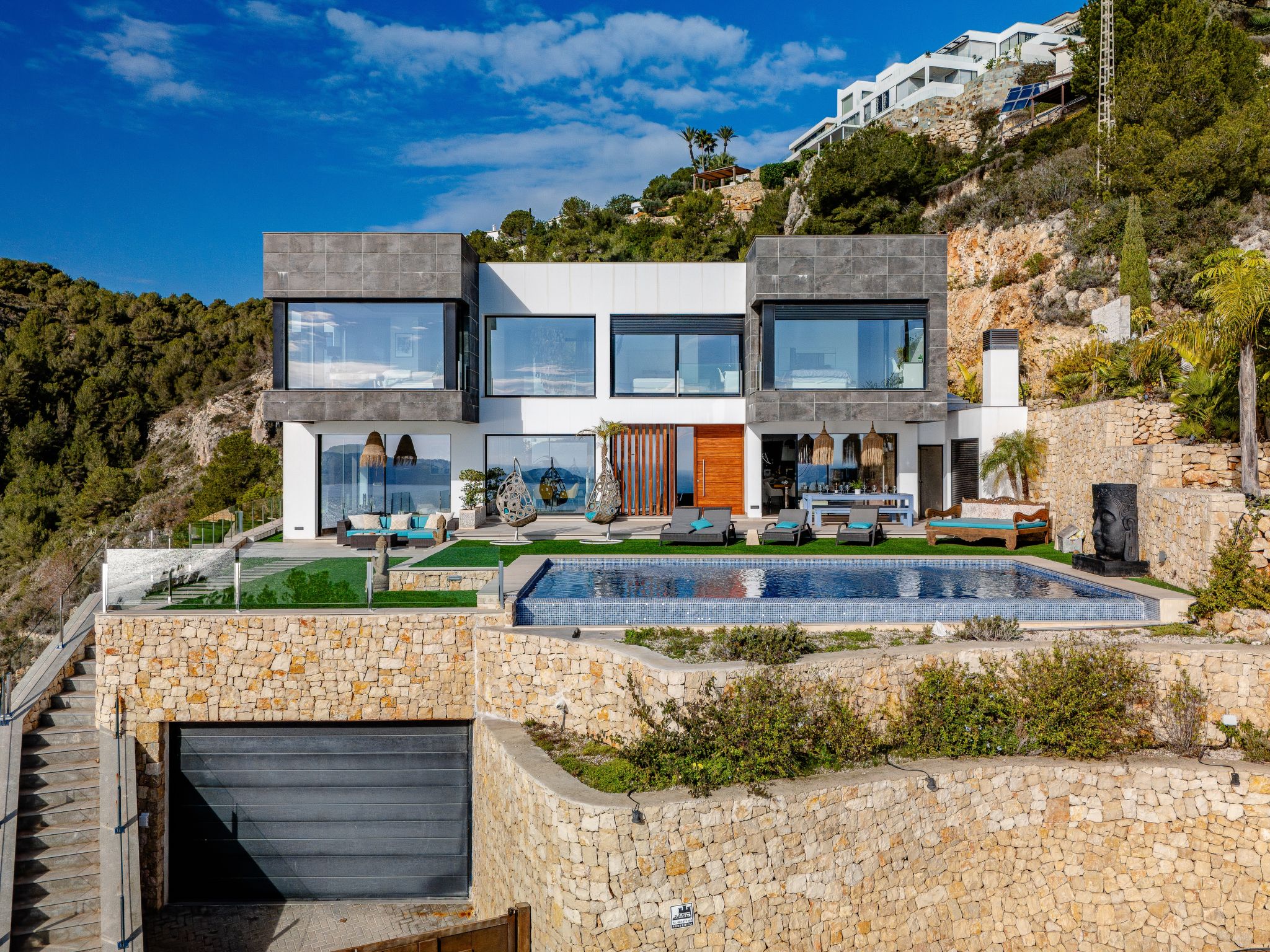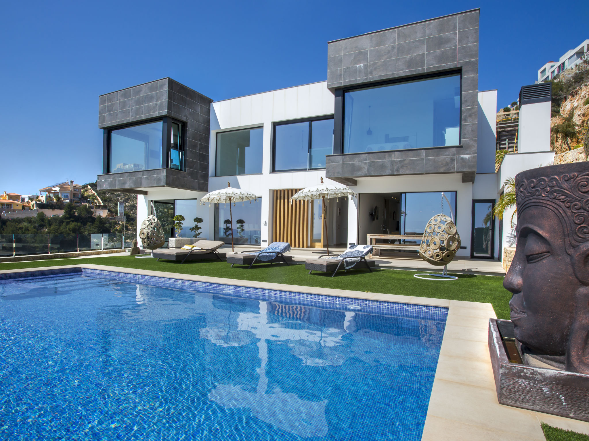"Villa Jakarta", 7-Zimmer-Villa 650 m2 auf 2 Stockwerken. Geräumig und hell, sehr modern und luxuriös eingerichtet: Wohn-/Esszimmer mit offenem Kamin, Esstisch, Sat-TV und Digital-TV. Grosse Küche (Backofen, Geschirrspüler, 4 Induktionskochplatten, Toaster, Wasserkocher, Mikrowelle, Tiefkühler, elektrische Kaffeemaschine, Kochinsel). Dusche/WC. Unteres Geschoss: 1 Zimmer mit 1 franz. Bett (160 cm, Länge 200 cm), Dusche/WC. 1 Zimmer mit 1 franz. Bett (160 cm, Länge 200 cm), Dusche/WC. Obergeschoss: 1 Zimmer mit 1 franz. Bett (180 cm, Länge 200 cm), Dusche/WC. 1 Zimmer mit 1 franz. Bett (160 cm, Länge 200 cm), Dusche/WC. 1 Zimmer mit 1 franz. Bett (160 cm, Länge 200 cm), Dusche/WC. Grosse Terrasse. Terrassenmöbel, Gartengrill, Liegestühle. Herrliche Panoramasicht auf das Meer und die Ortschaft. Zur Verfügung: Waschmaschine, Wäschetrockner, Bügeleisen, Kinderhochstuhl, Babybett, Haartrockner. Internet (Wireless LAN, gratis). Beim Haus. In der unteren Etage befindet sich auch ein Fitnessstudio mit Sprudelbad und WC. Garage für 3 Autos. VT-484887-A