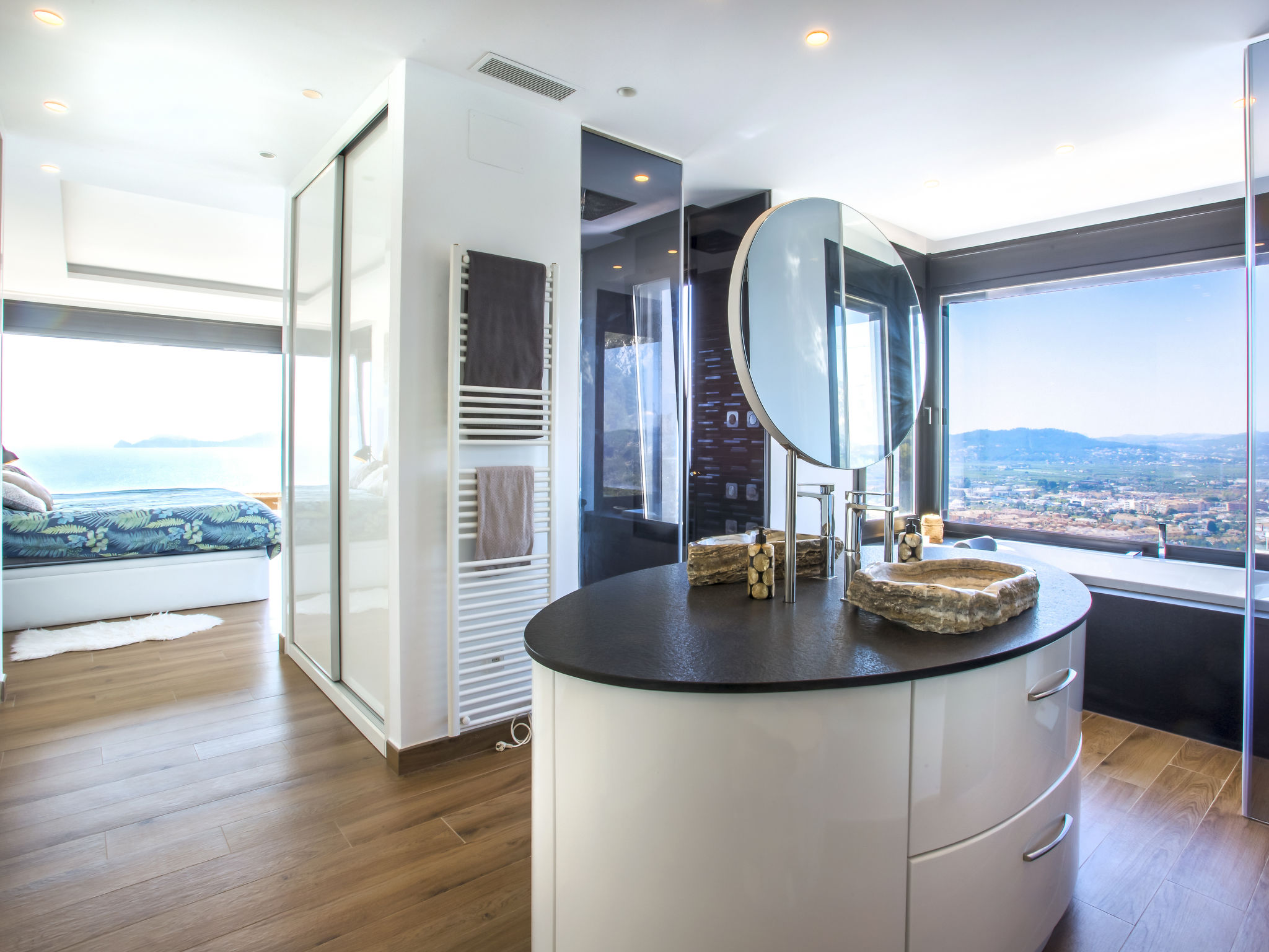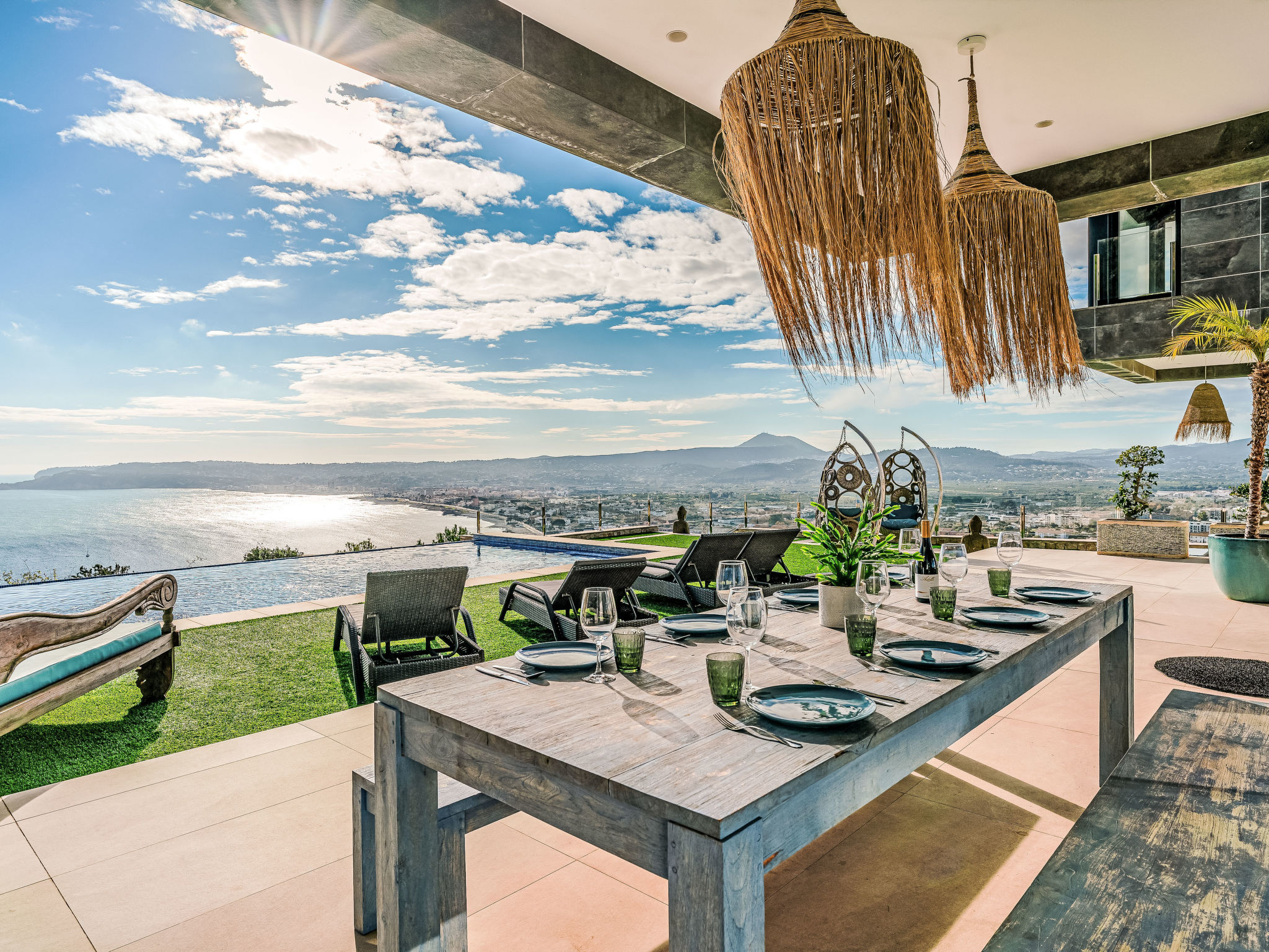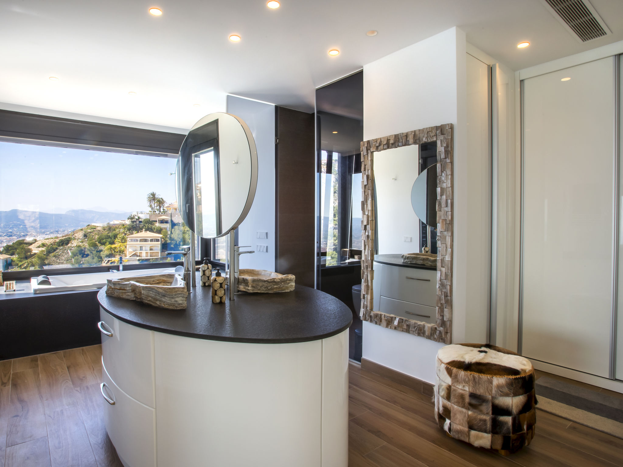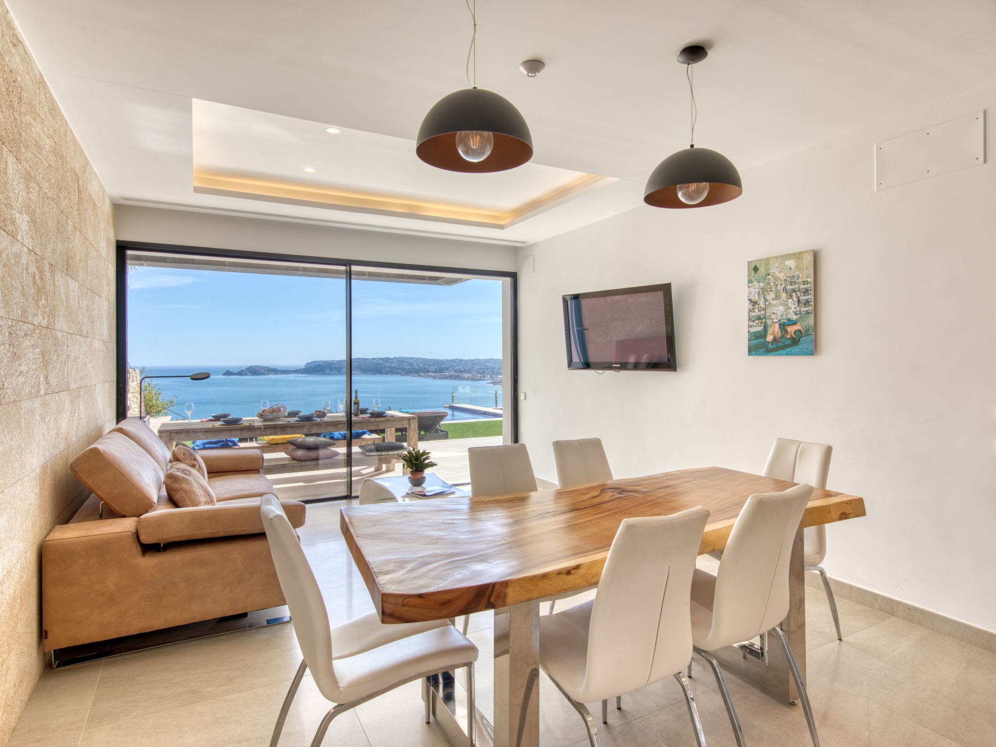 "Villa Jakarta", 7-Zimmer-Villa 650 m2 auf 2 Stockwerken. Geräumig und hell, sehr modern und luxuriös eingerichtet: Wohn-/Esszimmer mit offenem Kamin, Esstisch, Sat-TV und Digital-TV. Grosse Küche (Backofen, Geschirrspüler, 4 Induktionskochplatten, Toaster, Wasserkocher, Mikrowelle, Tiefkühler, elektrische Kaffeemaschine, Kochinsel). Dusche/WC. Unteres Geschoss: 1 Zimmer mit 1 franz. Bett (160 cm, Länge 200 cm), Dusche/WC. 1 Zimmer mit 1 franz. Bett (160 cm, Länge 200 cm), Dusche/WC. Obergeschoss: 1 Zimmer mit 1 franz. Bett (180 cm, Länge 200 cm), Dusche/WC. 1 Zimmer mit 1 franz. Bett (160 cm, Länge 200 cm), Dusche/WC. 1 Zimmer mit 1 franz. Bett (160 cm, Länge 200 cm), Dusche/WC. Grosse Terrasse. Terrassenmöbel, Gartengrill, Liegestühle. Herrliche Panoramasicht auf das Meer und die Ortschaft. Zur Verfügung: Waschmaschine, Wäschetrockner, Bügeleisen, Kinderhochstuhl, Babybett, Haartrockner. Internet (Wireless LAN, gratis). Beim Haus. In der unteren Etage befindet sich auch ein Fitnessstudio mit Sprudelbad und WC. Garage für 3 Autos. VT-484887-A