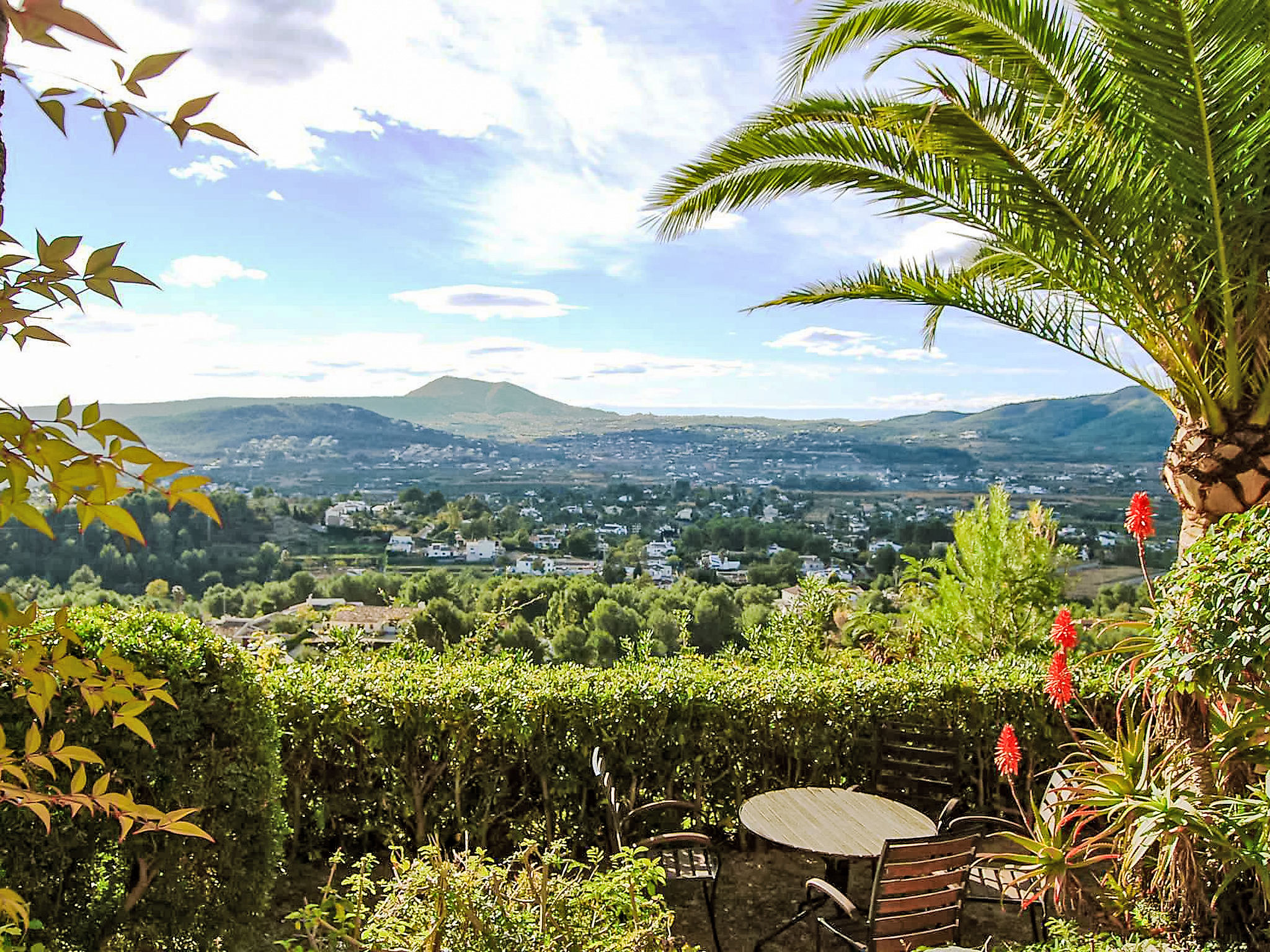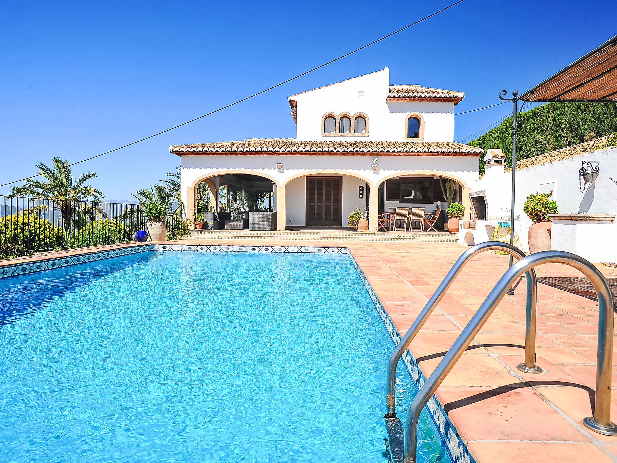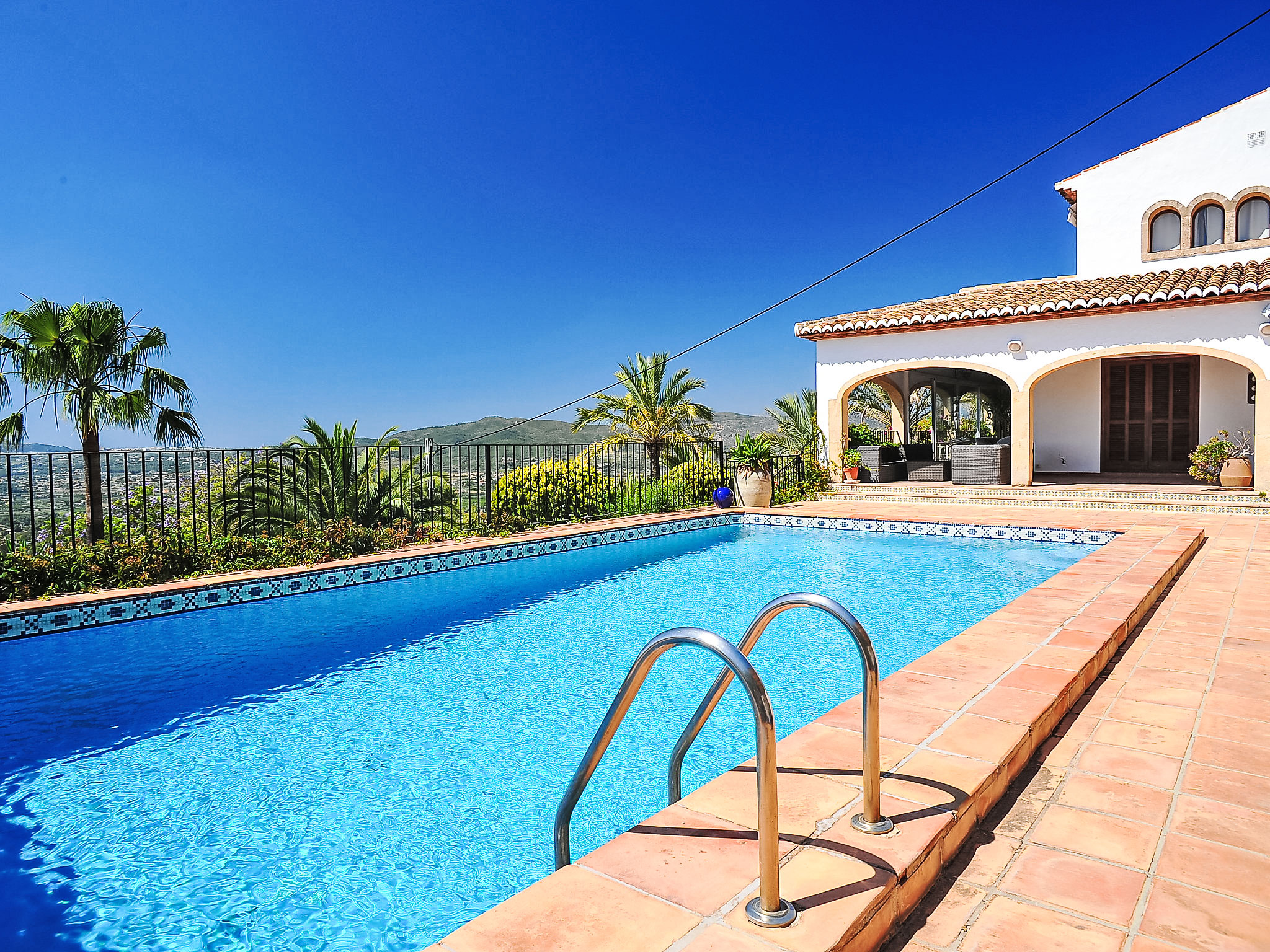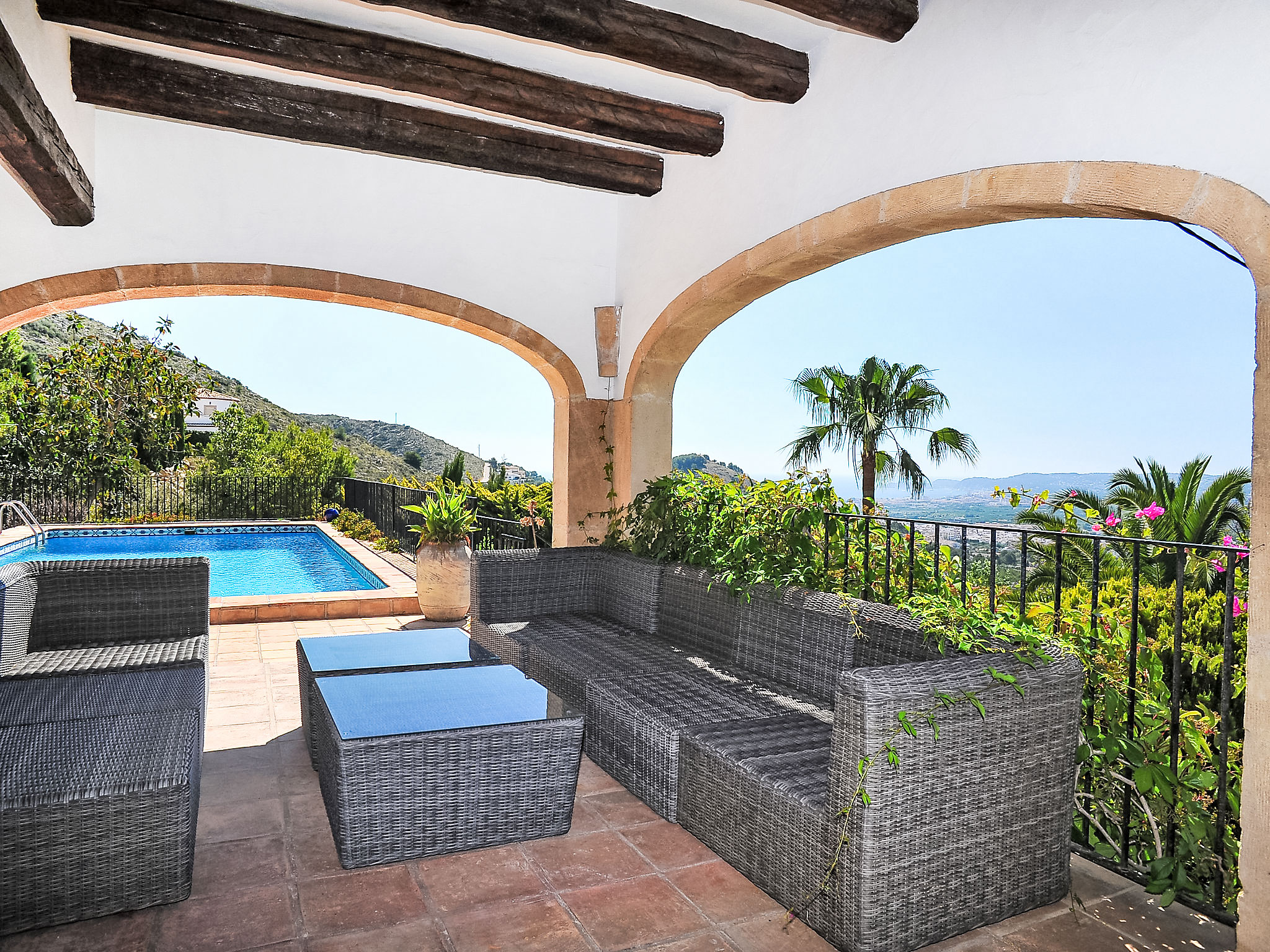 Schönes Einfamilienhaus "Nostra", auf 2 Stockwerken. Im Ortsteil Montgo, ruhige, sonnige Lage am Hang, in einem Wohnquartier, 7 km vom Meer, in einer Sackgasse. Zur Alleinbenutzung: Terrassengarten, 1'800 m2 (eingezäunt) mit Pflanzen, Schwimmbad (5 x 10 m, 01.01.-31.12.) mit Innentreppe. Supermarkt 3 km, Restaurant 2 km, Sandstrand "Arenal" 7 km. Golfplatz (18 Loch) 5 km. Jugendgruppen nur auf Anfrage.