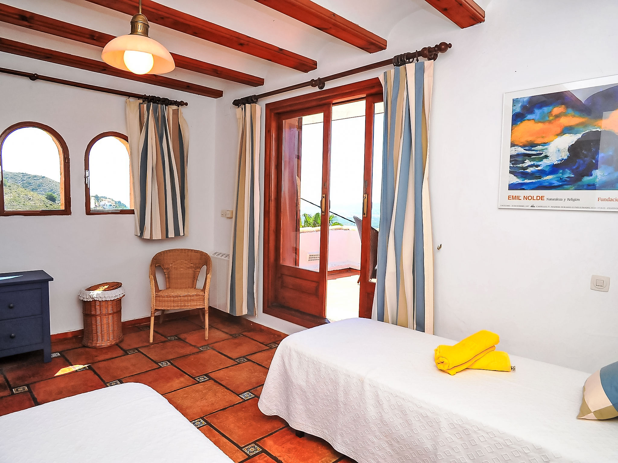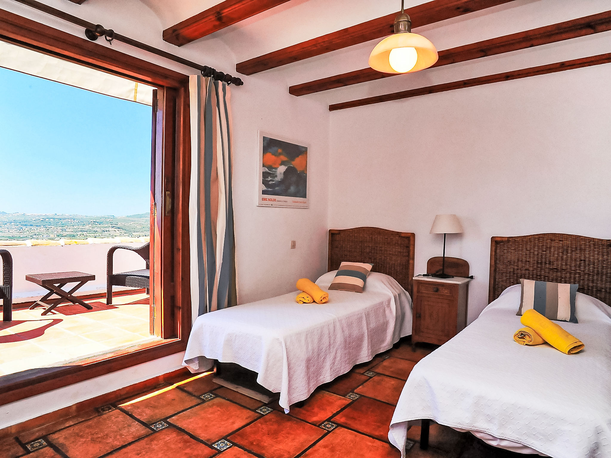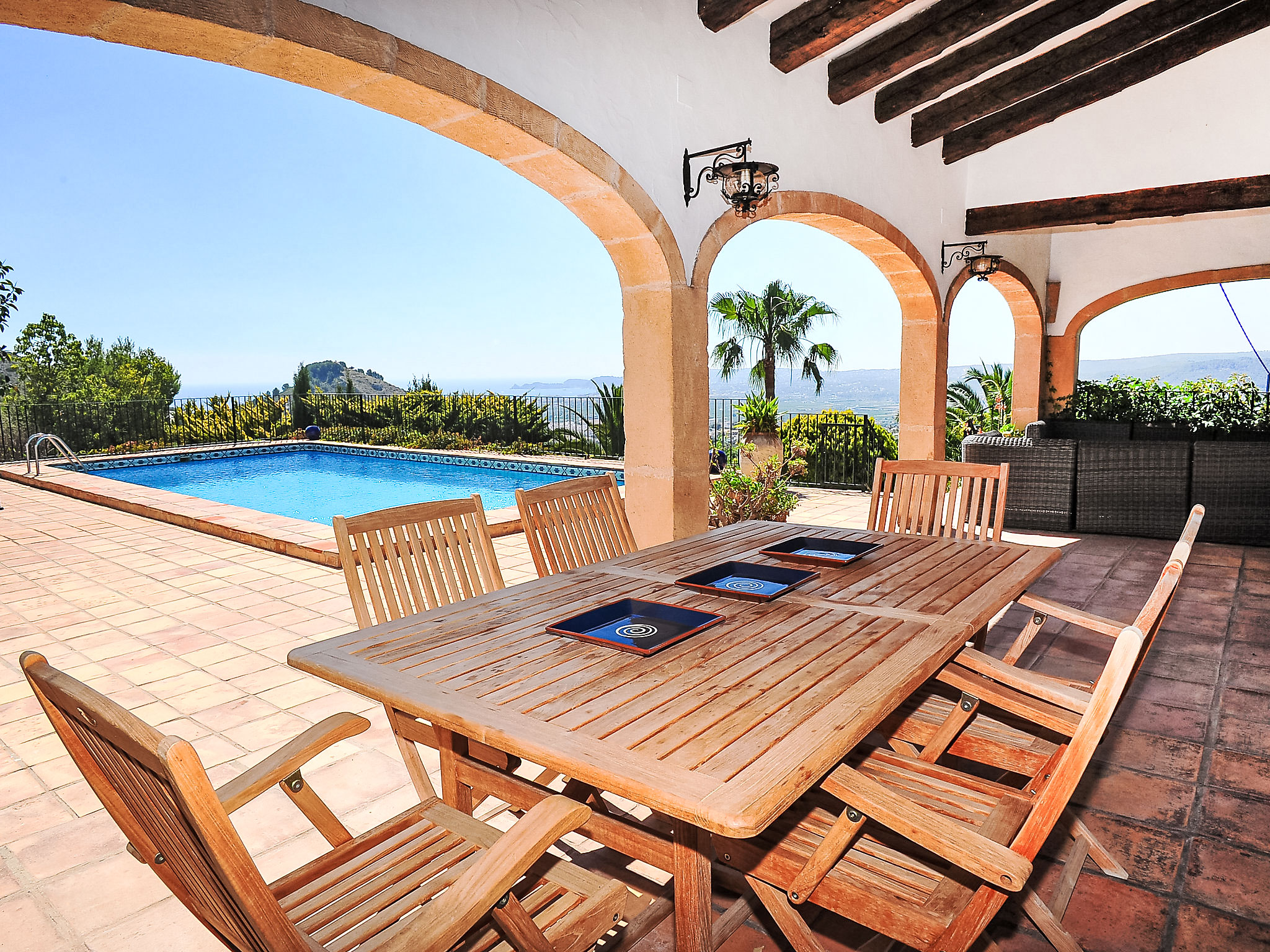 Schönes Einfamilienhaus "Nostra", auf 2 Stockwerken. Im Ortsteil Montgo, ruhige, sonnige Lage am Hang, in einem Wohnquartier, 7 km vom Meer, in einer Sackgasse. Zur Alleinbenutzung: Terrassengarten, 1'800 m2 (eingezäunt) mit Pflanzen, Schwimmbad (5 x 10 m, 01.01.-31.12.) mit Innentreppe. Supermarkt 3 km, Restaurant 2 km, Sandstrand "Arenal" 7 km. Golfplatz (18 Loch) 5 km. Jugendgruppen nur auf Anfrage.