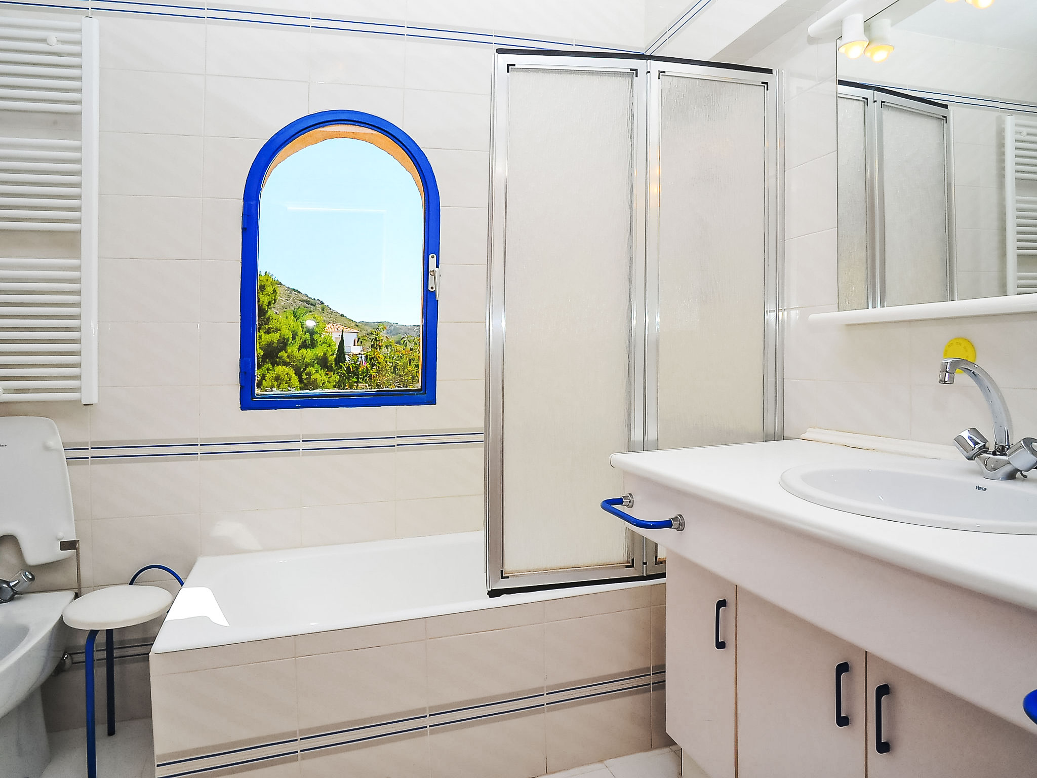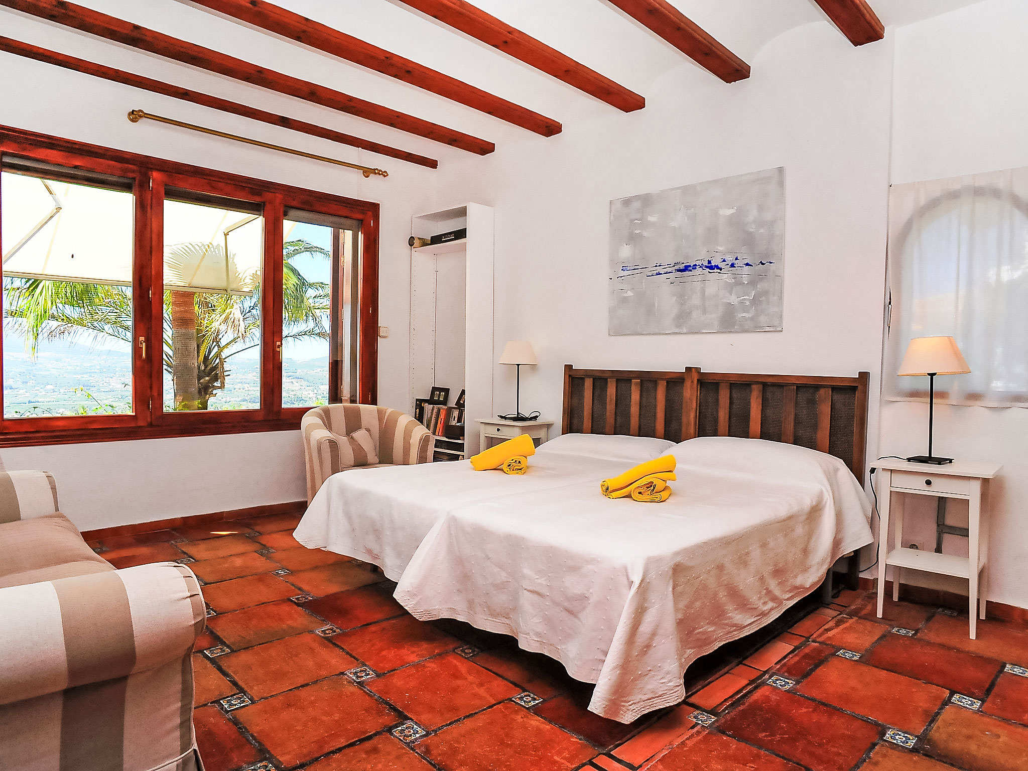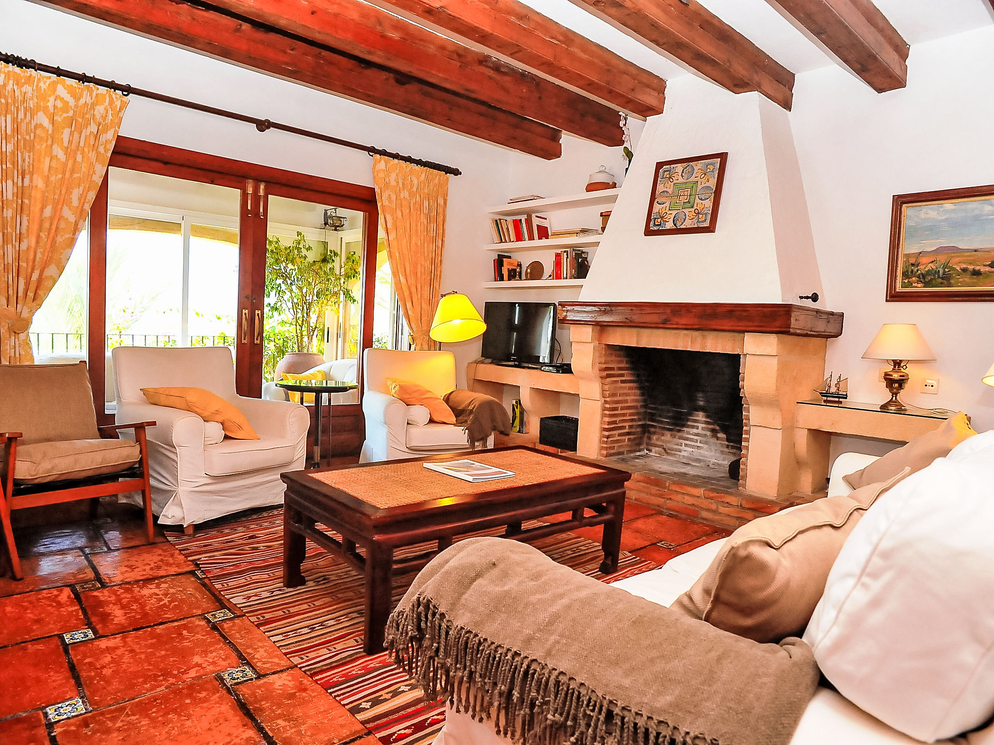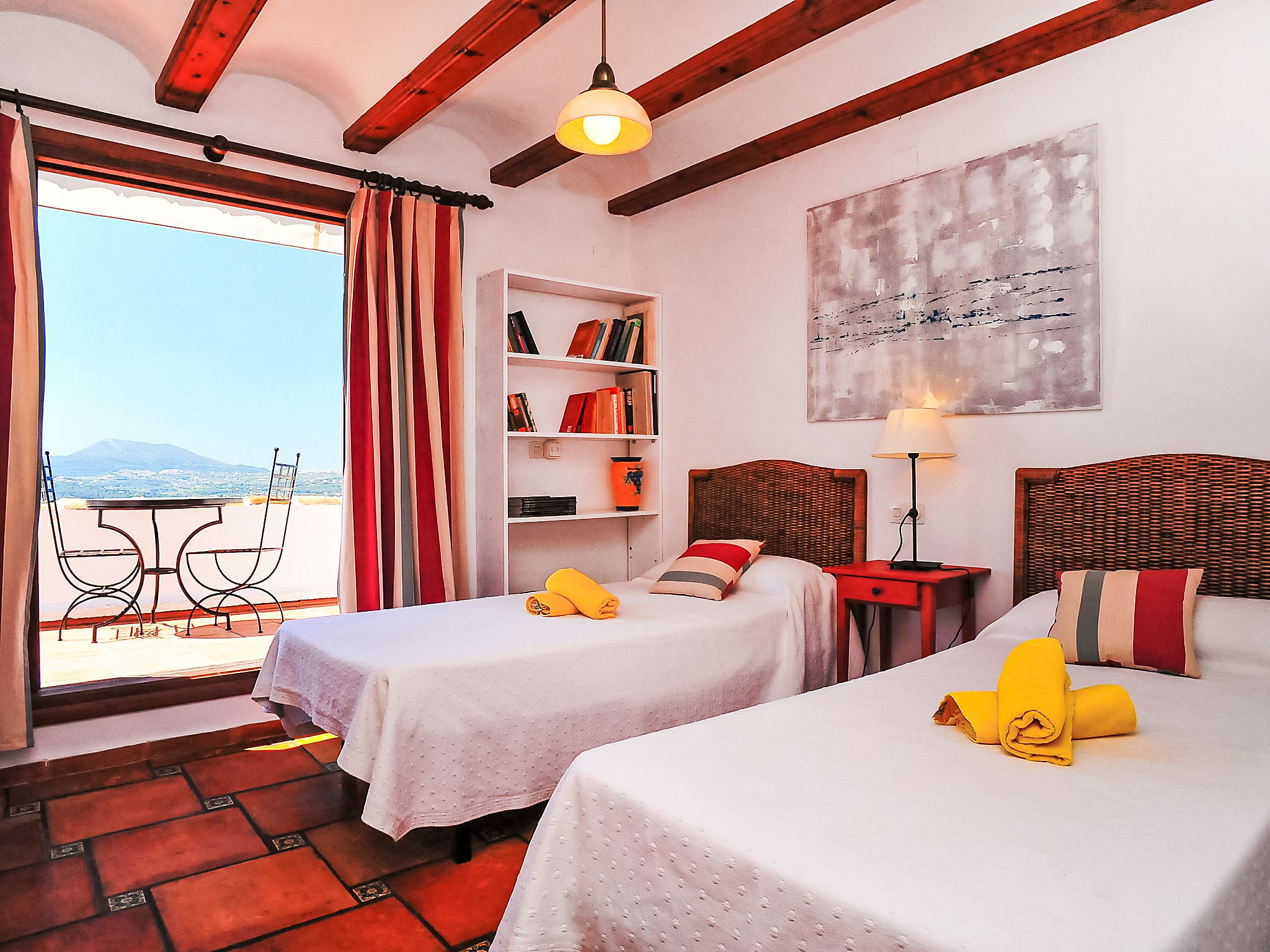 Schönes Einfamilienhaus "Nostra", auf 2 Stockwerken. Im Ortsteil Montgo, ruhige, sonnige Lage am Hang, in einem Wohnquartier, 7 km vom Meer, in einer Sackgasse. Zur Alleinbenutzung: Terrassengarten, 1'800 m2 (eingezäunt) mit Pflanzen, Schwimmbad (5 x 10 m, 01.01.-31.12.) mit Innentreppe. Supermarkt 3 km, Restaurant 2 km, Sandstrand "Arenal" 7 km. Golfplatz (18 Loch) 5 km. Jugendgruppen nur auf Anfrage.