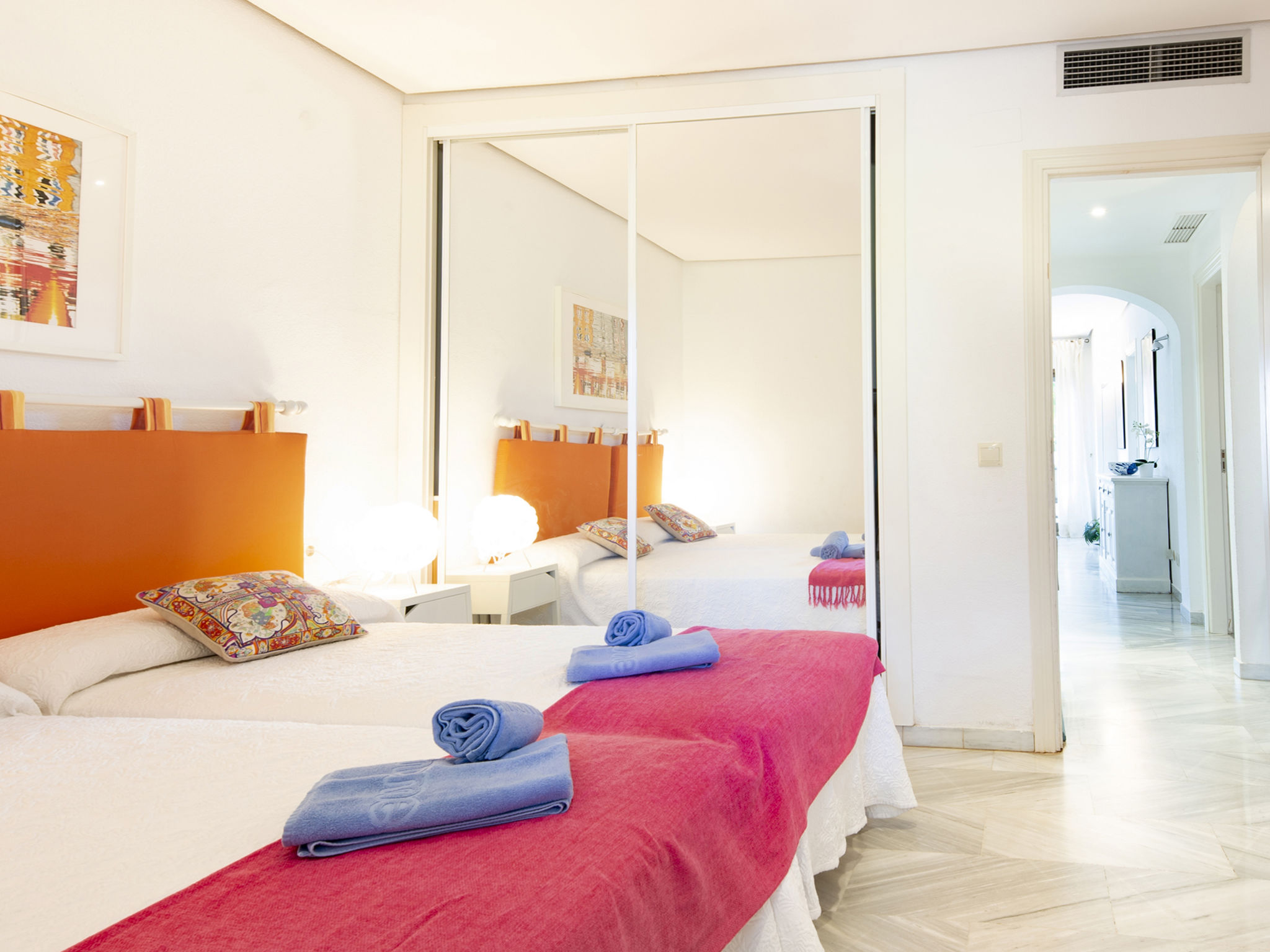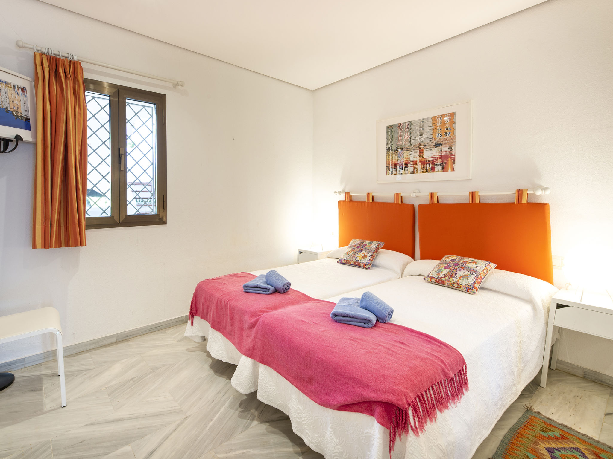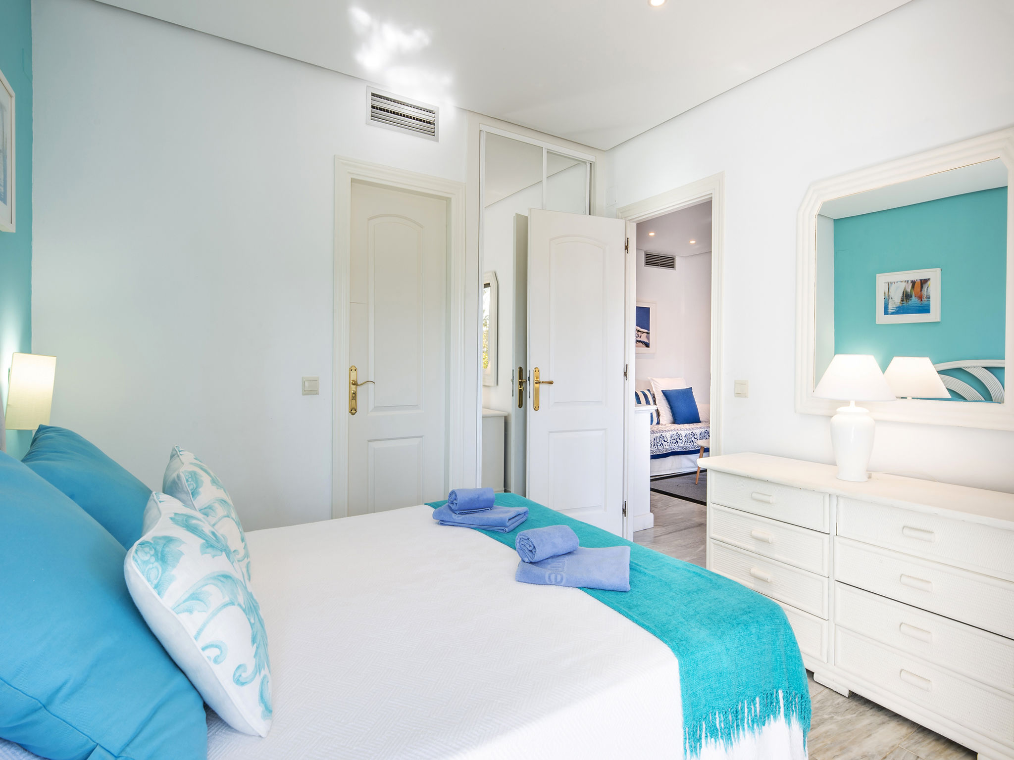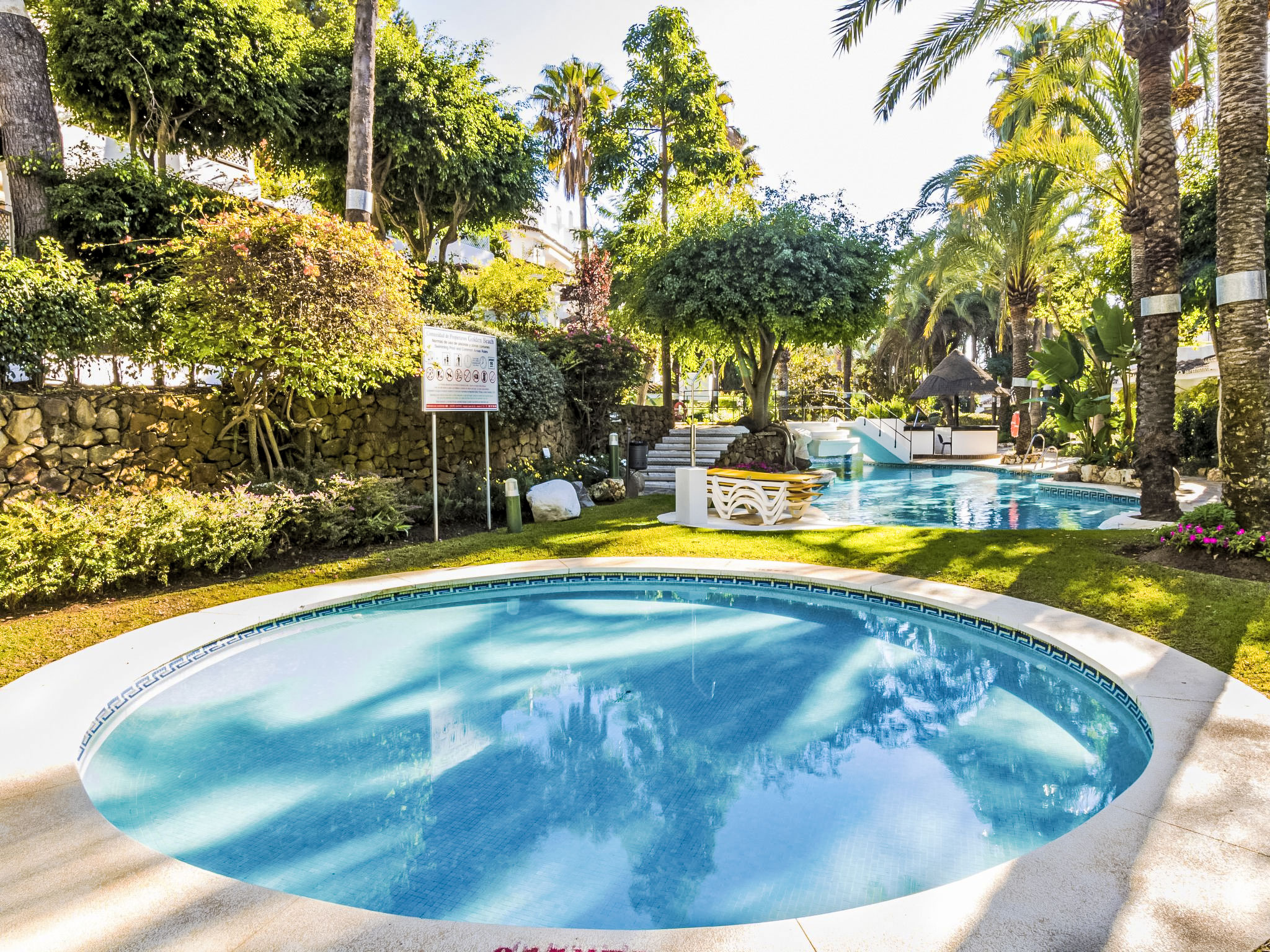 Modernes, schönes, gemütliches Appartementhaus "Golden beach". 13 km vom Zentrum von Marbella, 23 km vom Zentrum von Puerto Banus, im Bezirk Elviria, 150 m vom Meer, 150 m vom Strand, Richtung Südosten. Zur Mitbenutzung: grosser Terrassengarten mit Rasen, 2 Schwimmbäder nierenförmig (saisonale Verfügbarkeit: 01.Jun.-30.Sep. Öffnungszeiten Schwimmbad: 08:00-21:00). Kinderbecken, Aussendusche, öffentliche Parkplätze auf der Strasse. Supermarkt 800 m, Einkaufszentrum 900 m, Restaurant, Bar 300 m, Bäckerei 900 m, Café, Biergarten 300 m. Golfplatz (18 Loch) 4 km. Bitte beachten: geeignet für Familien, Babyausstattung (inkl.). Residenz ist 24 Std. überwacht.
