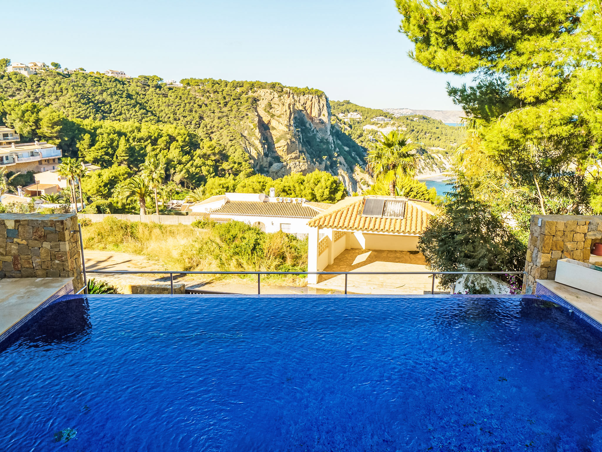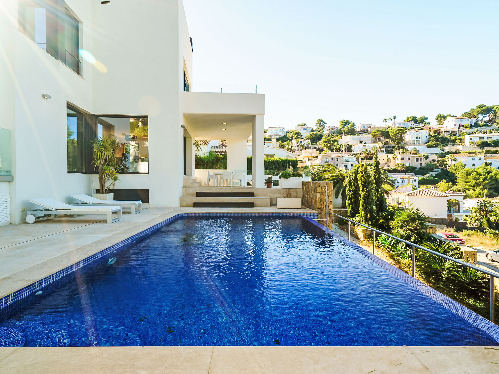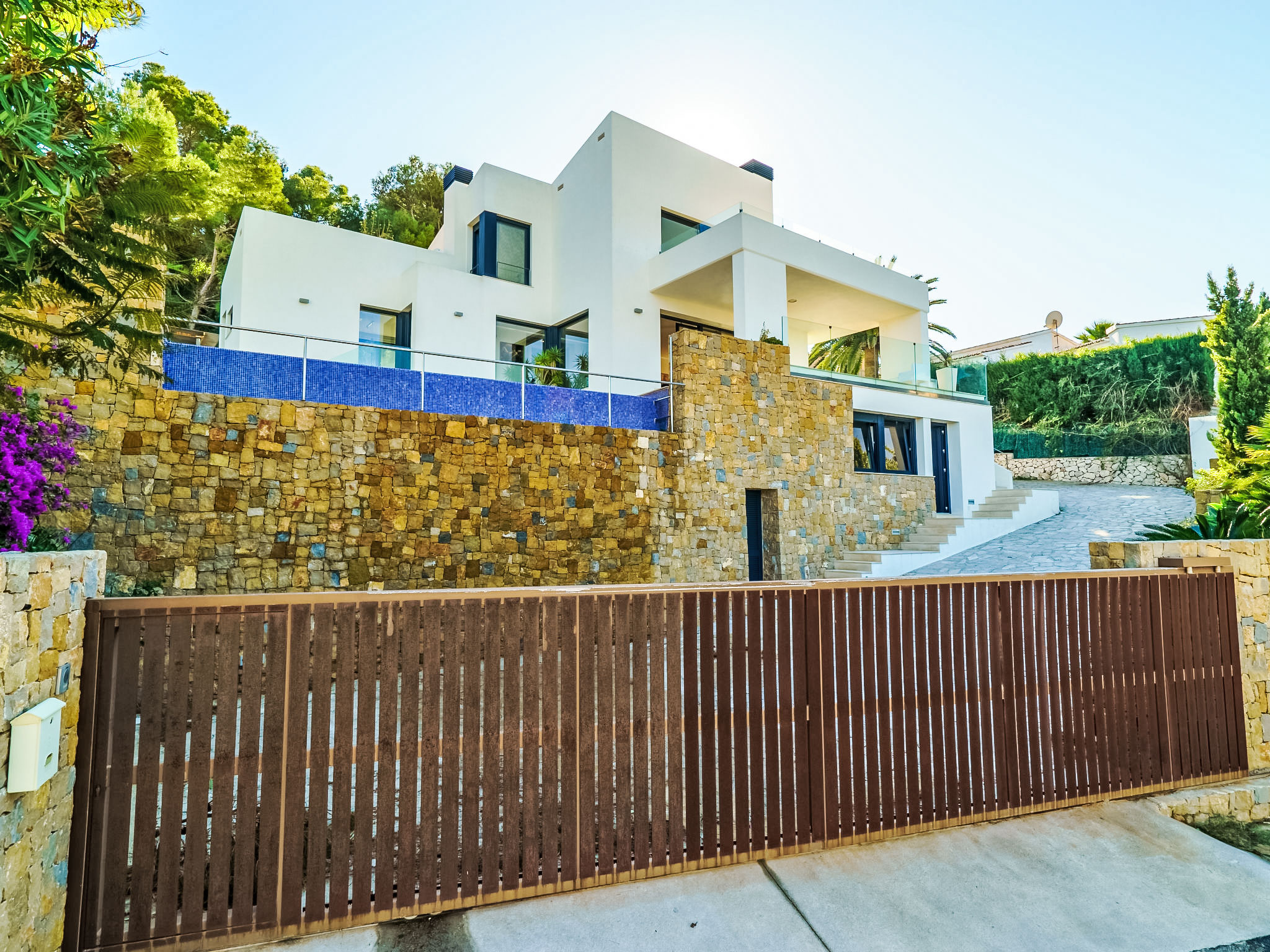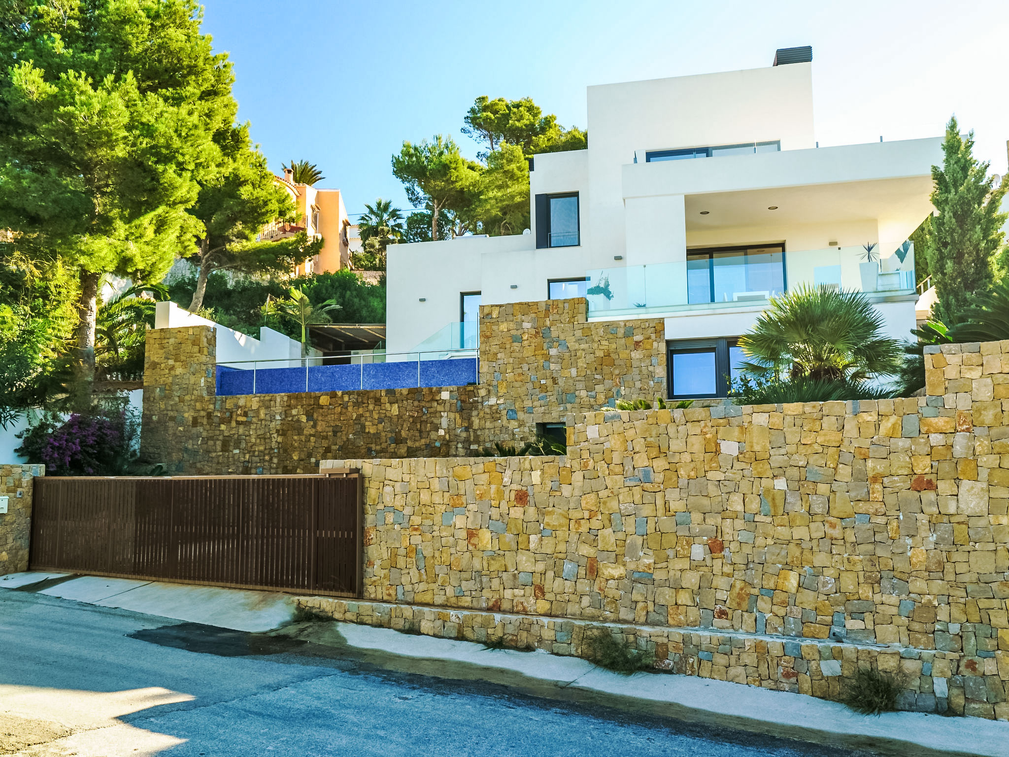 Moderne, luxuriöse Villa "Solymar", auf 3 Stockwerken. Im Ortsteil Balcón al Mar, ruhige, sonnige Lage, 5 km vom Meer. Zur Alleinbenutzung: Garten 800 m2 (eingezäunt) mit Pflanzen, Schwimmbad (4 x 8 m, 01.01.-31.12.) mit Innentreppe. Dusche/WC im Poolbereich. Supermarkt 6 km, Restaurant 800 m, Sandstrand "Arenal" 8 km, Felsstrand "Granadella" 5 km. Jugendgruppen nur auf Anfrage.