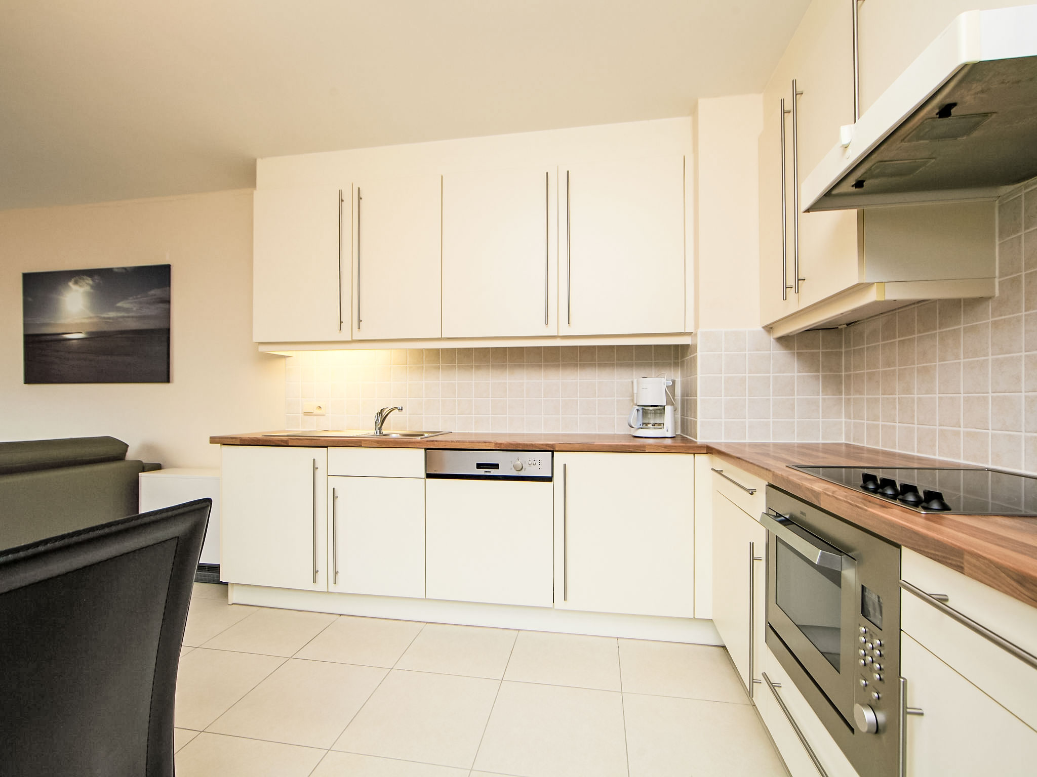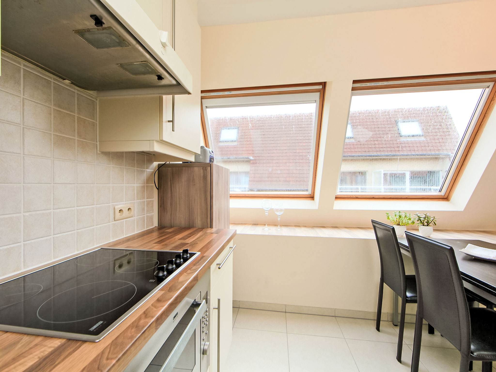 "Appartement 502", 2-Zimmer-Wohnung 50 m2. Einfach eingerichtet: Wohn-/Esszimmer mit Digital-TV, CD und DVD. Ausgang zum Balkon. 1 Doppelzimmer mit 1 Doppelbett (1 x 140 cm, Länge 200 cm). Offene Küche (Backofen, Geschirrspüler, 4 Glaskeramikherd Platten, Toaster, Wasserkocher, Mikrowelle, Tiefkühler, elektrische Kaffeemaschine). Bad/WC. Balkon. Balkonmöbel. Zur Verfügung: Internet (Wireless LAN, gratis). Bitte beachten: Wohnung auf Strassenseite. Nichtraucher-Haus.