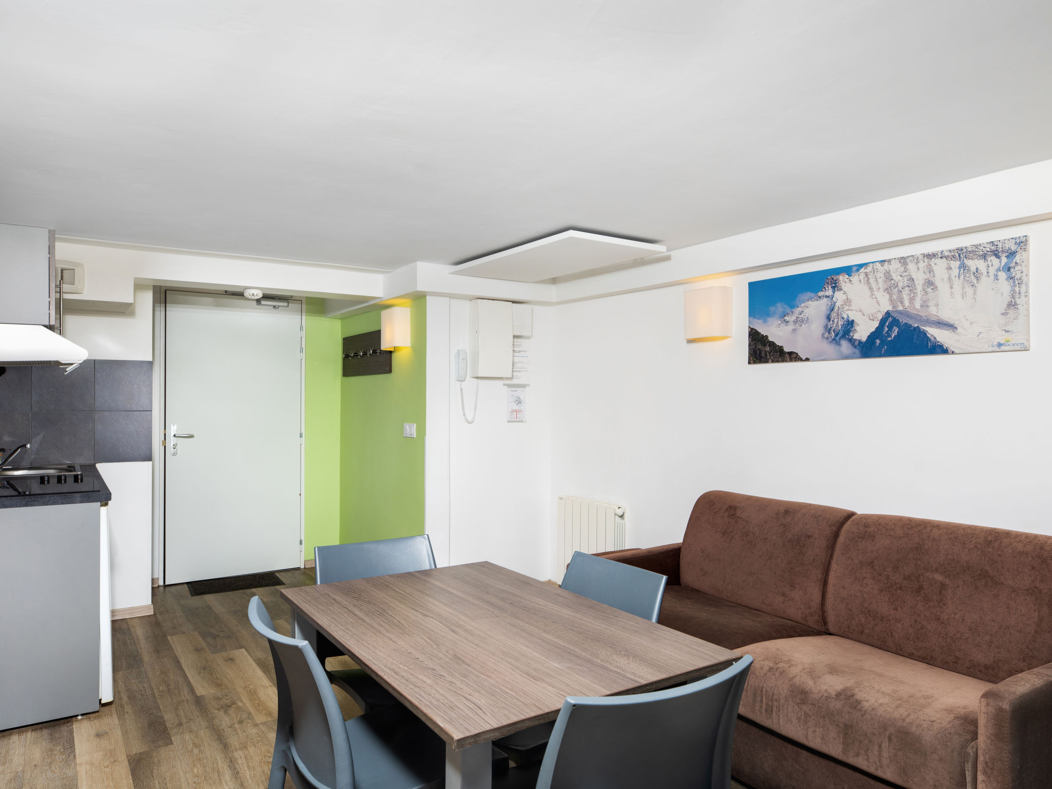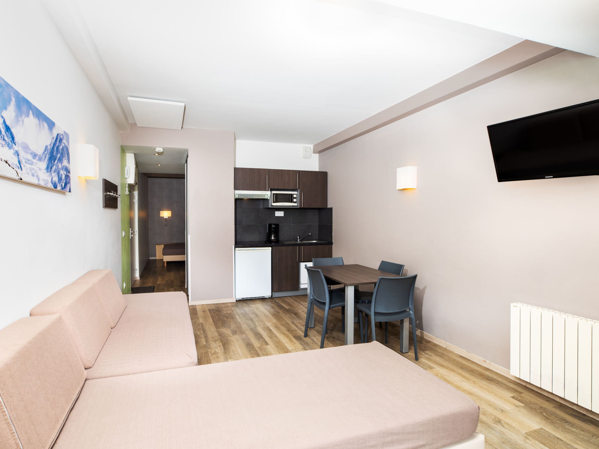 1-Zimmer-Wohnung, ca. 20-23 m². Wohn-/Schlafraum mit Doppelbettcouch, Essplatz, Balkonausgang und Kochecke (3 Ceranfelder, Backofen/Mikrowelle, kleiner Geschirrspüler, Kühlschrank, Kaffeemaschine, Wasserkocher, Toaster). Schlafnische mit Etagenbett oder 2 Einzelbetten. Bad/WC oder Dusche/WC.