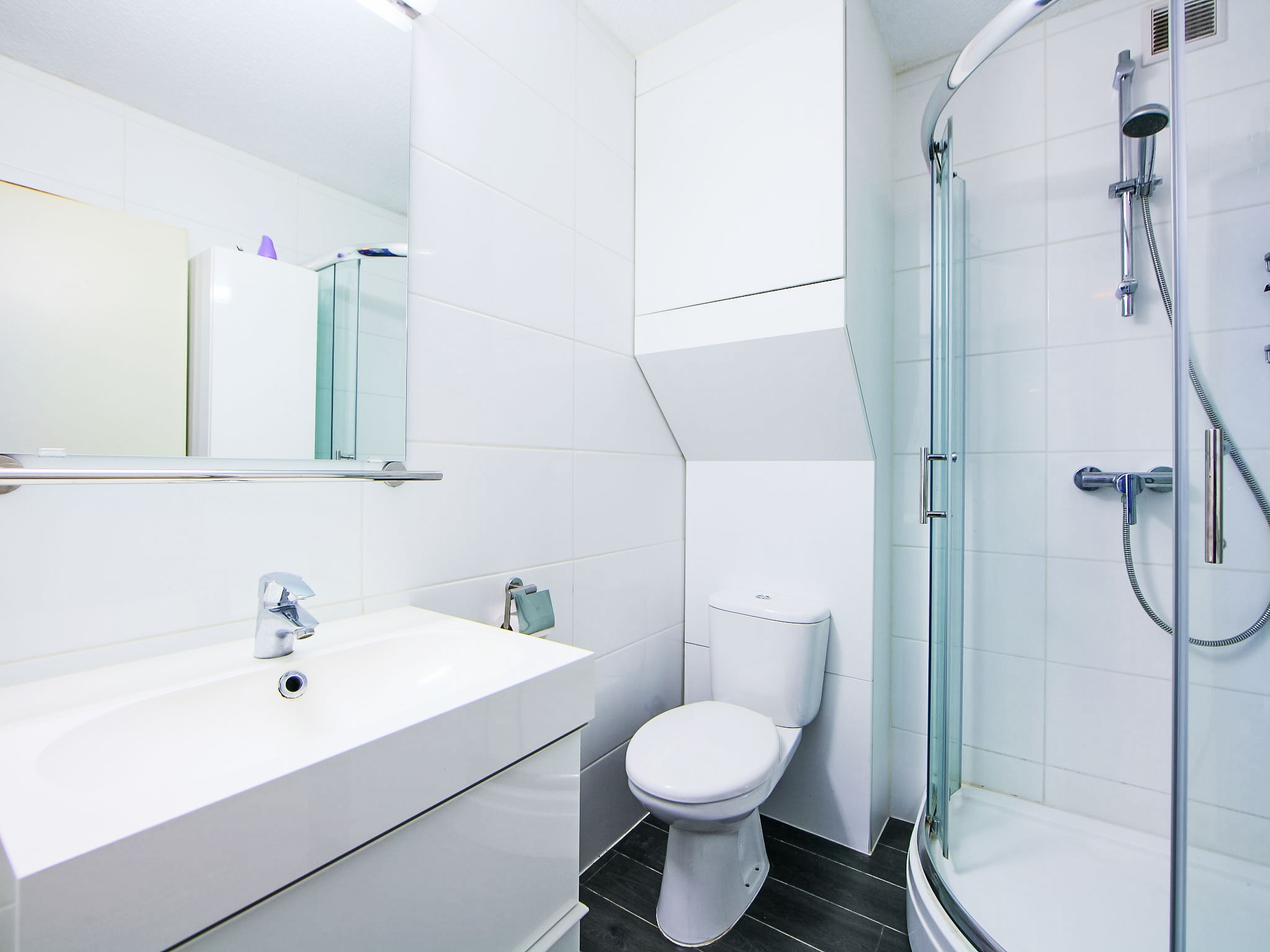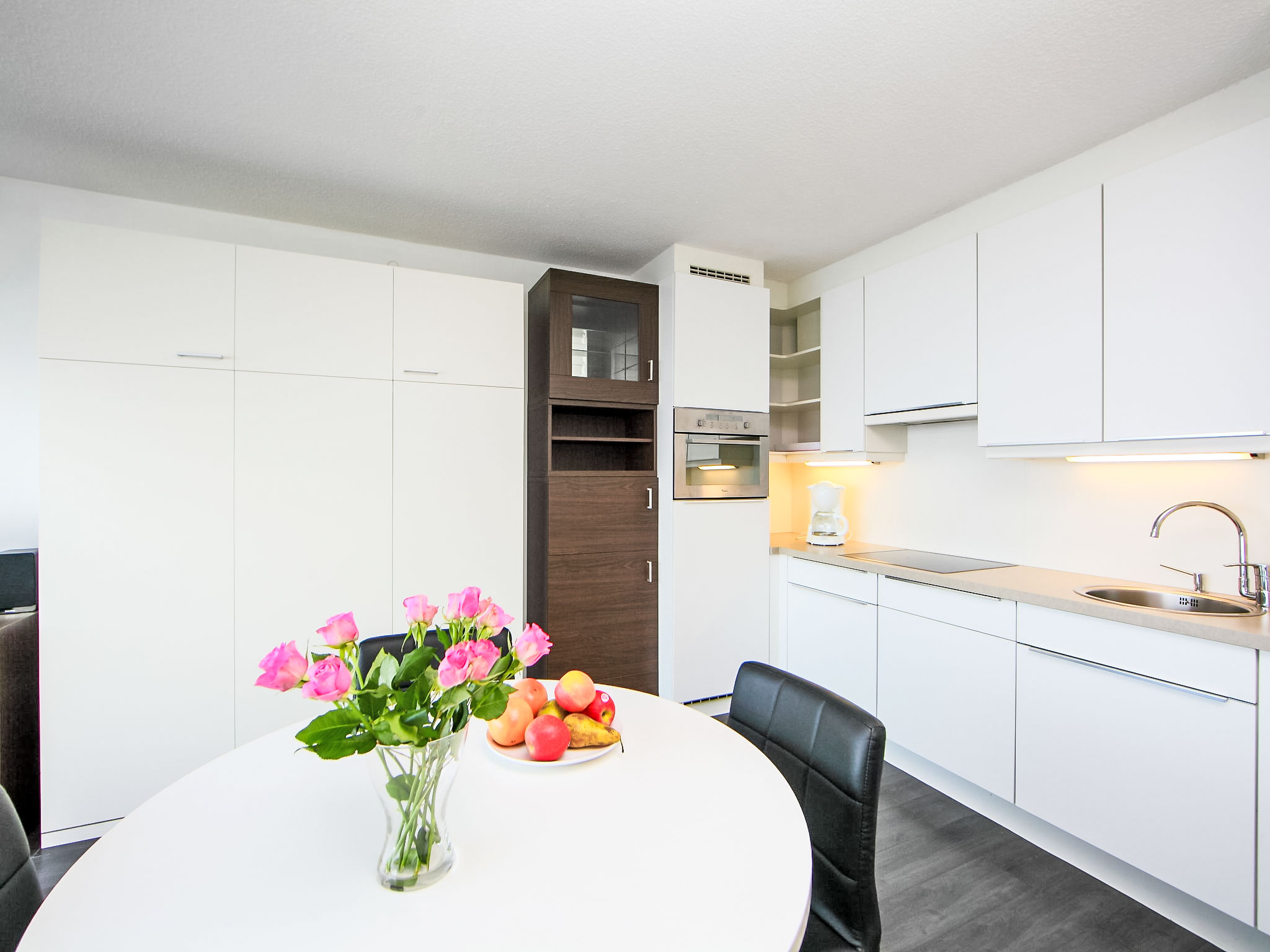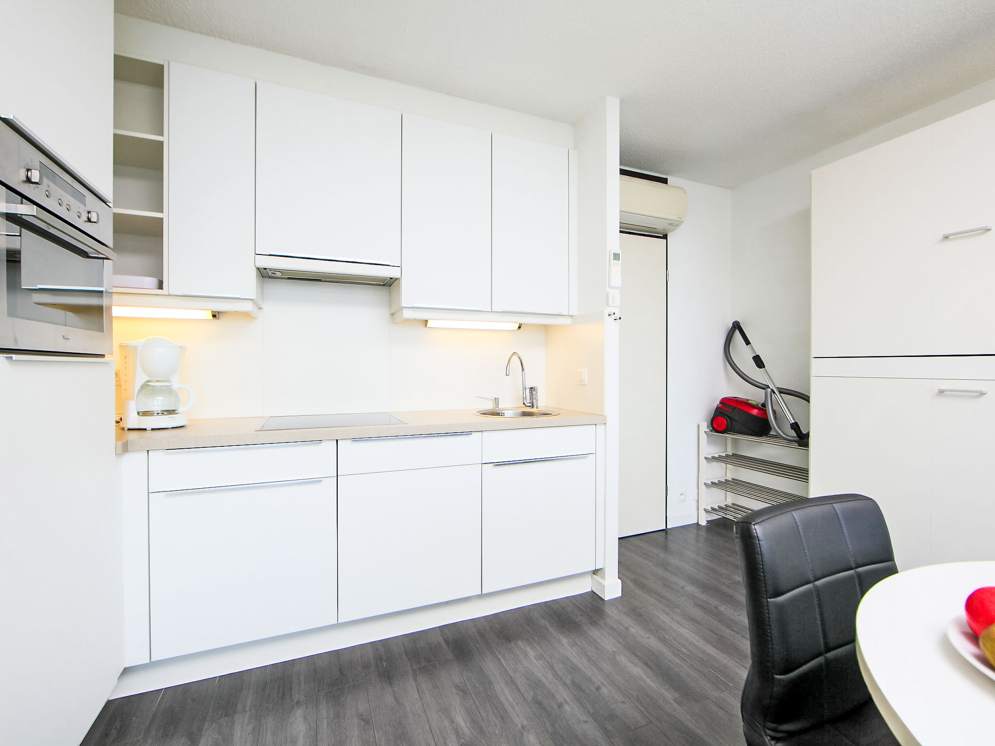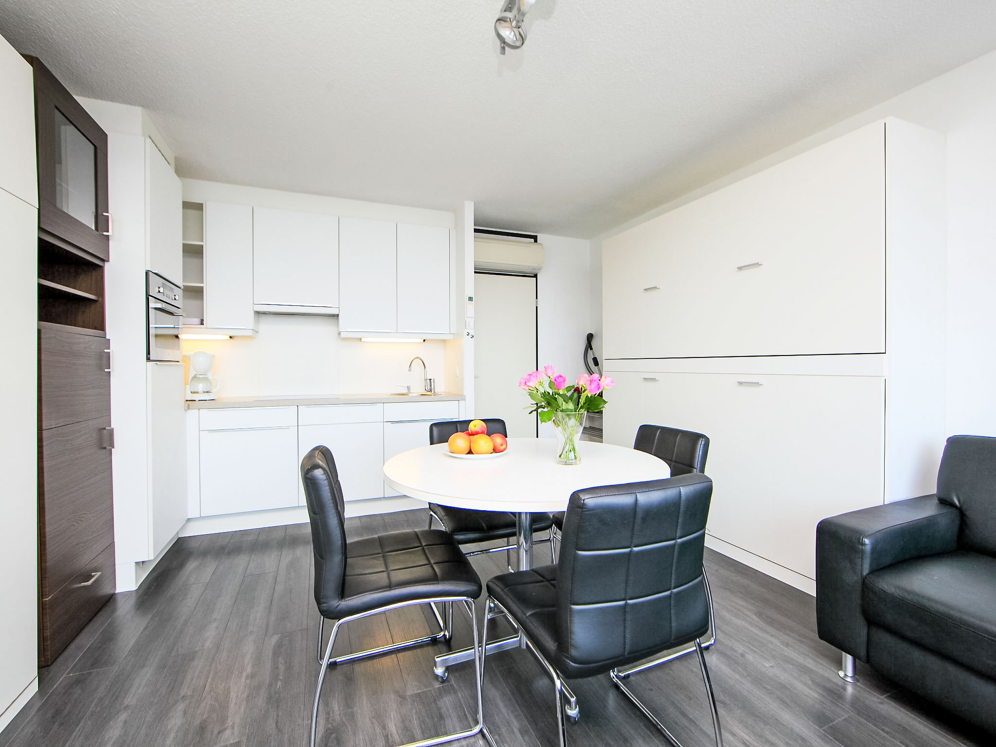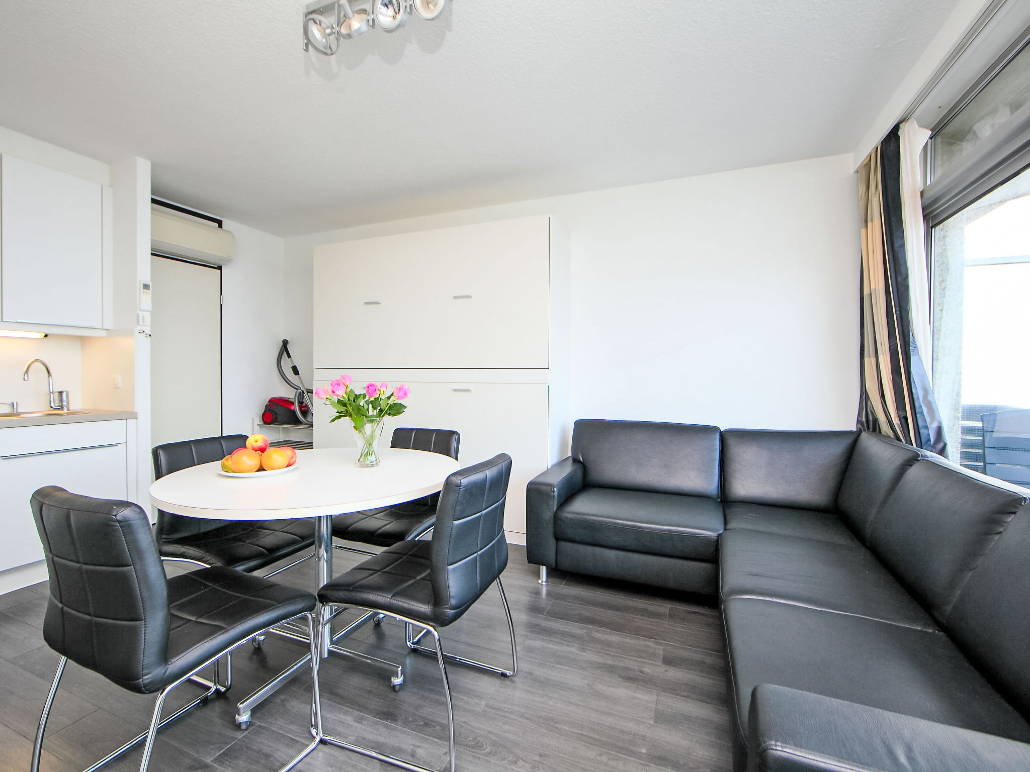 "Studio met garage", 1-Zimmer-Studio 25 m2 im 8. Stock. Komfortabel und modern eingerichtet: Wohn-/Schlafzimmer mit 2 Wandschrankbetten (90 cm, Länge 200 cm), 1 Doppelwandschrankbett (160 cm, Länge 200 cm), TV und Digital-TV (Flachbildschirm), Radio, CD und DVD. Ausgang zum Balkon. Küche (Geschirrspüler, 4 Glaskeramikherd Platten, Wasserkocher, elektrische Kaffeemaschine, Kombinationsmikrowelle). Dusche/WC. Balkonmöbel. Sicht auf das Meer. Zur Verfügung: Internet (Wireless LAN, gratis). Garage Nr. 9 auf dem Grundstück. Bitte beachten: Nichtraucher-Haus.