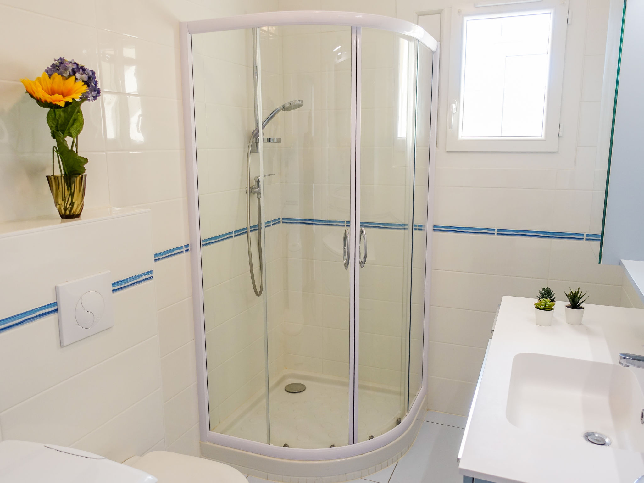 2-Zimmer-Wohnung 52 m2 im 2. Stock. Objekt geeignet für 2 Erwachsene + 3 Kinder. Komfortabel eingerichtet: Wohn-/Esszimmer mit Panoramafenster mit 1 Doppeldiwanbett (140 cm, Länge 190 cm), TV und Flachbildschirm. Ausgang zum Balkon. 1 Zimmer mit 1 x 2 Etagenbetten (90 cm, Länge 190 cm), 1 franz. Bett (140 cm, Länge 190 cm), Klimaanlage. Küche (Backofen, Geschirrspüler, 3 Induktionskochplatten, Toaster, Mikrowelle, Tiefkühler, elektrische Kaffeemaschine) mit kleinem Esstisch. Ausgang zur Loggia. Dusche/WC. E-Heizung, Boiler (100 Liter). Balkon 10 m2. Balkonmöbel. Sicht auf das Schwimmbad. Zur Verfügung: Waschmaschine, Bügeleisen, Haartrockner. Internet (Wireless LAN, extra). Parkplatz Nr. 25 (1 Auto). Bitte beachten: Nichtraucher-Unterkunft. TV nur FR. Rauchmelder, kein Fahrstuhl. Flexibilität bei der Bettenaufteilung: Es stehen mehr Schlafmöglichkeiten zur Verfügung als die maximal zugelassene Personenzahl, diese darf dennoch nicht überschritten werden.