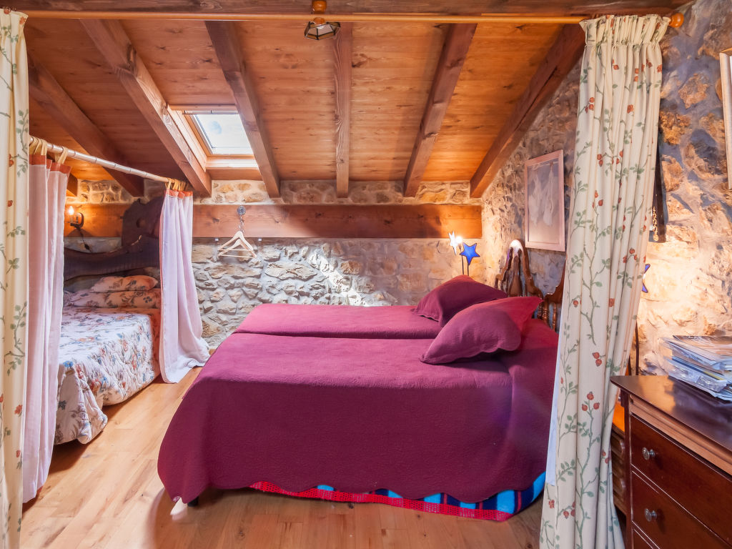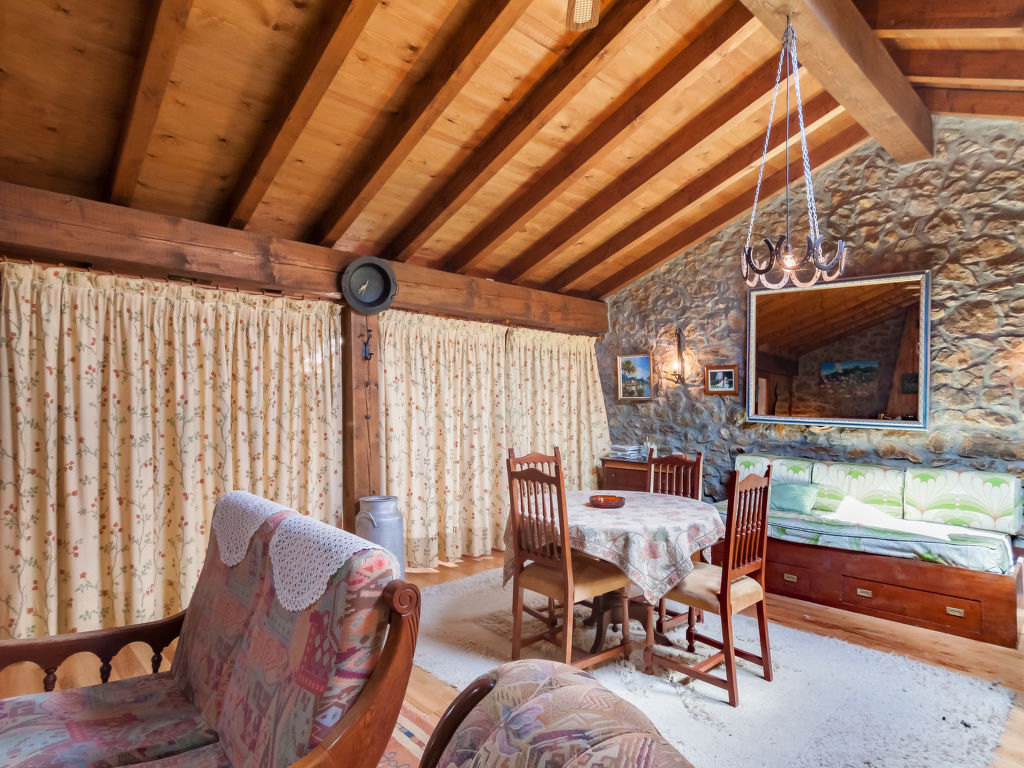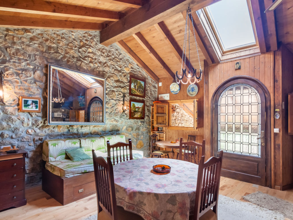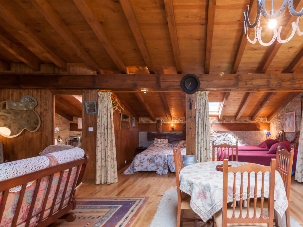 "El Pajar", 3-Zimmer-Haus 80 m2 im 1. Stock. Rustikal eingerichtet: Wohn-/Esszimmer mit offenem Kamin und Digital-TV. Ausgang zum Balkon. 2 Zimmer mit Vorhang, jedes Zimmer mit 2 Betten (80 cm, Länge 185 cm). Offene Küche (Backofen, 2 Glaskeramikherd Platten, Mikrowelle, Tiefkühler) mit Esstisch. Dusche/WC, Hydromassage-Dusche. Holzheizung. Grosse Laube. Terrassenmöbel, Loggia. Sicht auf die Berge und den Fluss. Zur Verfügung: Waschmaschine, Bügeleisen, Haartrockner. Typisch rustikales Haus, vollständig renoviert. Es befindet sich innerhalb eines charmanten Anwesens von 2 ha mit einem Fluss (dort können Sie Forellen angeln), der da durchfliesst. Ideale Ausgangslage, um sich zu entspannen. Die Terrasse erstreckt sich über die gesamte untere Etage. R000000001