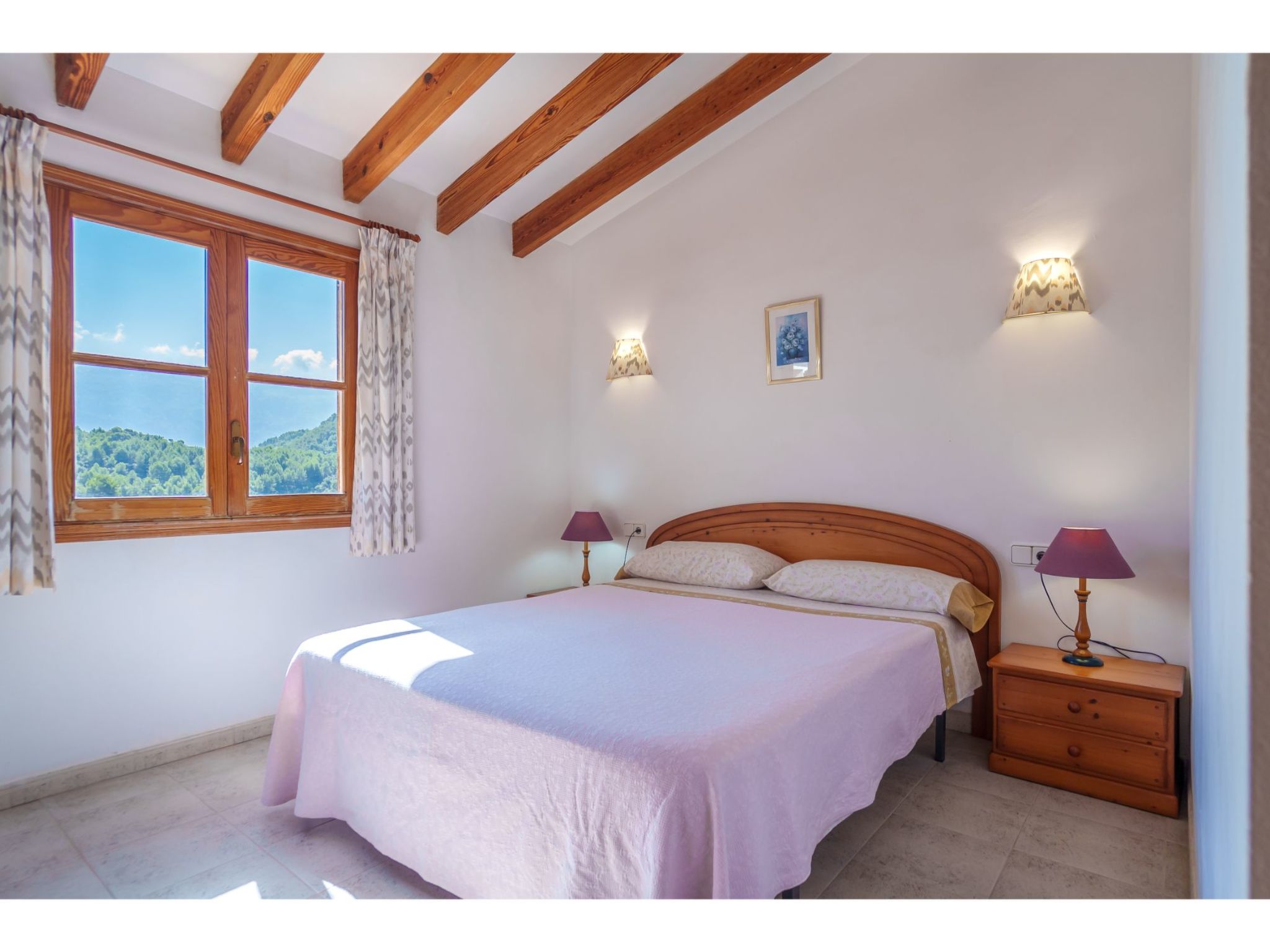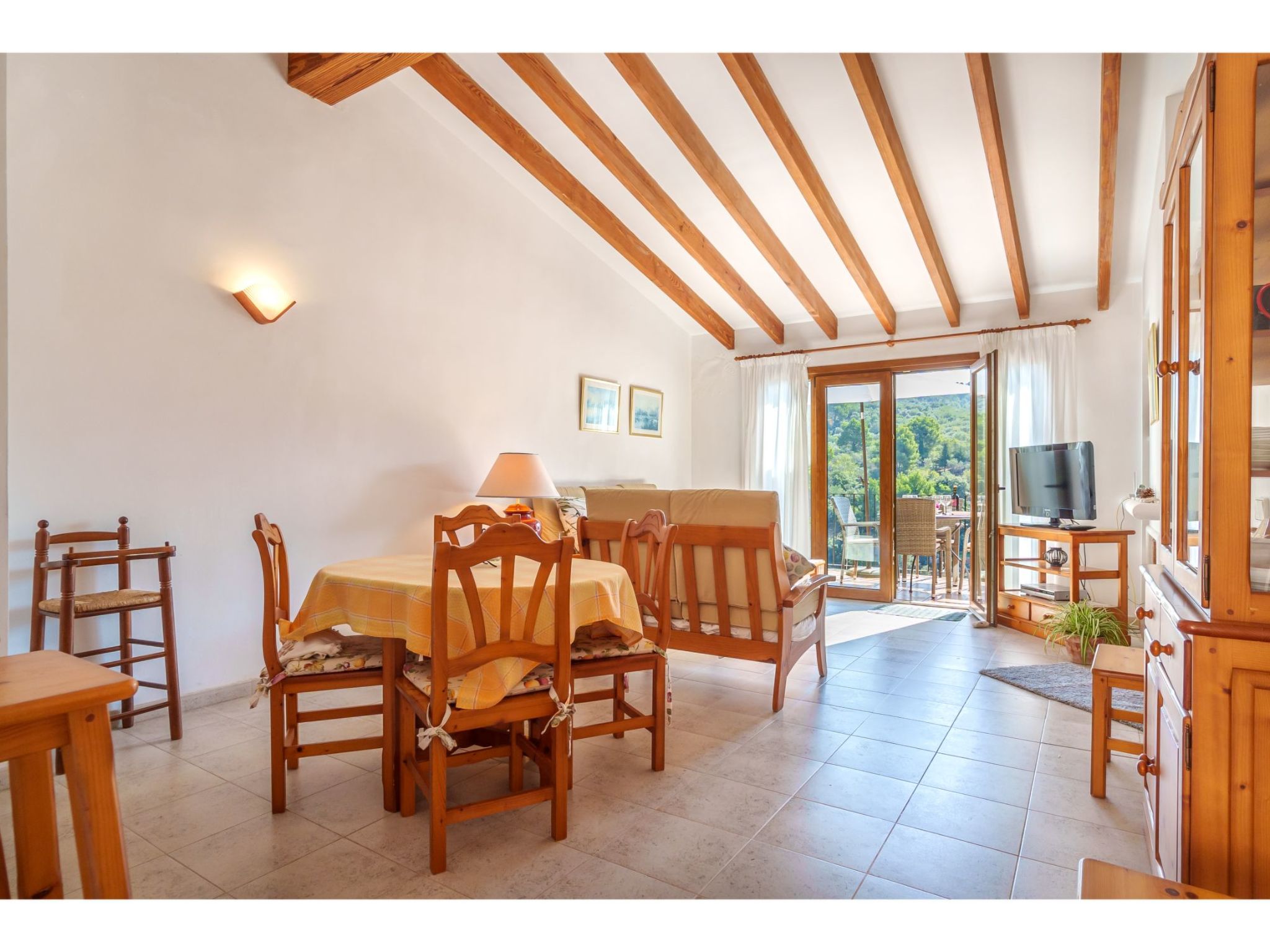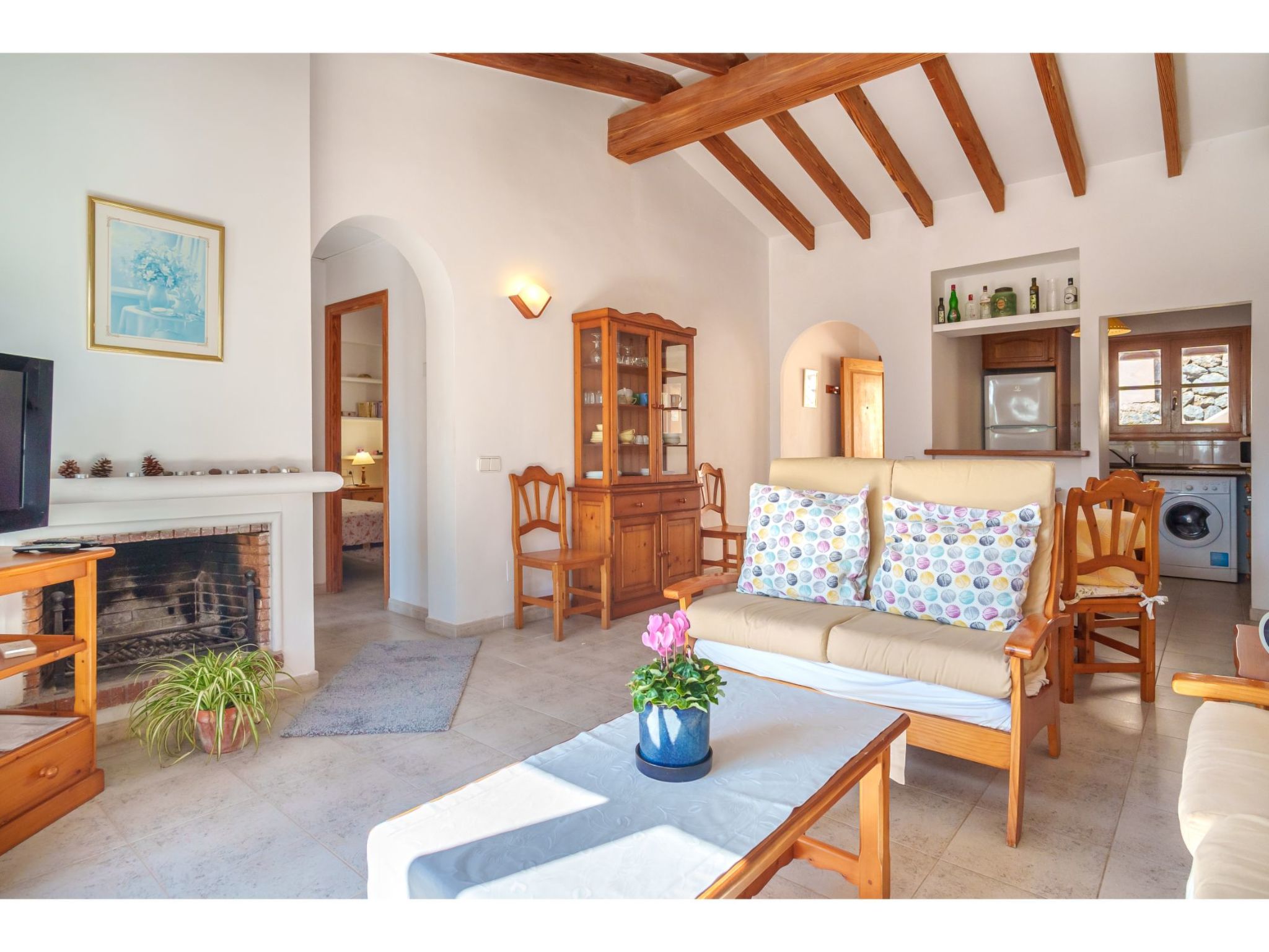 "S'Atalaia Sea Views", 3-Zimmer-Wohnung 75 m2 im 2. Stock. Objekt geeignet für 4 Erwachsene. Zweckmässig und gemütlich eingerichtet: Wohn-/Esszimmer mit Esstisch, Sat-TV und E-Heizofen. Ausgang zum Balkon. 1 Zimmer mit 2 Betten und E-Heizofen. 1 Zimmer mit 1 franz. Bett (160 cm), E-Heizofen. Ausgang zur Terrasse, Richtung Süden. Offene Küche (Backofen, Tiefkühler, elektrische Kaffeemaschine). Bad/Bidet/WC. Balkon 7 m2. Terrassenmöbel. Panoramasicht auf das Meer, die Berge und die Ortschaft. Zur Verfügung: Waschmaschine. Parkplatz (eingezäunt). Geeignet für Familien. ETVPL12816