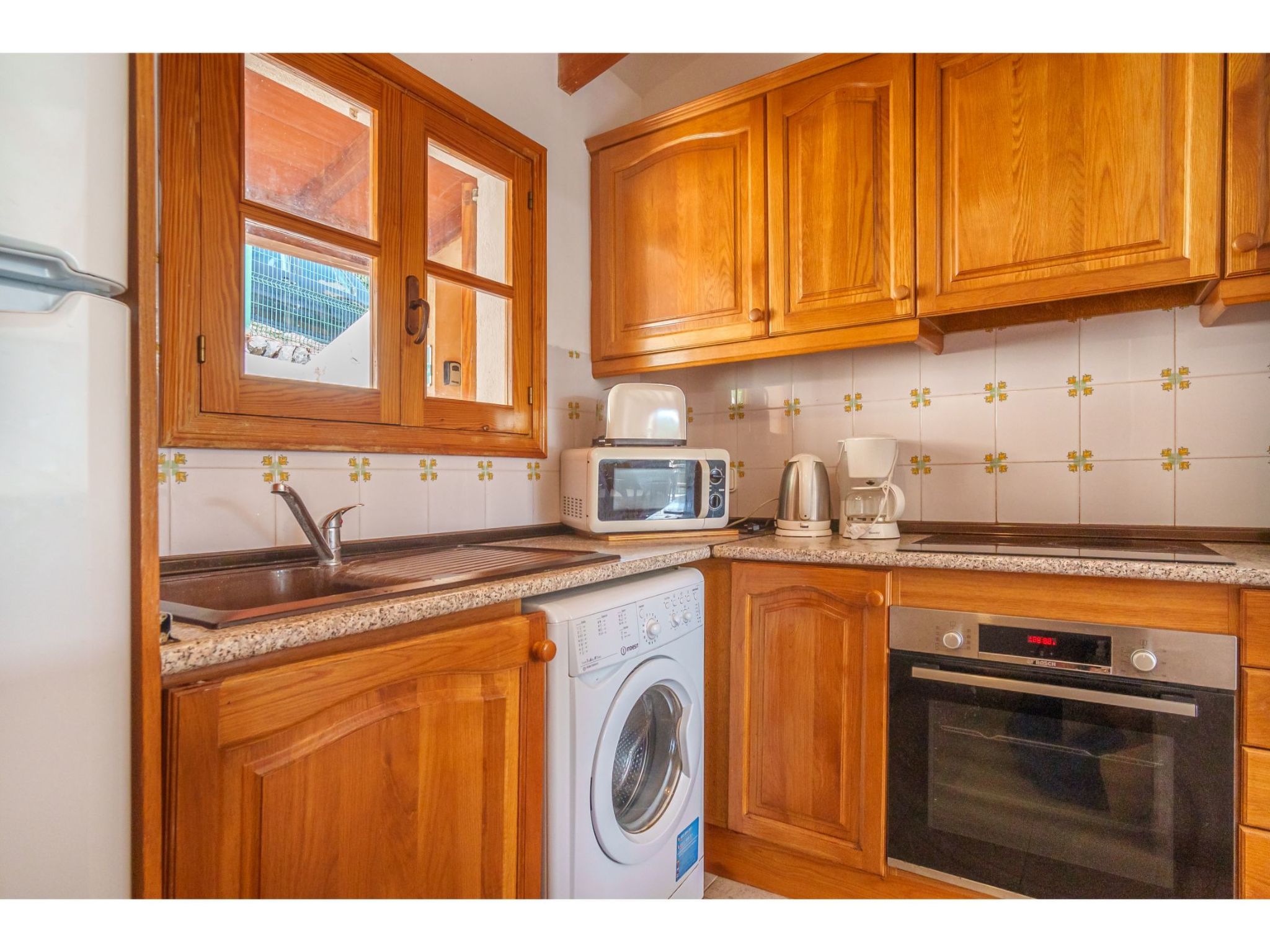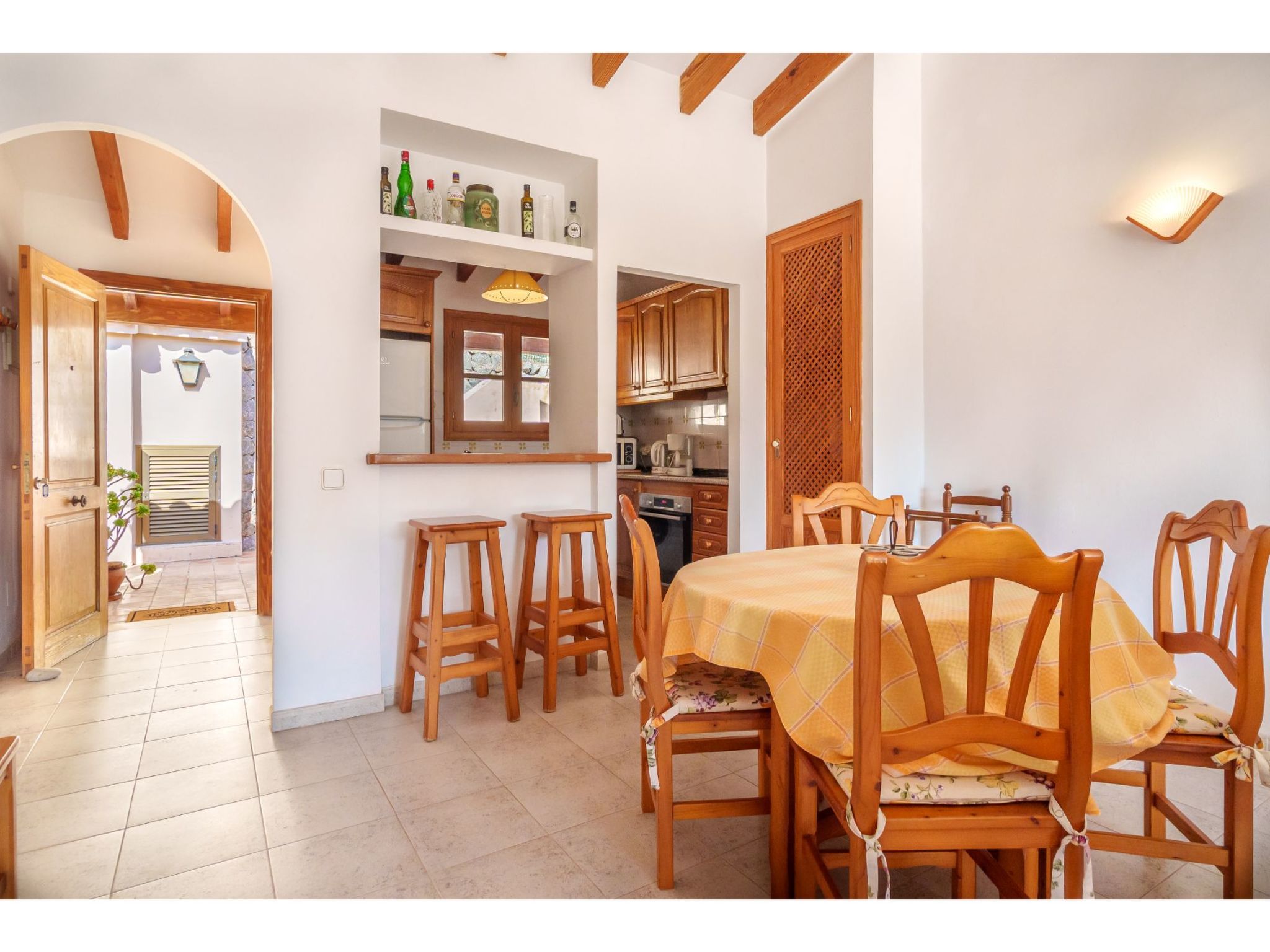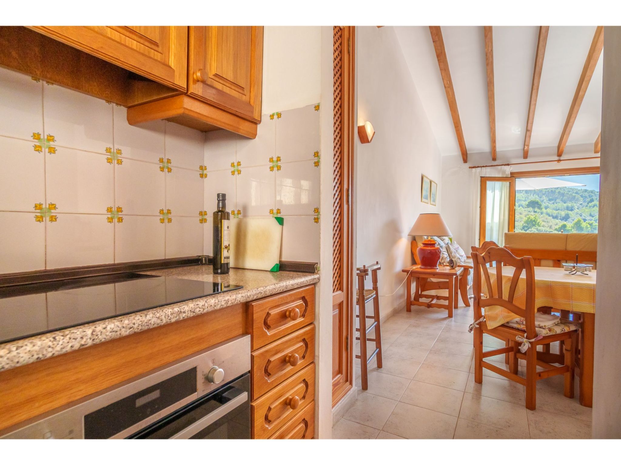 "S'Atalaia Sea Views", 3-Zimmer-Wohnung 75 m2 im 2. Stock. Objekt geeignet für 4 Erwachsene. Zweckmässig und gemütlich eingerichtet: Wohn-/Esszimmer mit Esstisch, Sat-TV und E-Heizofen. Ausgang zum Balkon. 1 Zimmer mit 2 Betten und E-Heizofen. 1 Zimmer mit 1 franz. Bett (160 cm), E-Heizofen. Ausgang zur Terrasse, Richtung Süden. Offene Küche (Backofen, Tiefkühler, elektrische Kaffeemaschine). Bad/Bidet/WC. Balkon 7 m2. Terrassenmöbel. Panoramasicht auf das Meer, die Berge und die Ortschaft. Zur Verfügung: Waschmaschine. Parkplatz (eingezäunt). Geeignet für Familien. ETVPL12816
