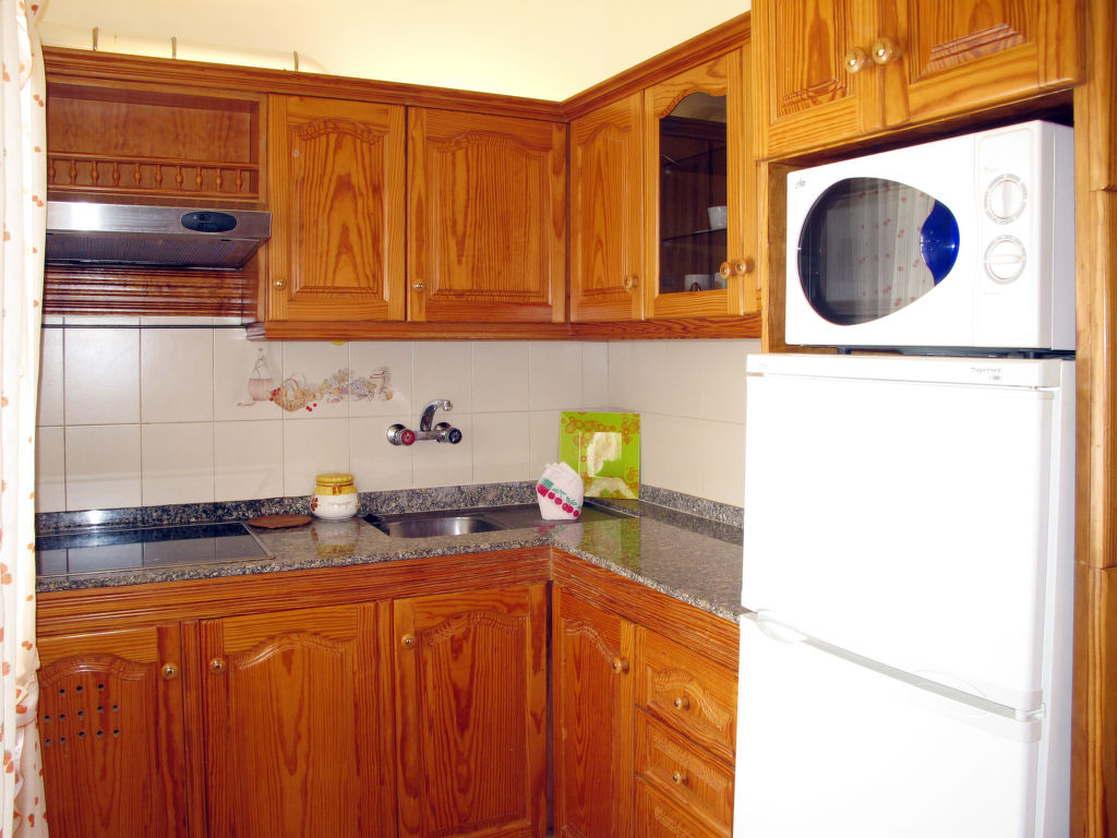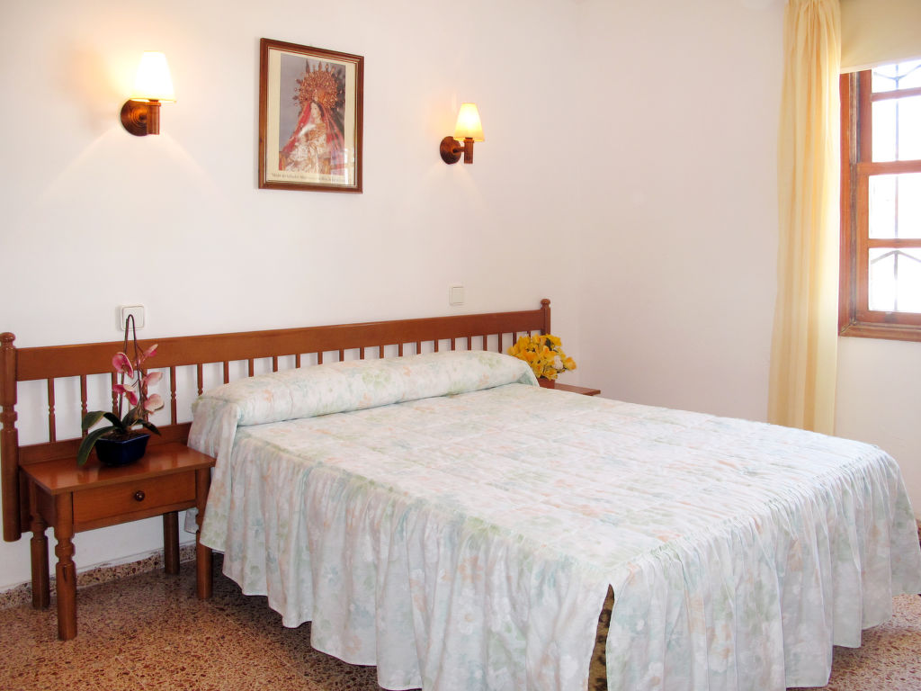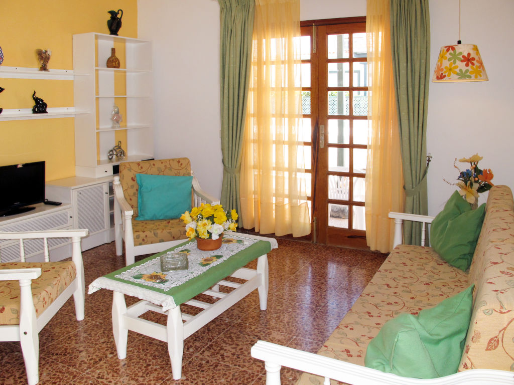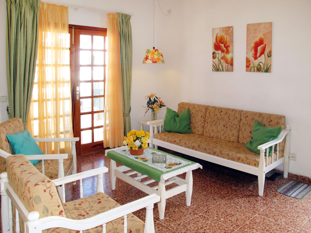 "Virgen del Carmen (ADE101)", 3-Zimmer-Doppelhaushälfte 60 m2. Zweckmässig eingerichtet: Wohn-/Esszimmer mit Esstisch und Sat-TV. Ausgang zur Terrasse. 1 Zimmer mit 1 franz. Bett (150 cm, Länge 190 cm). 1 Zimmer mit 2 Betten (90 cm, Länge 190 cm). Offene Küche (4 Glaskeramikherd Platten, Toaster, Mikrowelle, Tiefkühler, elektrische Kaffeemaschine). Sitzbad/WC. Keine Heizmöglichkeit. Terrasse teilweise überdacht. Terrassenmöbel. Sicht auf das Meer. Zur Verfügung: Waschmaschine, Bügeleisen, Babybett. Internet (Wireless LAN). Bitte beachten: Nichtraucher-Haus. Maximal 1 Haustier/Hund erlaubt.