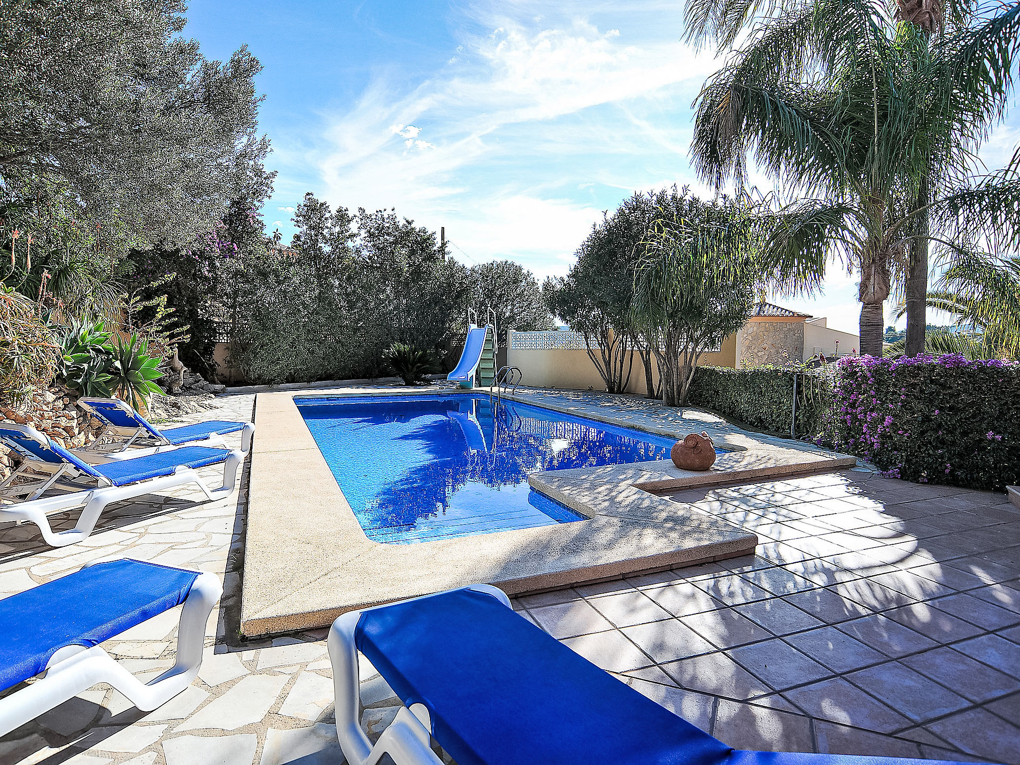 Schöne Villa "Aviles", auf 2 Stockwerken. Im Ortsteil Castellans, ruhige, sonnige Lage, 9 km vom Meer, in einer Sackgasse. Zur Alleinbenutzung: schöner, gepflegter Garten 1'800 m2 (eingezäunt) mit Rasen und Pflanzen, Schwimmbad nicht einsehbar, eingezäunt (4 x 9 m, 01.01.-31.12.) mit Innentreppe. Rutschbahn. Treppenweg (23 Stufen) bis zum Haus. Supermarkt 2 km, Restaurant 1 km, Sandstrand "Arenal" 9 km. Jugendgruppen nur auf Anfrage.