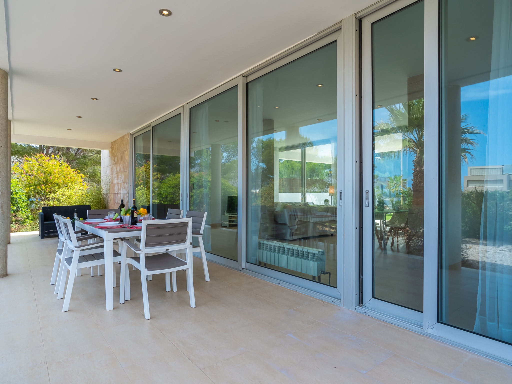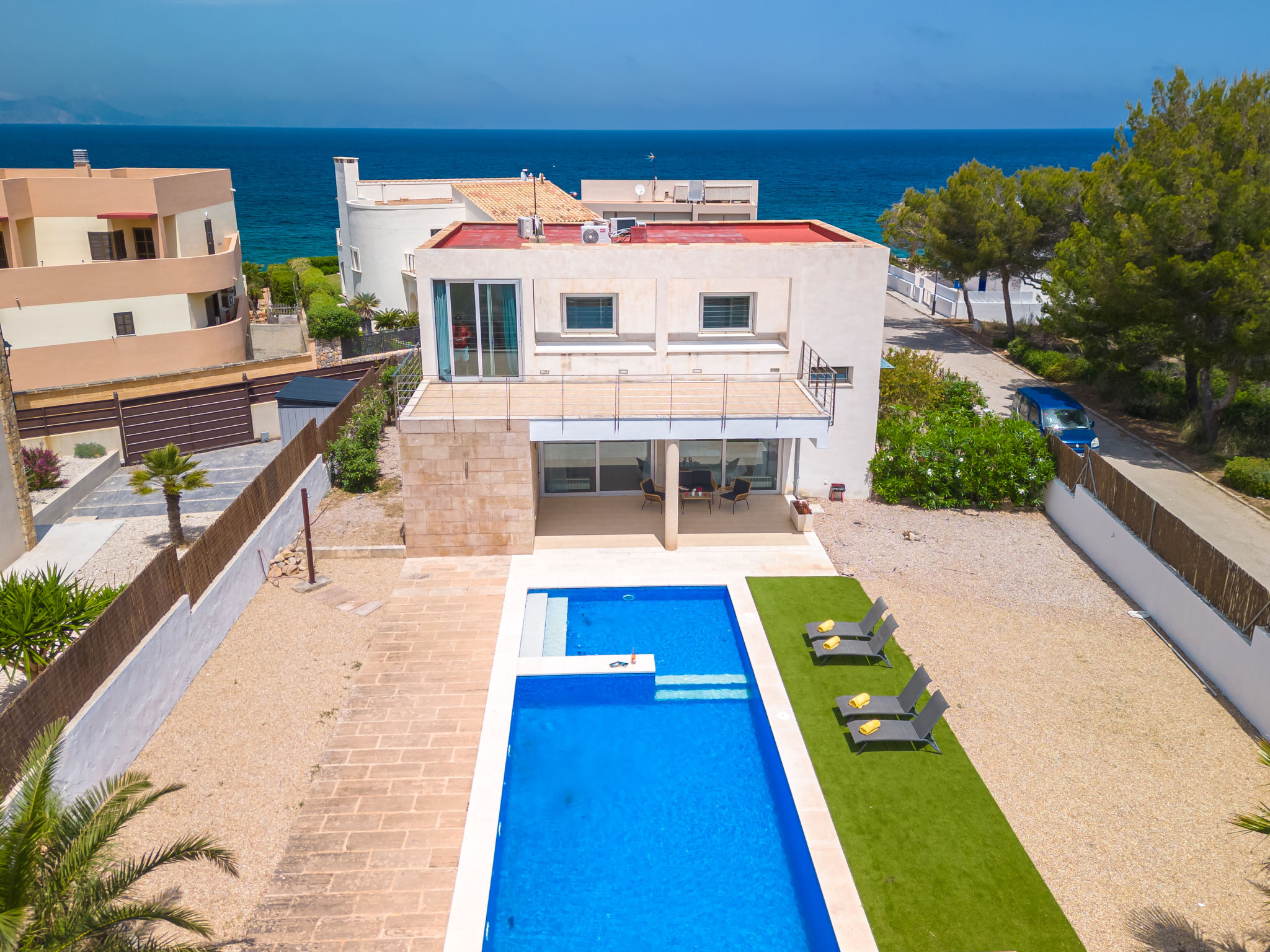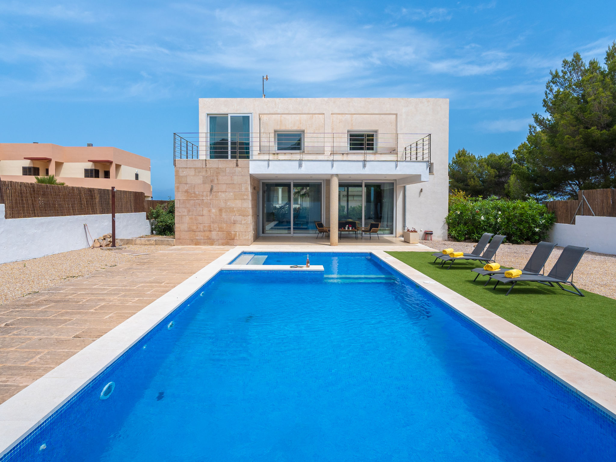 "Villa Carme", 5-Zimmer-Villa. Objekt geeignet für 6 Erwachsene. Zweckmässig und komfortabel eingerichtet: Wohn-/Esszimmer mit Panoramafenster mit Sat-TV, Digital-TV, Flachbildschirm, Klimaanlage und Warmluftheizung. Ausgang zum Gartensitzplatz, zum Schwimmbad. Offene Küche (Backofen, Geschirrspüler, 4 Glaskeramikherd Platten, Mikrowelle, Tiefkühler, elektrische Kaffeemaschine). Ausgang zum Gartensitzplatz, zum Schwimmbad. Obergeschoss: 1 grosses Doppelzimmer mit Panoramafenster mit 2 Betten (90 cm, Länge 190 cm), Klimaanlage und Warmluftheizung. 1 grosses Doppelzimmer mit Panoramafenster mit 1 Bett (150 cm, Länge 190 cm), Klimaanlage und Warmluftheizung. Ausgang zur Terrasse. 1 grosses Doppelzimmer mit Panoramafenster mit 1 Bett (150 cm, Länge 190 cm), Klimaanlage und Warmluftheizung. 2 Bäder/Duschen/WC. Grosser Gartensitzplatz, Rasen. Terrassenmöbel, Liegestühle (4), Loggia, Abstellkammer. Panoramasicht auf die Berge, die Landschaft und das Meer. Zur Verfügung: Waschmaschine, Bügeleisen, Kinderhochstuhl, Babybett bis 2 Jahre, Haartrockner. Internet (Wireless LAN, gratis). Geeignet für Familien. ETV13858