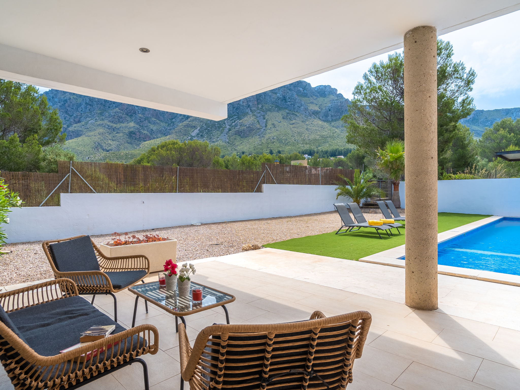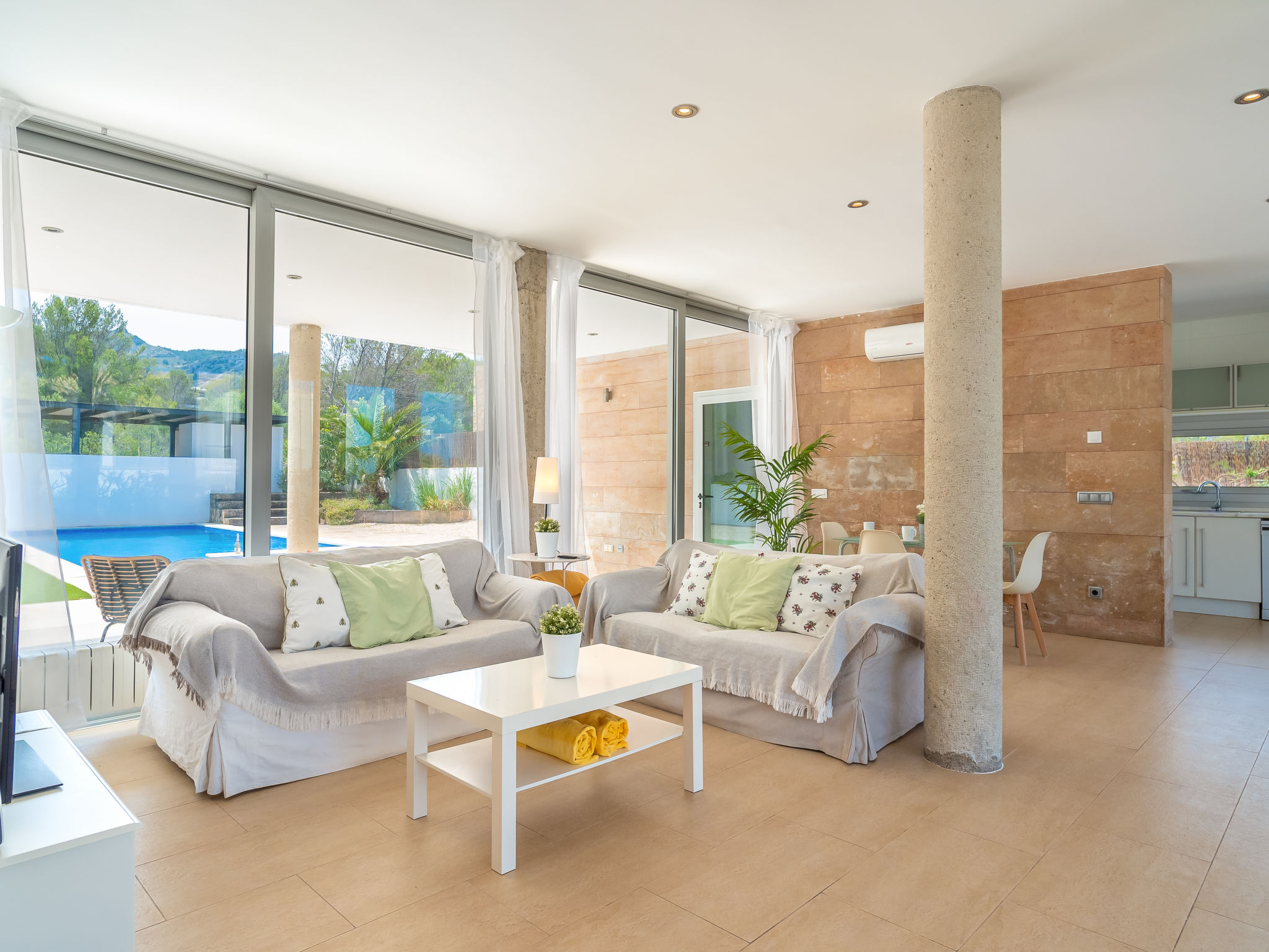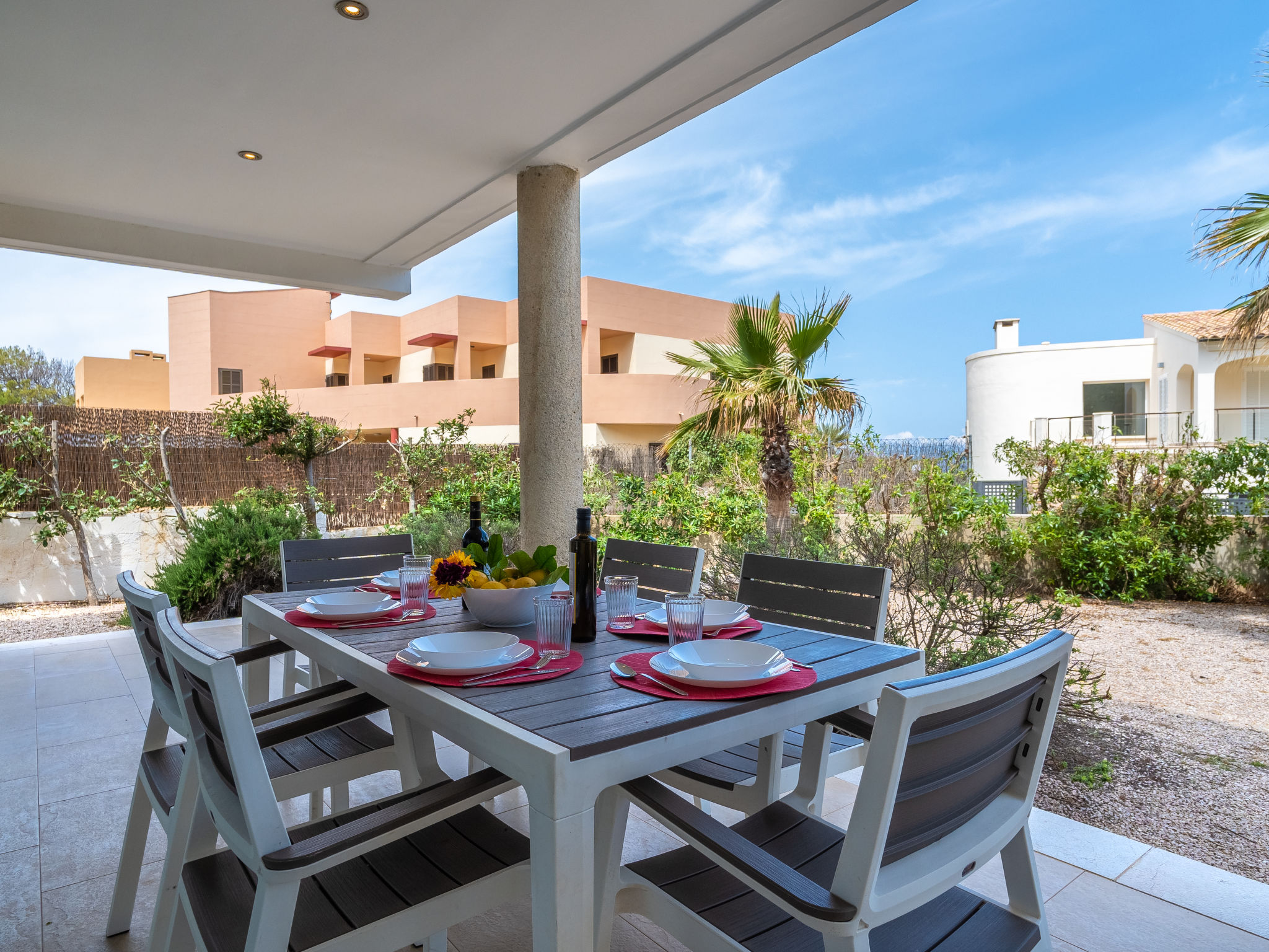 "Villa Carme", 5-Zimmer-Villa. Objekt geeignet für 6 Erwachsene. Zweckmässig und komfortabel eingerichtet: Wohn-/Esszimmer mit Panoramafenster mit Sat-TV, Digital-TV, Flachbildschirm, Klimaanlage und Warmluftheizung. Ausgang zum Gartensitzplatz, zum Schwimmbad. Offene Küche (Backofen, Geschirrspüler, 4 Glaskeramikherd Platten, Mikrowelle, Tiefkühler, elektrische Kaffeemaschine). Ausgang zum Gartensitzplatz, zum Schwimmbad. Obergeschoss: 1 grosses Doppelzimmer mit Panoramafenster mit 2 Betten (90 cm, Länge 190 cm), Klimaanlage und Warmluftheizung. 1 grosses Doppelzimmer mit Panoramafenster mit 1 Bett (150 cm, Länge 190 cm), Klimaanlage und Warmluftheizung. Ausgang zur Terrasse. 1 grosses Doppelzimmer mit Panoramafenster mit 1 Bett (150 cm, Länge 190 cm), Klimaanlage und Warmluftheizung. 2 Bäder/Duschen/WC. Grosser Gartensitzplatz, Rasen. Terrassenmöbel, Liegestühle (4), Loggia, Abstellkammer. Panoramasicht auf die Berge, die Landschaft und das Meer. Zur Verfügung: Waschmaschine, Bügeleisen, Kinderhochstuhl, Babybett bis 2 Jahre, Haartrockner. Internet (Wireless LAN, gratis). Geeignet für Familien. ETV13858