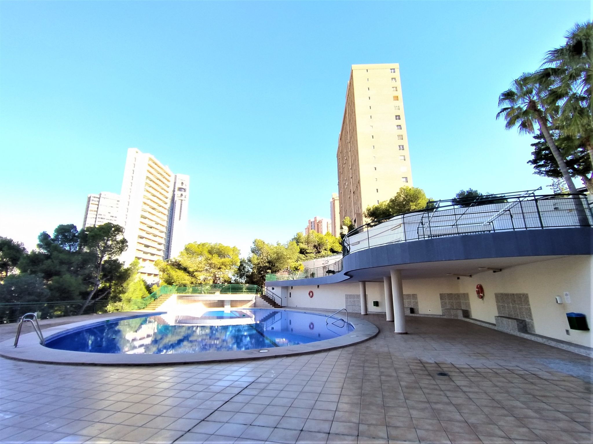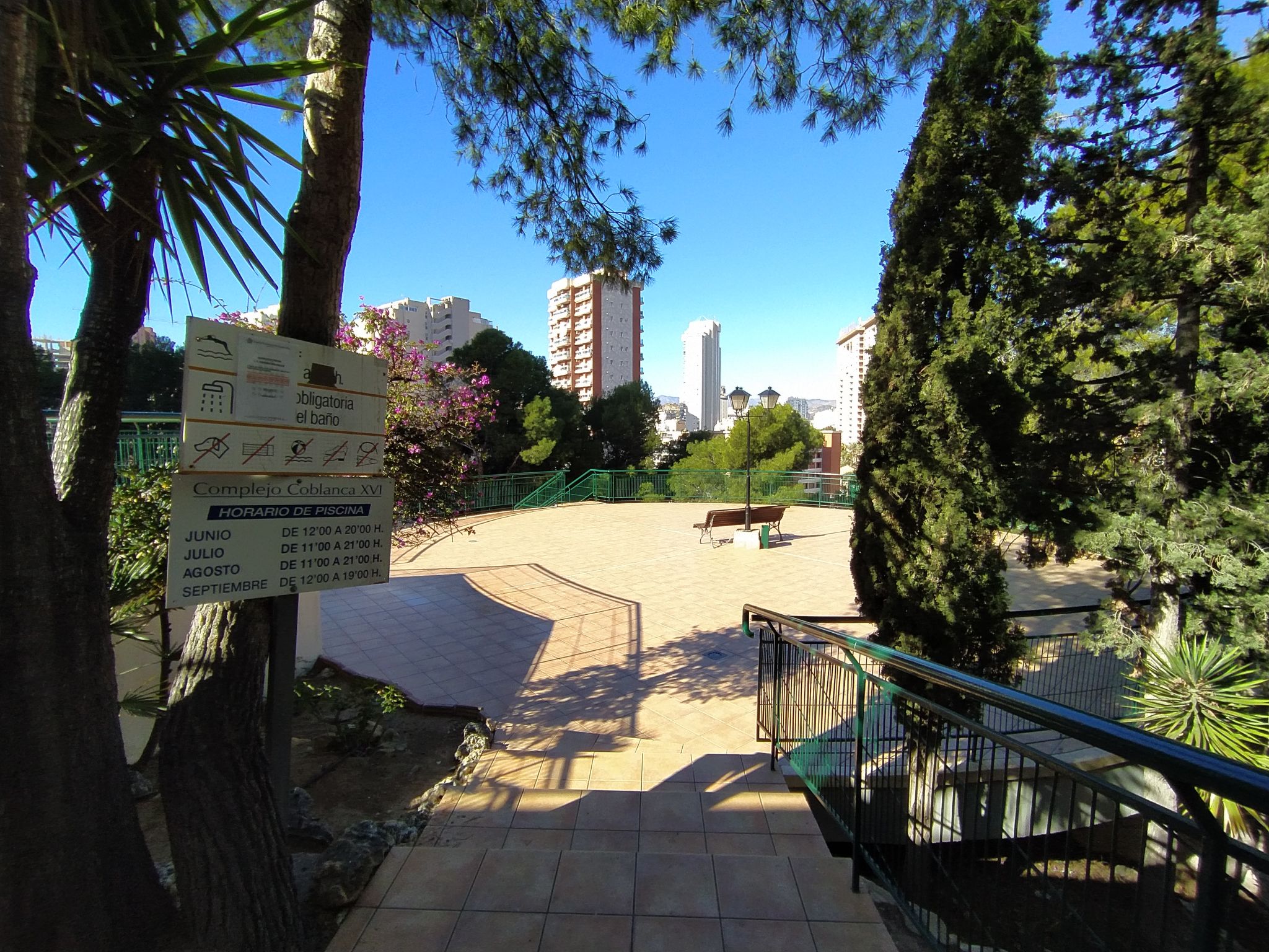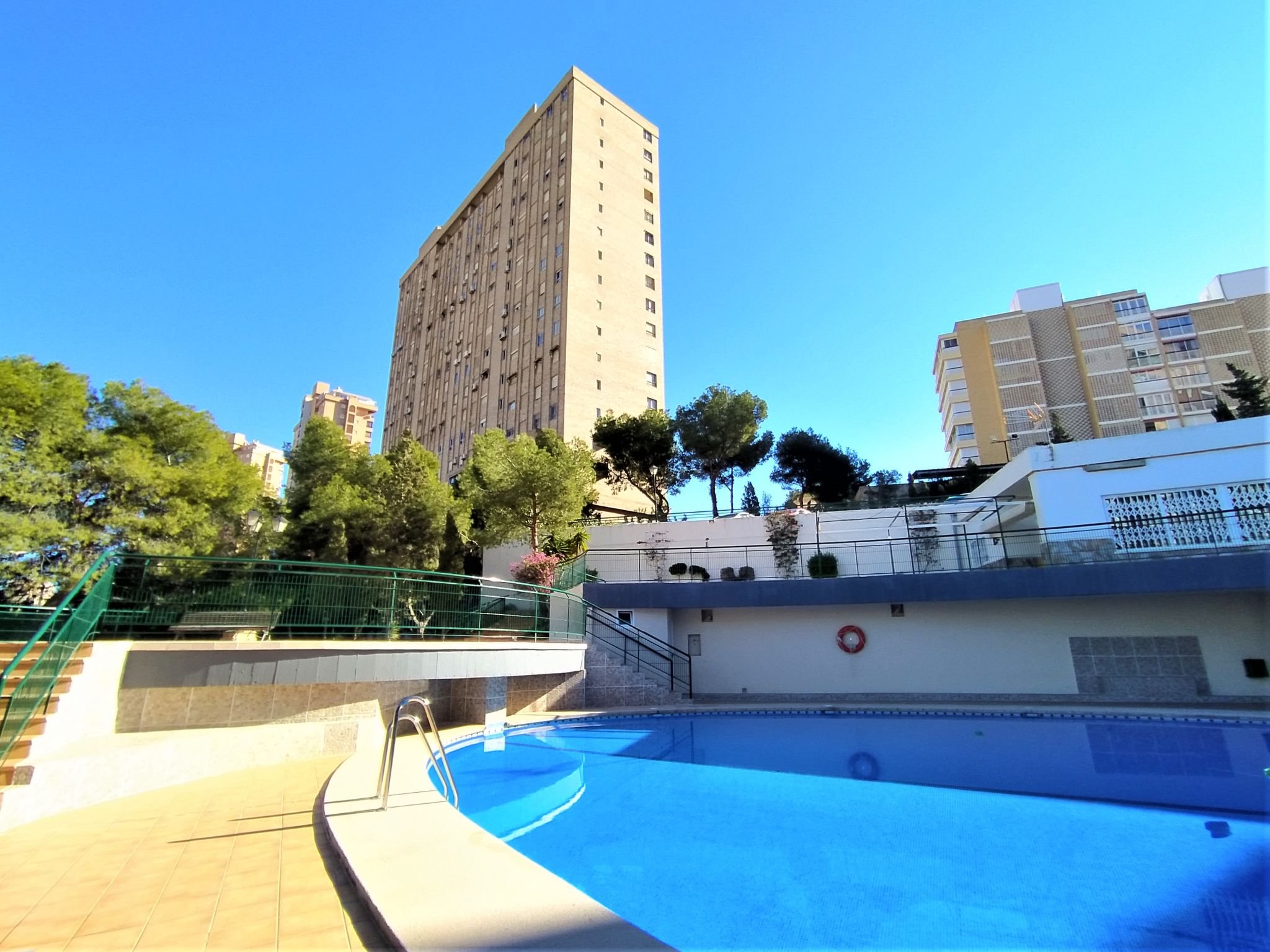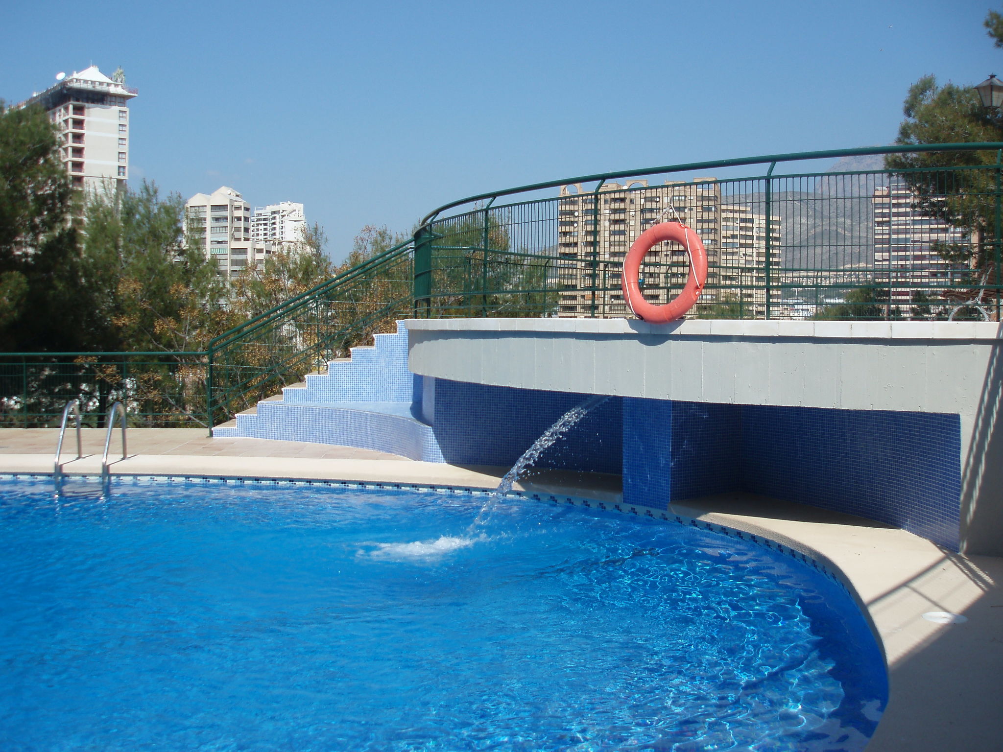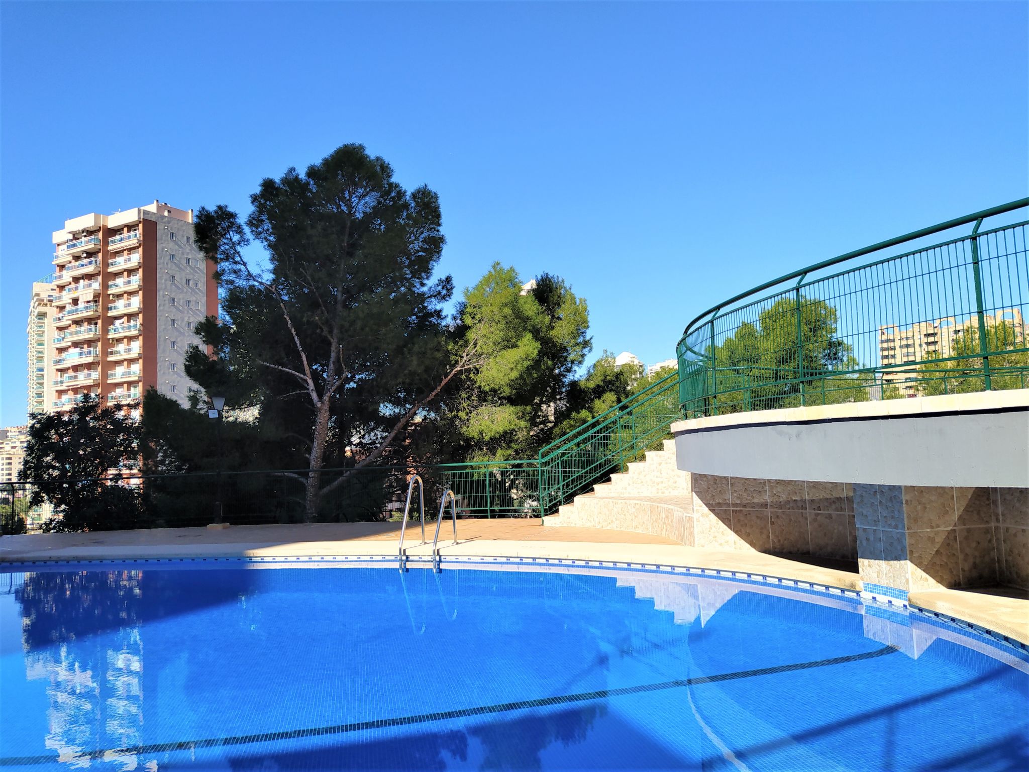 Playa de Poniente: Grosses, komfortables Appartementhaus "Coblanca XVI", auf 16 Stockwerken, umgeben von Bäumen. Im Ort, 2 km vom Zentrum von Benidorm, im Bezirk Playa Poniente, ruhige, sonnige, erhöhte Lage, 400 m vom Meer, 400 m vom Strand, Richtung Osten. Zur Mitbenutzung: Grundstück (eingezäunt), schöner Terrassengarten Pflanzen und Bäumen, Naturgarten 800 m2 (eingezäunt), Schwimmbad (6 x 10 m, saisonale Verfügbarkeit: 01.Jan.-31.Dez.). Kinderbecken, Aussendusche, Tennis (extra). In der Anlage: Restaurant, Bar, Fahrstuhl. Parkplatz (beschränkte Anzahl). Einkaufsgeschäft 500 m, Supermarkt 400 m, Einkaufszentrum, Restaurant 500 m, Bar, Café 100 m, Bushaltestelle "Benidorm" 400 m, Bahnstation "Benidorm" 4 km. Golfplatz (18 Loch) 4 km, Wanderwege ab Haus 600 m. Nahe gelegene Sehenswürdigkeiten: Benidorm Palace 7 km, Aqualandia 7 km, Mundomar 7 km, Terra Mitica 4 km, Terra Natura 4 km, Alicante 40 km. Bitte beachten: Babyausstattung auf Anfrage.
