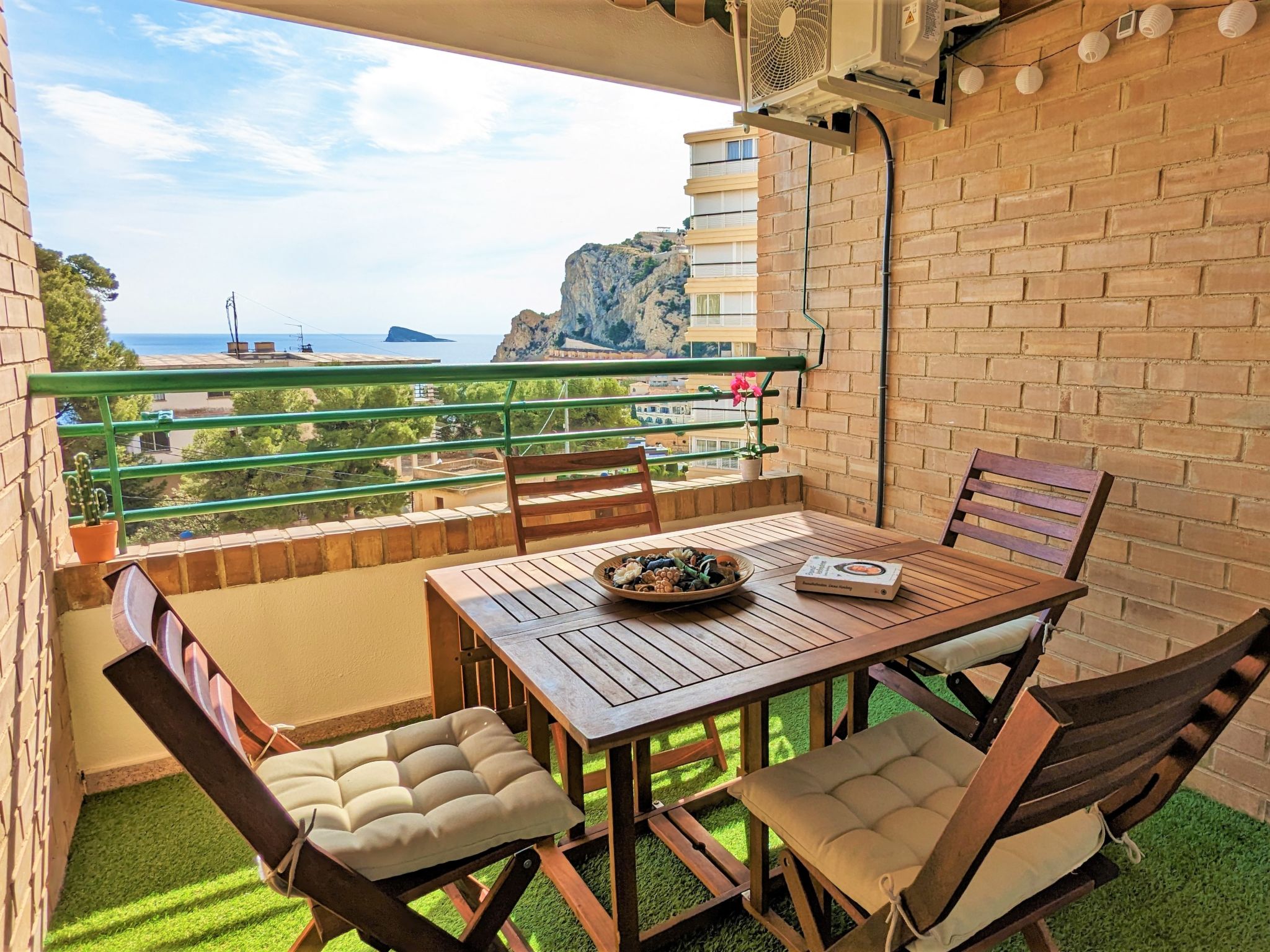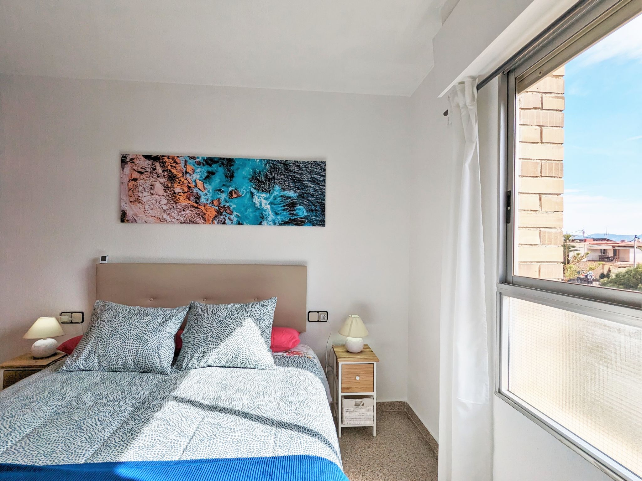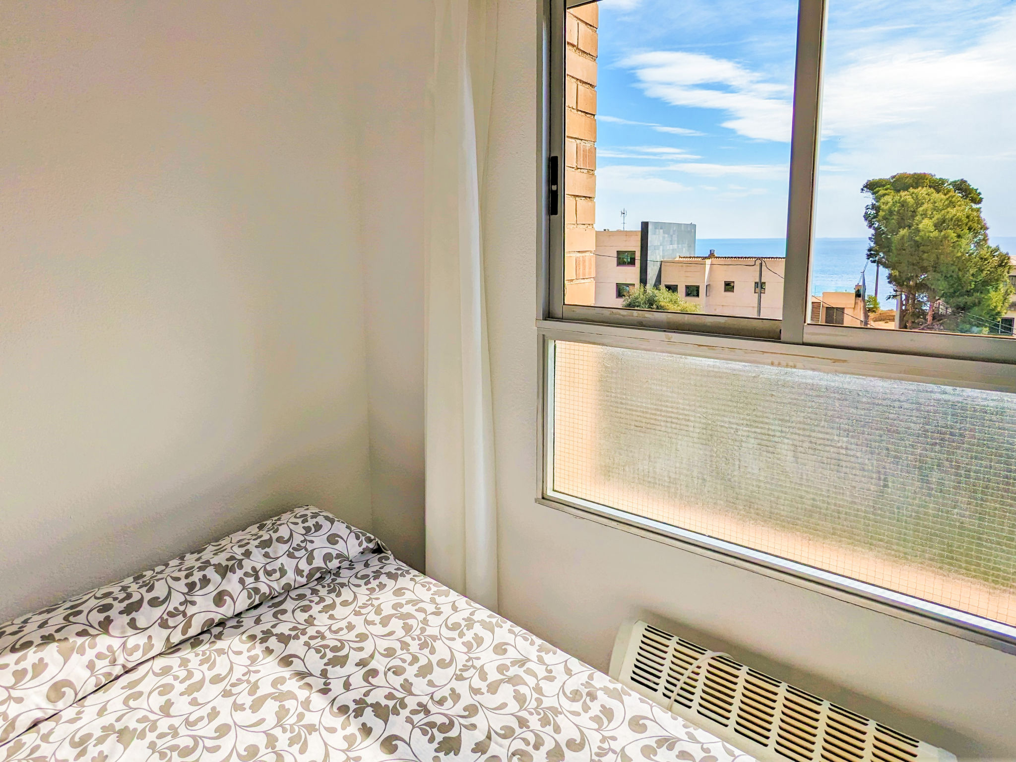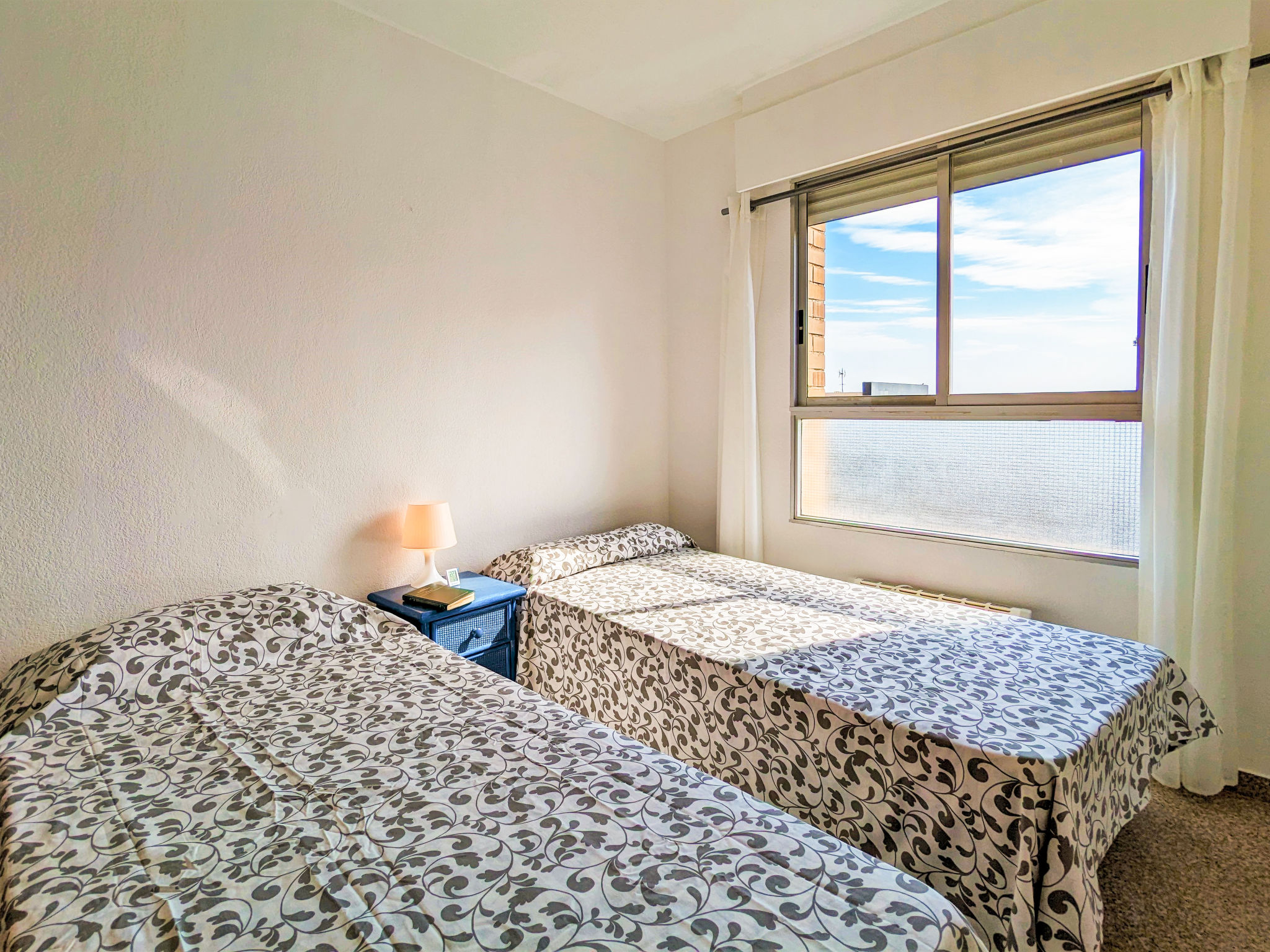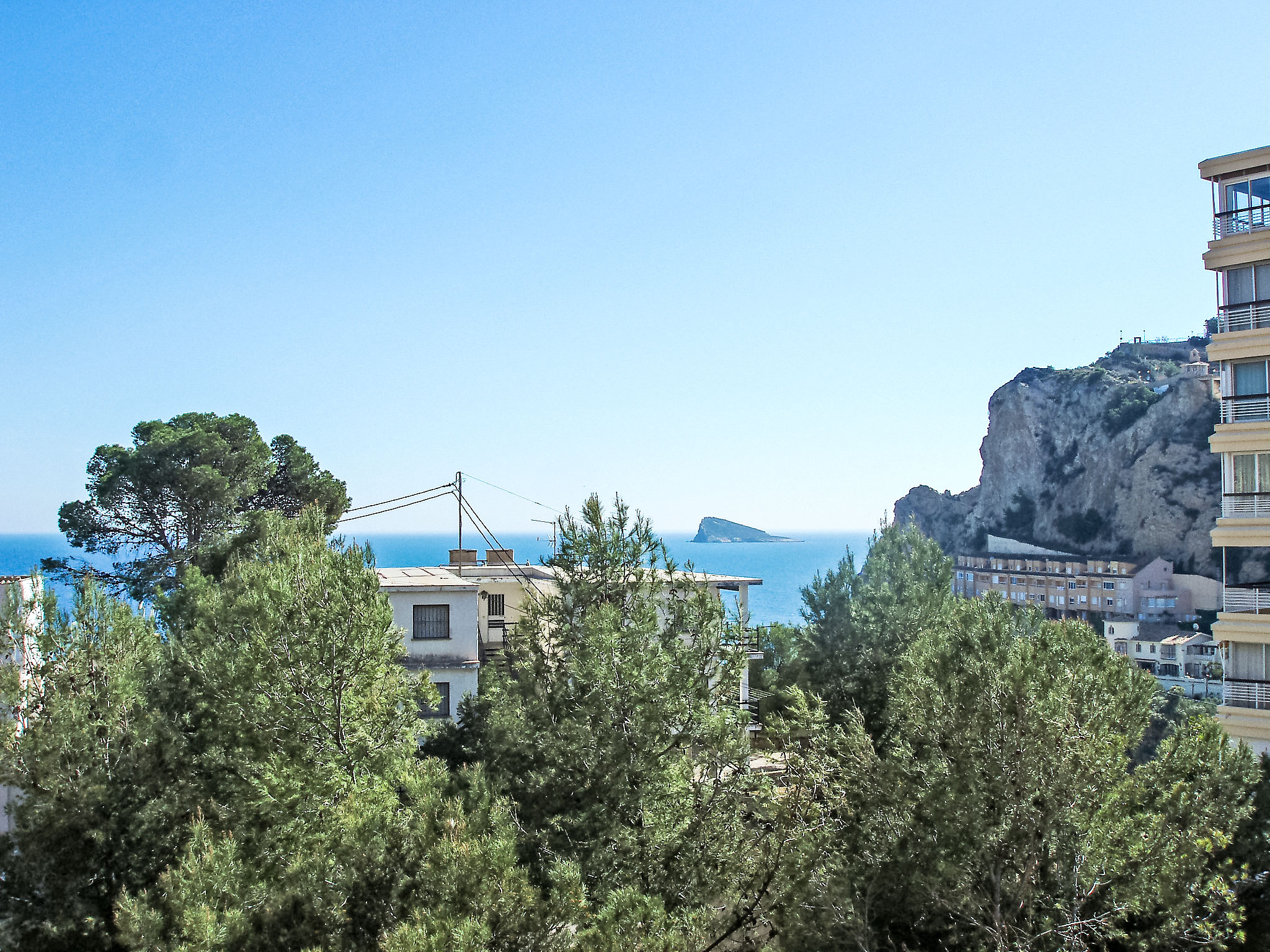 "Coblanca XVI", 3-Zimmer-Wohnung 38 m2 im 4. Stock, Ostlage. Geräumig und hell, komfortabel eingerichtet: Wohn-/Esszimmer mit Digital-TV, E-Heizung und Ventilator. Ausgang zur Terrasse. 1 Zimmer mit 2 Betten und Ventilator. 1 Zimmer mit 1 franz. Bett und Ventilator. Küche (Backofen, 4 Glaskeramikherd Platten, Toaster, Wasserkocher, Mikrowelle, Tiefkühler, elektrische Kaffeemaschine). Bad/Bidet/WC. Boiler (50 Liter). Kleine Terrasse. Terrassenmöbel. Fernsicht auf das Meer, die Berge, den Garten und die Ortschaft. Zur Verfügung: Waschmaschine, Bügeleisen, Haartrockner. Parkplatz. 1 kleines Haustier/Hund erlaubt. AT320309BM