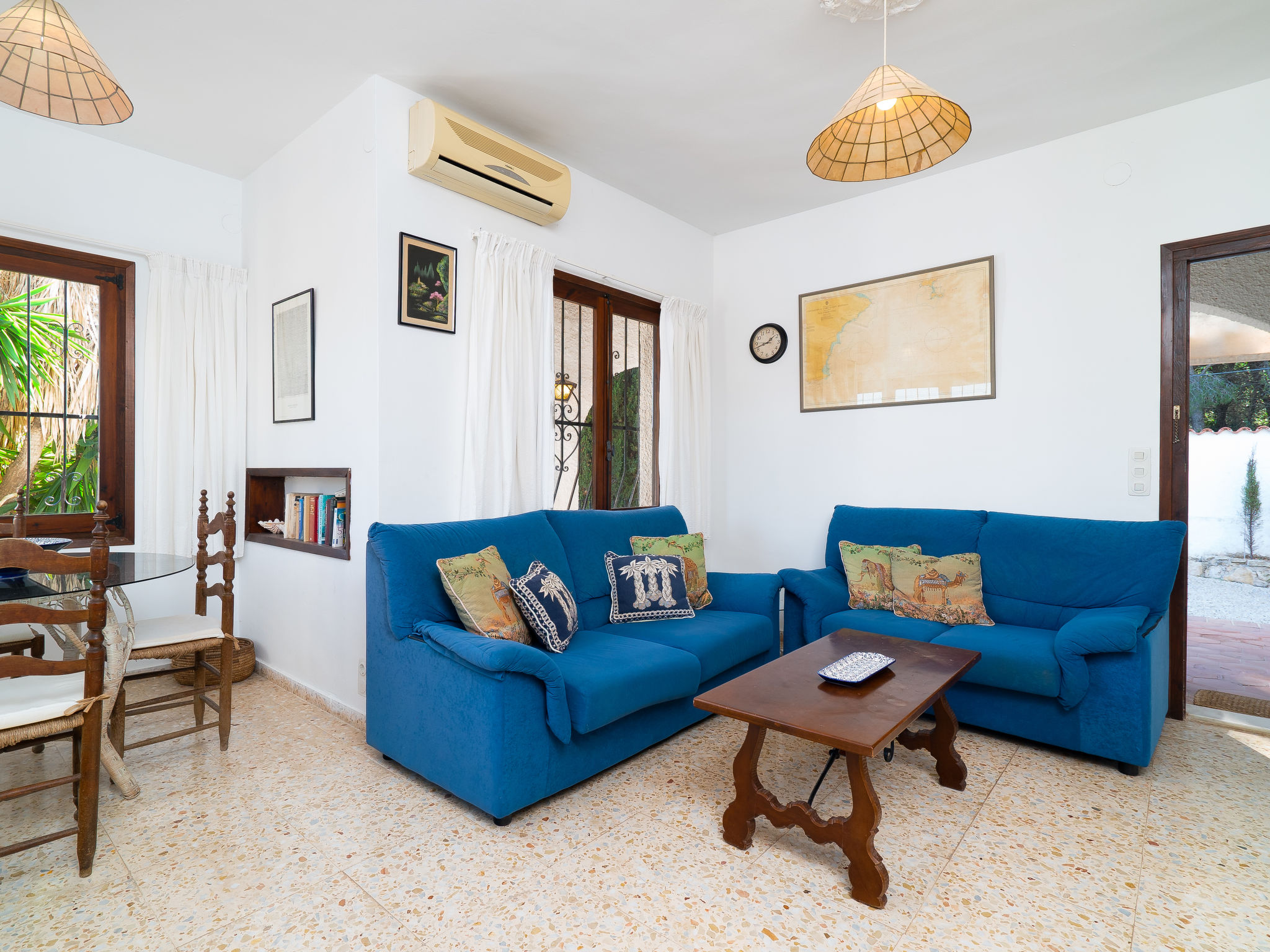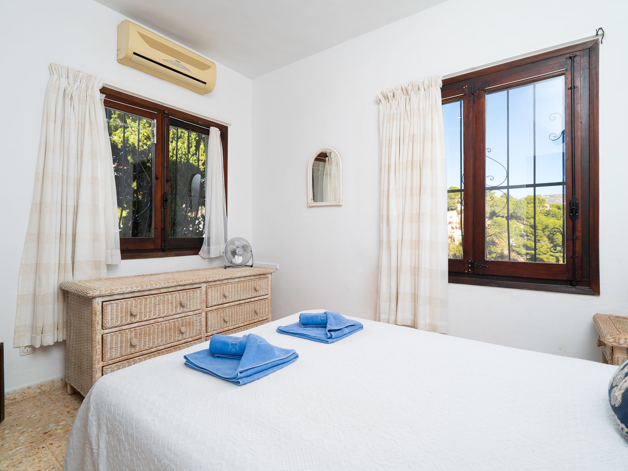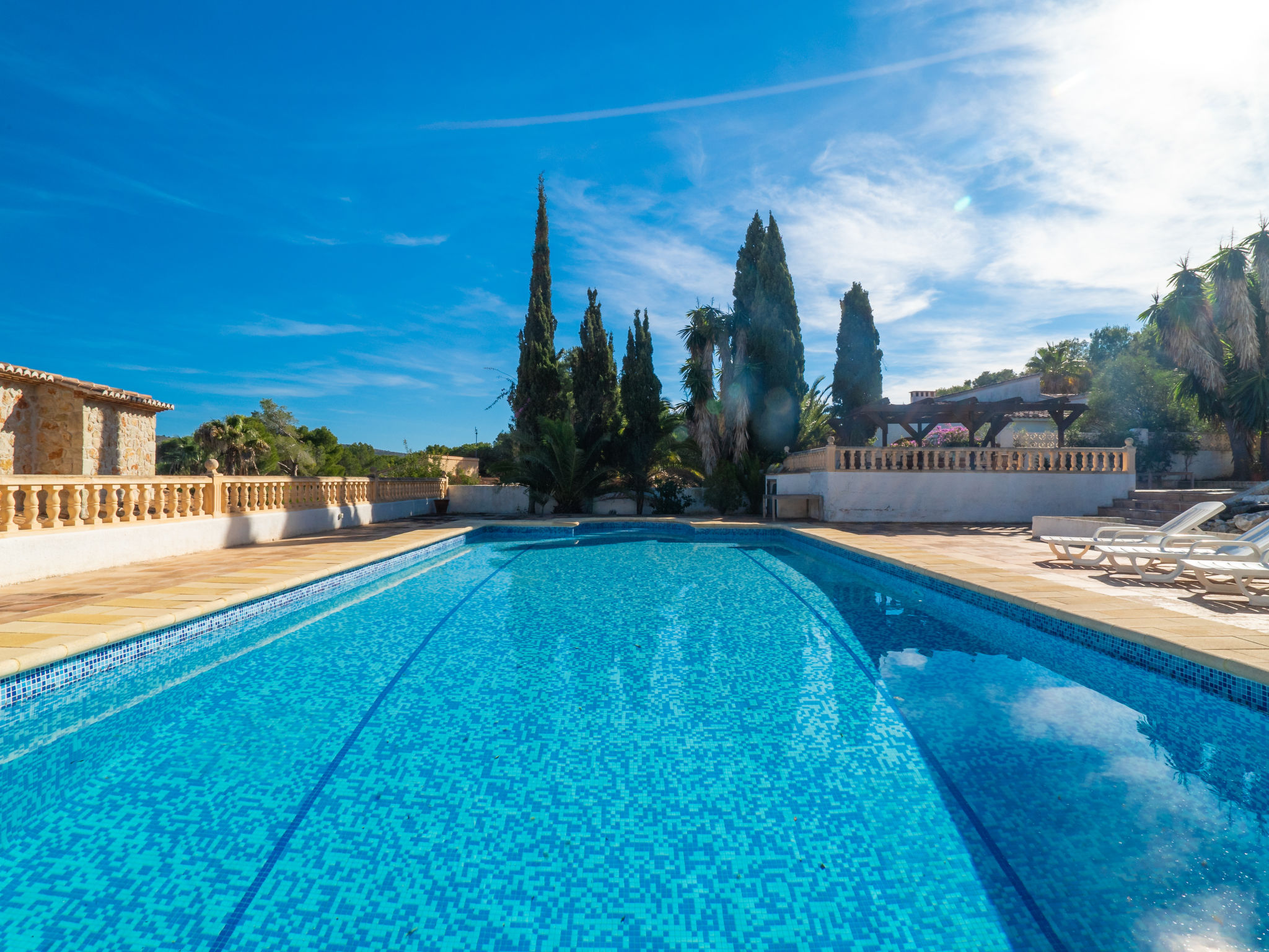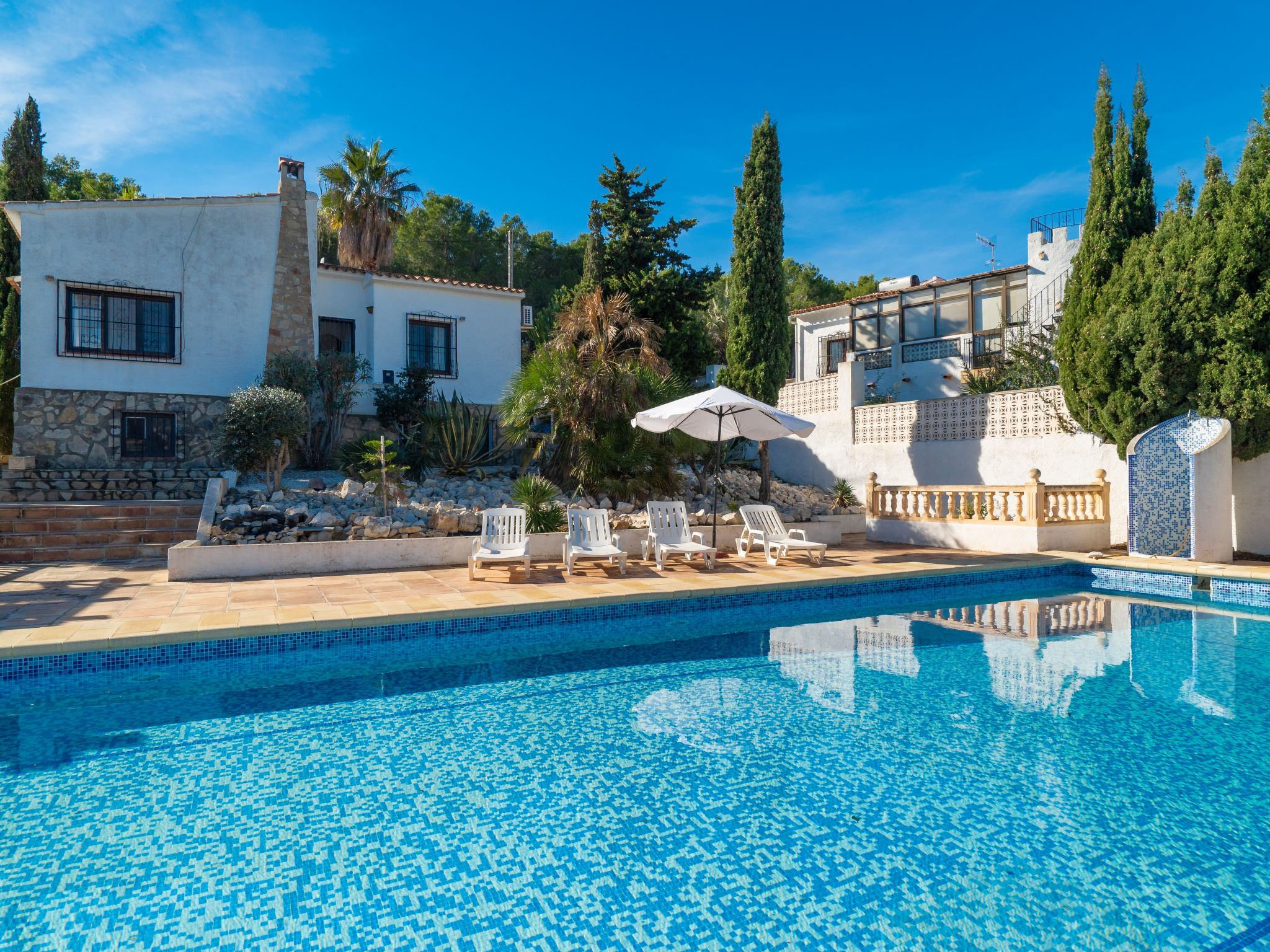 Gemütliches, rustikales Haus "Sunshine", auf 2 Stockwerken. 1.5 km vom Zentrum von Moraira, ruhige, sonnige Lage in einem Wohnquartier, 1.5 km vom Meer, 1.5 km vom Strand, in einer Sackgasse. Zur Alleinbenutzung: Grundstück 900 m2 (eingezäunt), Garten Pflanzen und Blumen, Schwimmbad eckig (9 x 11 m, 01.01.-31.12.) mit Innentreppe. Aussendusche, Grill. Im Hause: Sonnenterrasse, Klimaanlage. Parkplatz auf dem Grundstück. Einkaufsgeschäft 1.5 km, Supermarkt 1.5 km, Restaurant 500 m, Bar 900 m. Bitte beachten: geeignet für Familien, geeignet für Senioren.