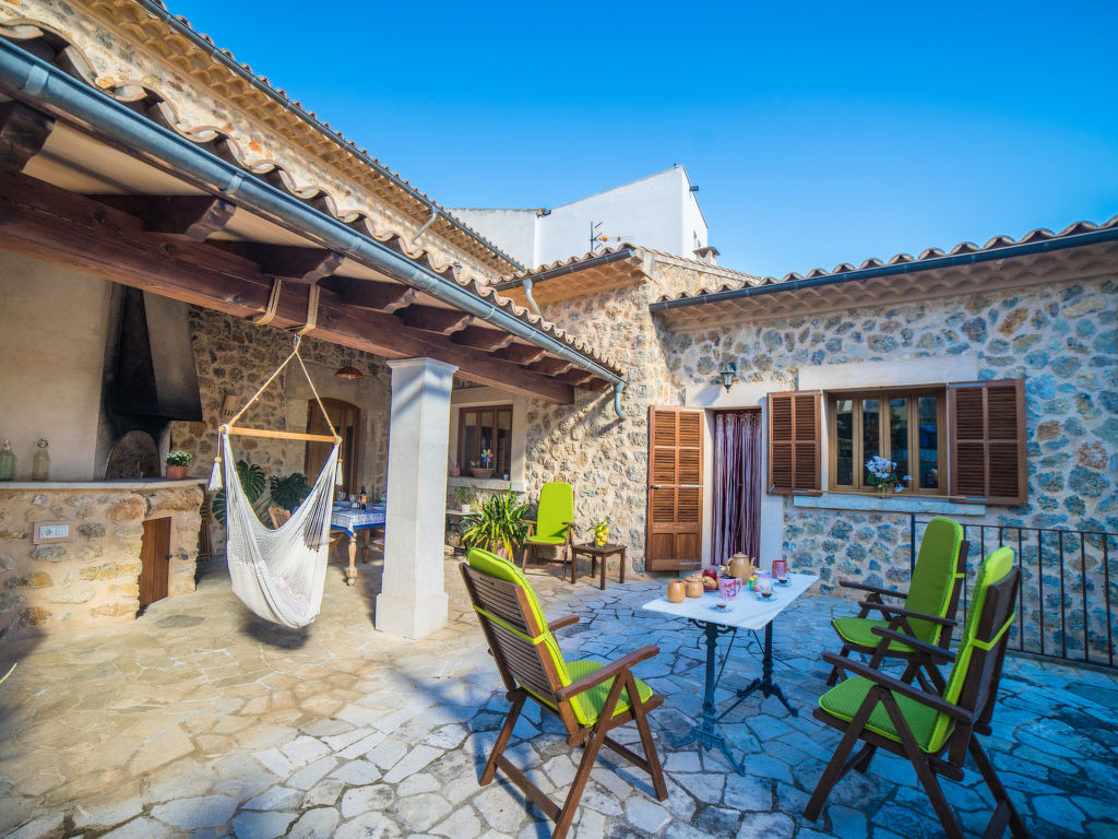 "Son Trobat", 7-Zimmer-Haus 300 m2 auf 2 Stockwerken. Objekt geeignet für 8 Erwachsene. Geräumig und hell, vollständig renoviert, sehr komfortabel und geschmackvoll eingerichtet: grosses Wohnzimmer mit Panoramafenster mit offenem Kamin, Sat-TV, Digital-TV, Flachbildschirm und Holzofen. Ausgang zur Terrasse. 1 grosses Doppelzimmer mit Panoramafenster mit 1 franz. Bett (160 cm, Länge 200 cm), Holzofen. Salon mit Panoramafenster. Wohnküche 50 m2 (Backofen, Geschirrspüler, 3 Glaskeramikherd Platten, Toaster, Wasserkocher, Mikrowelle, Tiefkühler, elektrische Kaffeemaschine) mit Bar, Esstisch, Klimaanlage und Warmluftheizung. Ausgang zur Terrasse. Bad/Dusche/Bidet/WC. Obergeschoss: 1 grosses Doppelzimmer mit Panoramafenster begehbarer Kleiderschrank mit 1 franz. Bett (150 cm, Länge 200 cm), Holzofen, Klimaanlage und Warmluftheizung. 1 Doppelzimmer mit Panoramafenster mit 1 franz. Bett (140 cm, Länge 200 cm), TV und Holzofen mit 2 Betten (90 cm, Länge 200 cm). Bad/Dusche/Bidet/WC, Doppelwaschbecken, Whirlbadewanne. Grosse Terrasse, Laube. Terrassenmöbel, Gartengrill, Loggia, Sitzplatz, Abstellkammer. Sicht auf die Ortschaft. Zur Verfügung: Waschmaschine, Wäschetrockner, Bügeleisen, Babybett bis 2 Jahre, Haartrockner. Internet (Wireless LAN, gratis). Geeignet für Familien. ETV13338