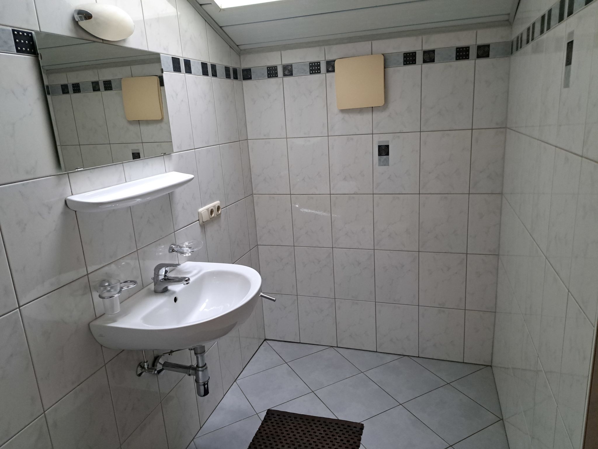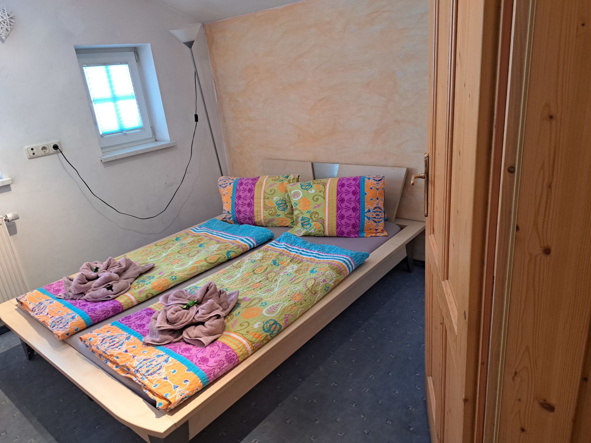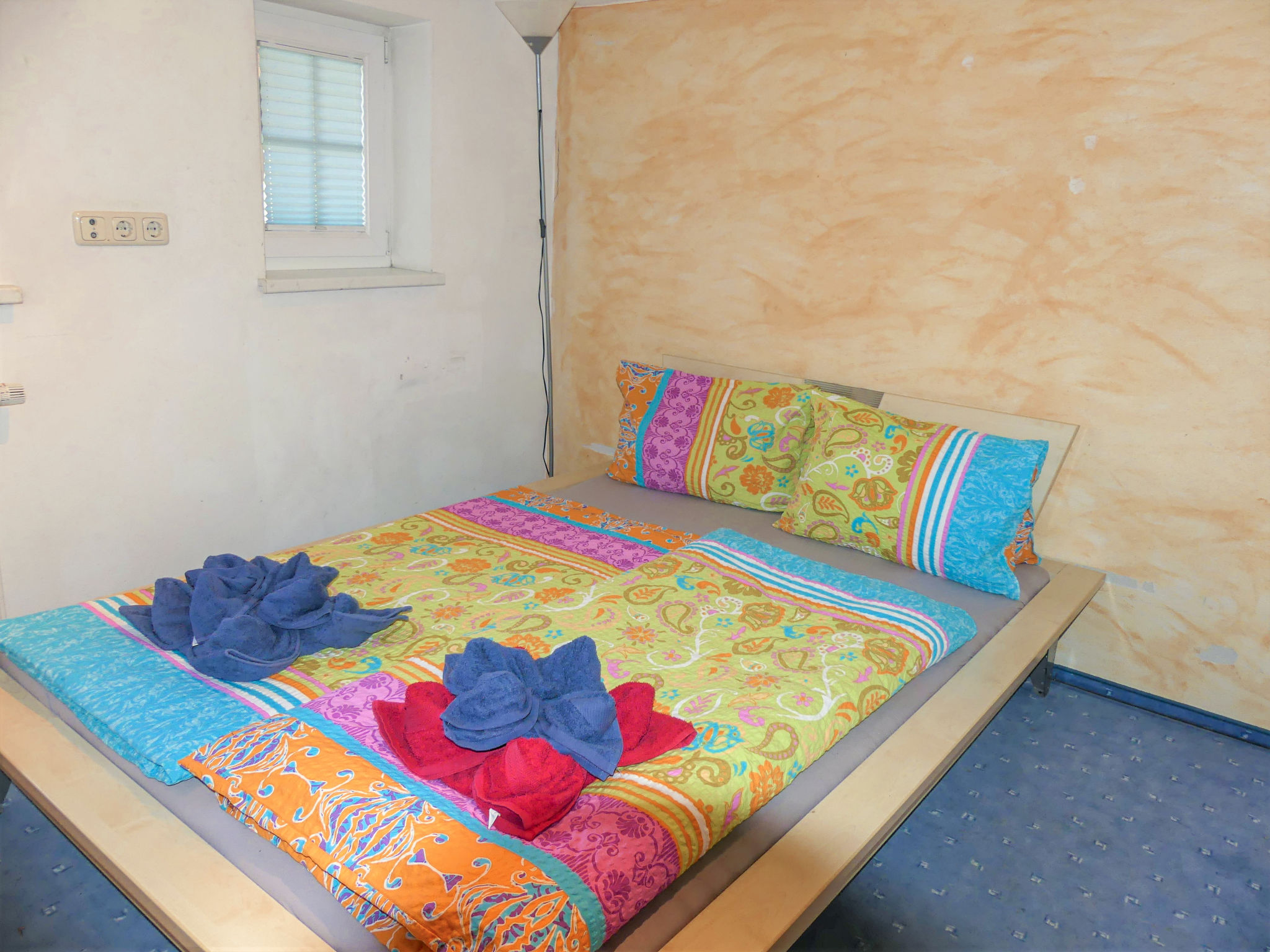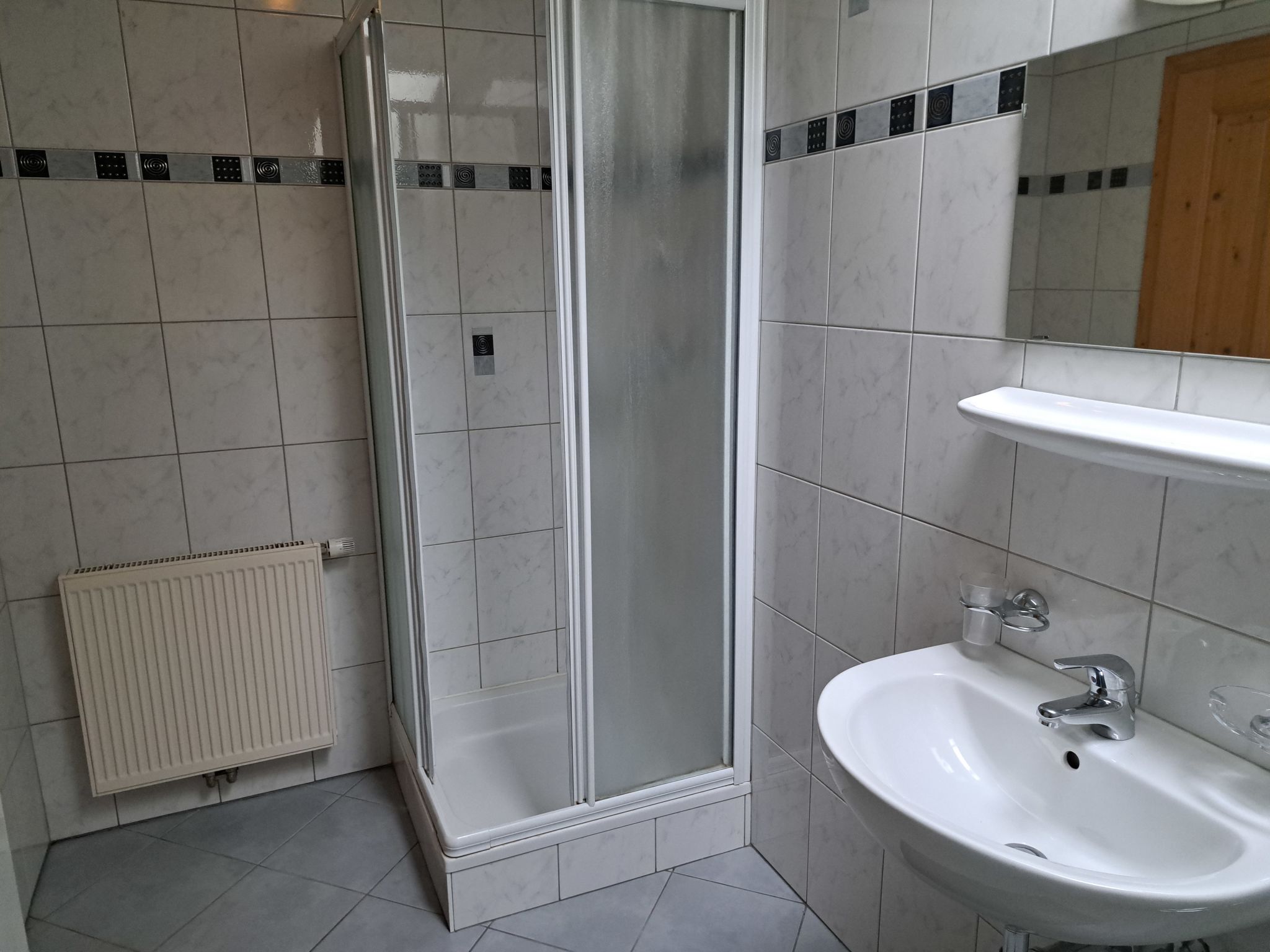 4-Zimmer-Wohnung, 1. Etage (zum Treppenhaus nicht abgeschlossen), ca. 85 m². Wohnküche (4 Ceranfelder, Backofen, Mikrowelle, Geschirrspüler, Kühlschrank. Kaffeemaschine, Wasserkocher, Toaster) mit Essplatz und Balkonausgang. 3 Doppelzimmer. Dusche. Sep.WC. 50609-0012-75-2020