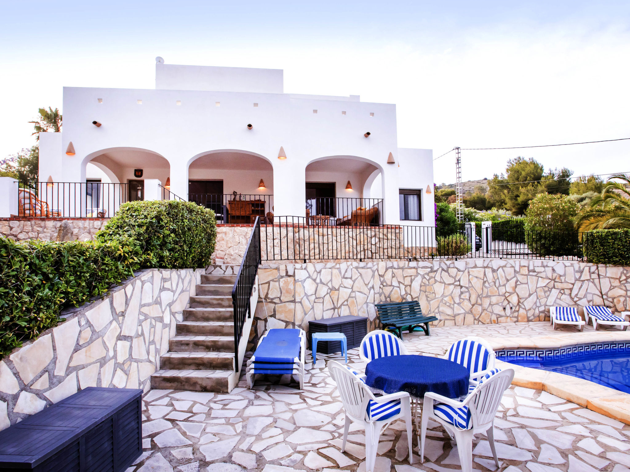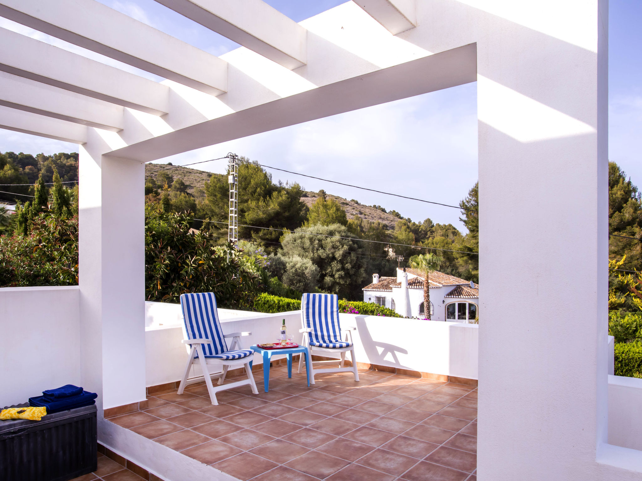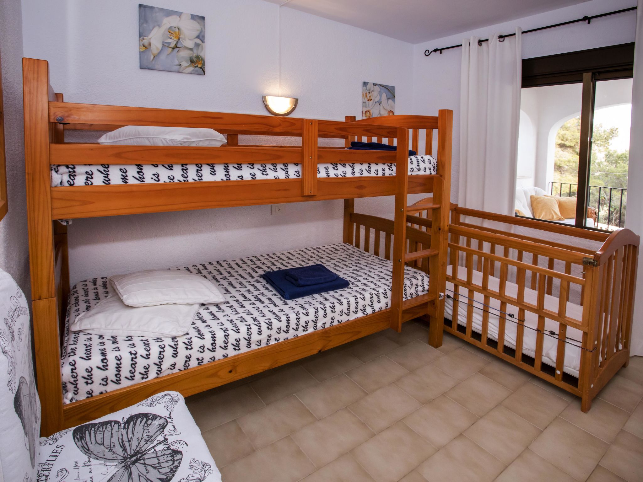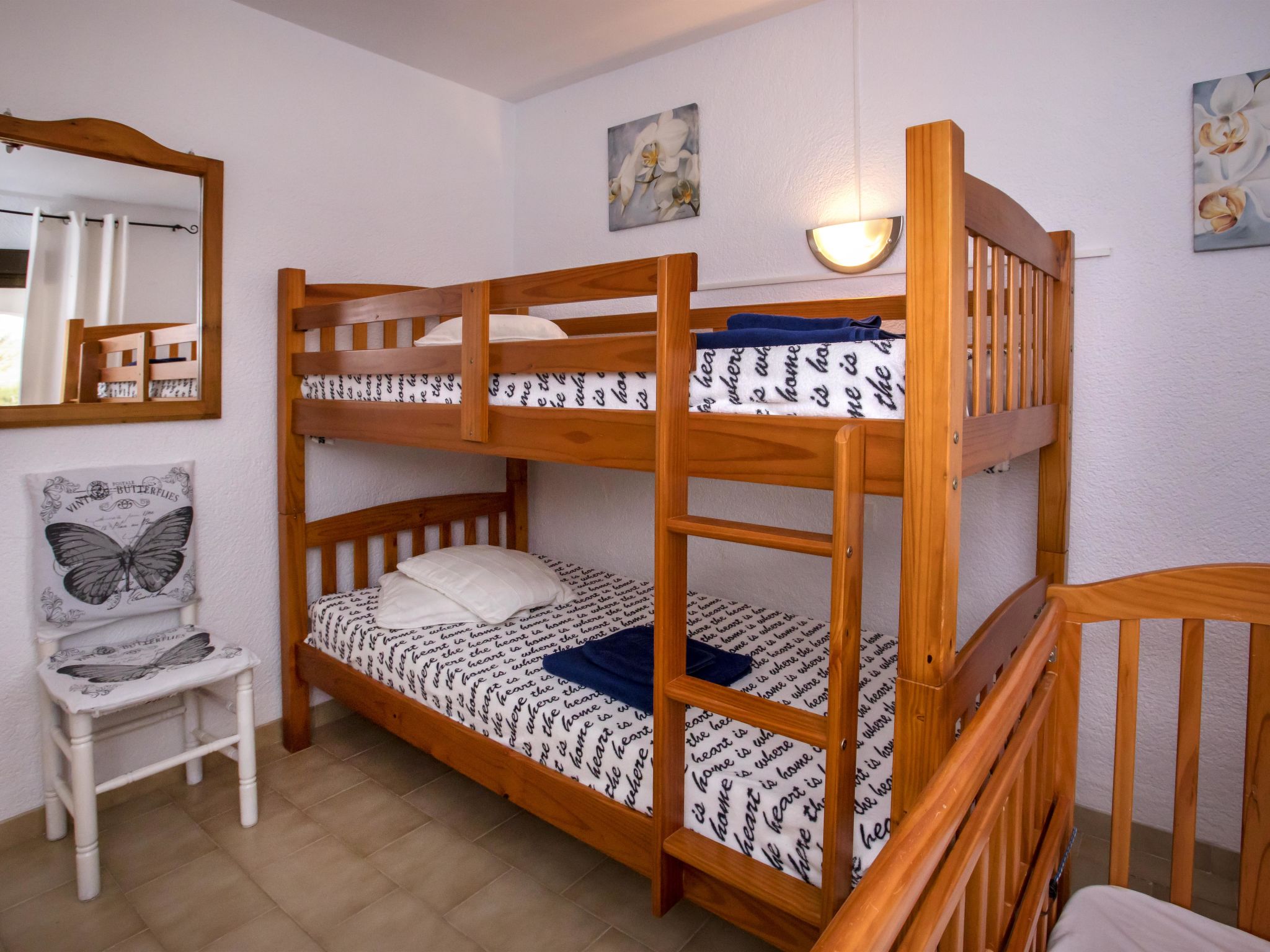 4-Zimmer-Haus 145 m2. Zweckmässig und komfortabel eingerichtet: Wohn-/Esszimmer mit Schwedenofen, Sat-TV, Flachbildschirm, Stereoanlage, DVD und Klimaanlage. Ausgang zur Terrasse. 1 Zimmer mit 1 franz. Bett (150 cm, Länge 190 cm). 1 Kinderzimmer mit 1 x 2 Etagenbetten (90 cm, Länge 190 cm). Küche (4 Kochplatten, Backofen, Geschirrspüler, Mikrowelle, Tiefkühler, elektrische Kaffeemaschine). Ausgang zur Loggia. Dusche/WC. Obergeschoss: 1 Zimmer mit 1 franz. Bett (150 cm, Länge 190 cm), Bad/WC, Doppelwaschbecken und Klimaanlage. Ausgang zur Terrasse. Terrasse 40 m2, grosse Terrasse 60 m2. Terrassenmöbel, Gartengrill, Liegestühle (6). Schöne Sicht auf die Landschaft. Zur Verfügung: Waschmaschine, Bügeleisen, Kinderhochstuhl, Babybett bis 3 Jahre, Haartrockner. Internet (Wireless LAN, gratis). Parkplatz (überdacht, eingezäunt) beim Haus. Bitte beachten: Nichtraucher-Haus. AT444594A