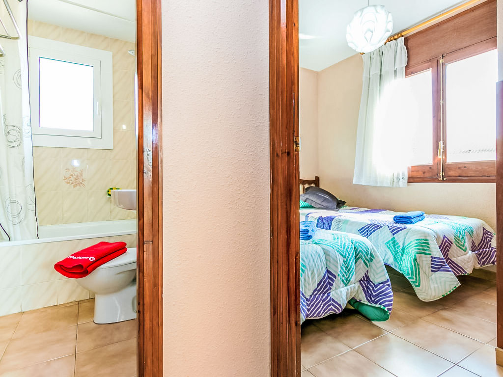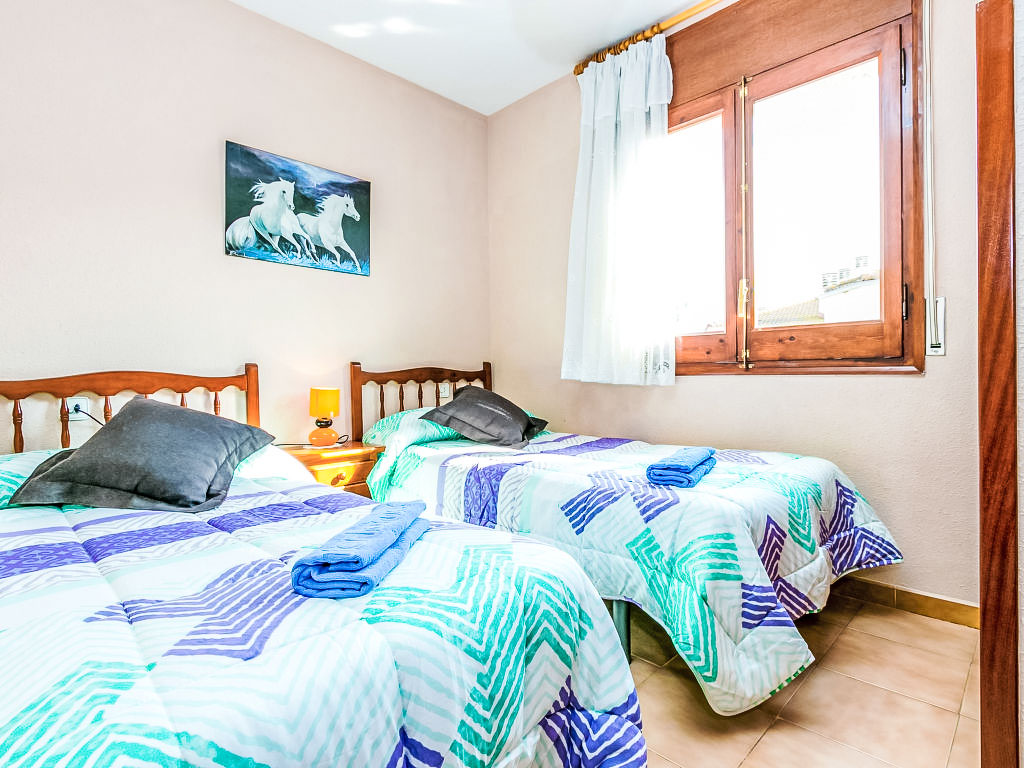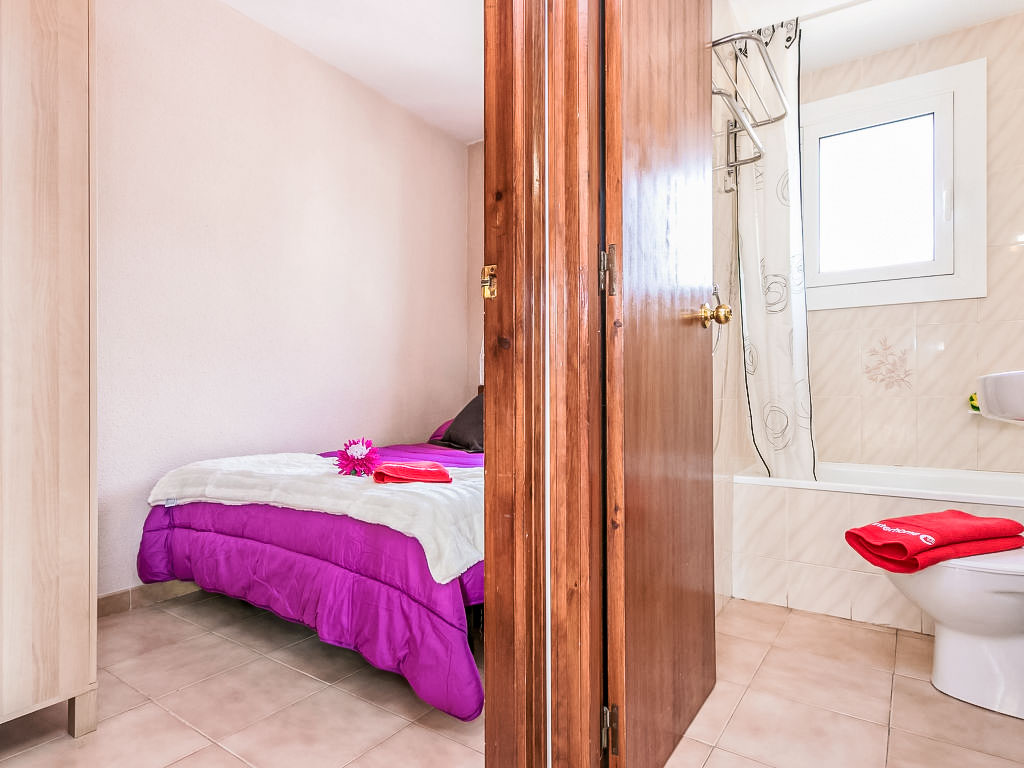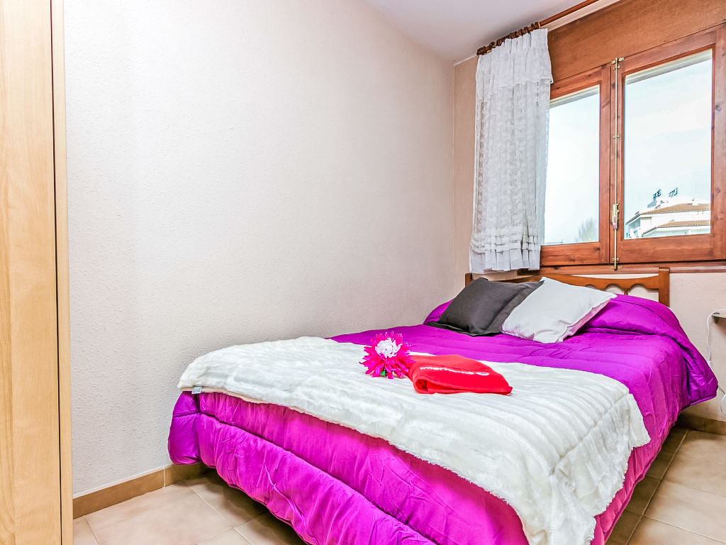 3-Zimmer-Wohnung 39 m2 im 2. Stock. Zweckmässig und komfortabel eingerichtet: Wohn-/Esszimmer mit Sat-TV und Digital-TV (Flachbildschirm). Ausgang zur Terrasse. 1 kleines Zimmer mit 1 franz. Bett (135 cm, Länge 190 cm). 1 kleines Zimmer mit 2 Betten (80 cm, Länge 190 cm). Offene Küche (2 Kochplatten, Toaster, Mikrowelle, Tiefkühler, elektrische Kaffeemaschine). Bad/WC. Terrasse 5 m2. Terrassenmöbel. Zur Verfügung: Waschmaschine. Internet (Wireless LAN, gratis). Parkplatz. Bitte beachten: TV nur ES, FR, DE. Gruppen von Jugendlichen werden nicht akzeptiert. Die Nachbarschaft ist lärmempfindlich. HUTG001904
