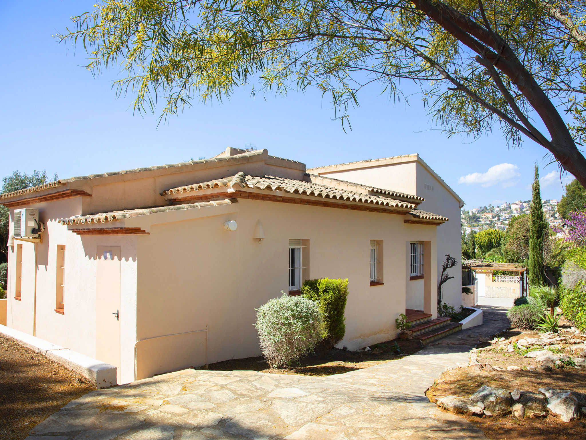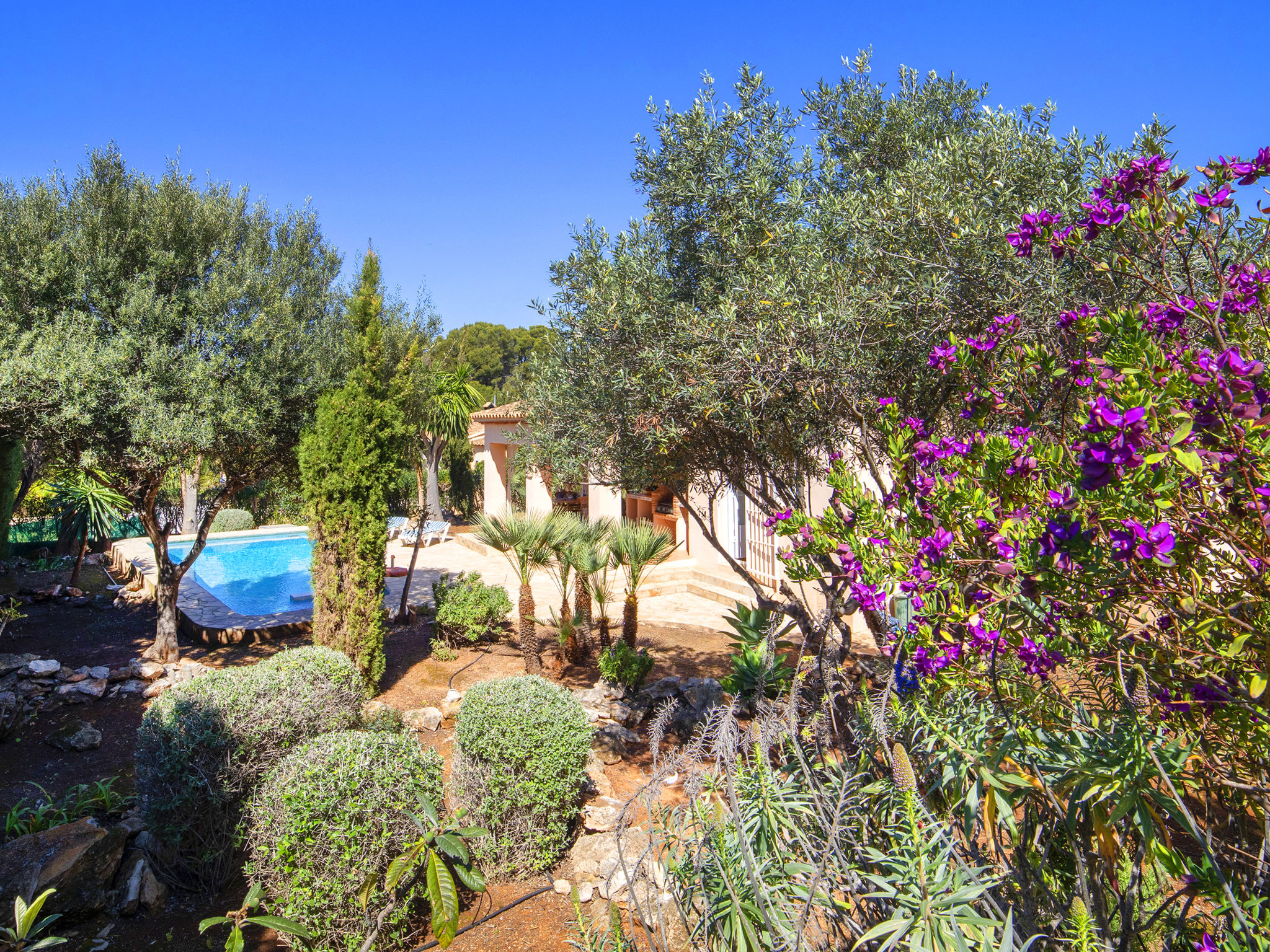 Buenavista: Grosse, kinderfreundliche, gemütliche Villa "Flamenco", umgeben von Bäumen. Im Ort Calpe, im Bezirk Buenavista, ruhige Lage im Villenviertel, 2.4 km vom Meer, 2.4 km vom Strand. Zur Alleinbenutzung: Grundstück (eingezäunt), wunderschöner Garten zum Entspannen, Schwimmbad (4 x 8 m, 85 - 180 cm tief, 01.01.-31.12.) mit Innentreppe und Salzelektrolyse-Reinigungssystem. Pergola, Terrasse, Gartenmöbel, Grill, Poolpflege durch den Besitzer/Gärtner. Im Hause: Zentralheizung, Heizung nur verfügbar von 01.11. bis 30.04.. Parkplatz (überdacht, beschränkte Anzahl). Einkaufsgeschäft 2 km, Lebensmittelgeschäft 2 km, Supermarkt 2 km, Restaurant 1.5 km, Bar 1.3 km, Café 1.3 km, Biergarten 1.5 km, Bushaltestelle "Parque de la Vallesa" 500 m, Sandstrand "Playa de la Fossa" 2.4 km, Badebucht 2.2 km. Sporthafen 3.2 km, Jacht-Hafen 3.2 km, Golfplatz 8.2 km, Surfschule 3.2 km, Segelschule 3.2 km, Radweg 500 m. Nahe gelegene Sehenswürdigkeiten: Salinas de Calpe, Sierra Bernia. Wandergebiete: Peñon de Ifach. Bitte beachten: geeignet für Familien, Babyausstattung (inkl.). Der Besitzer akzeptiert keine Jugendgruppen.