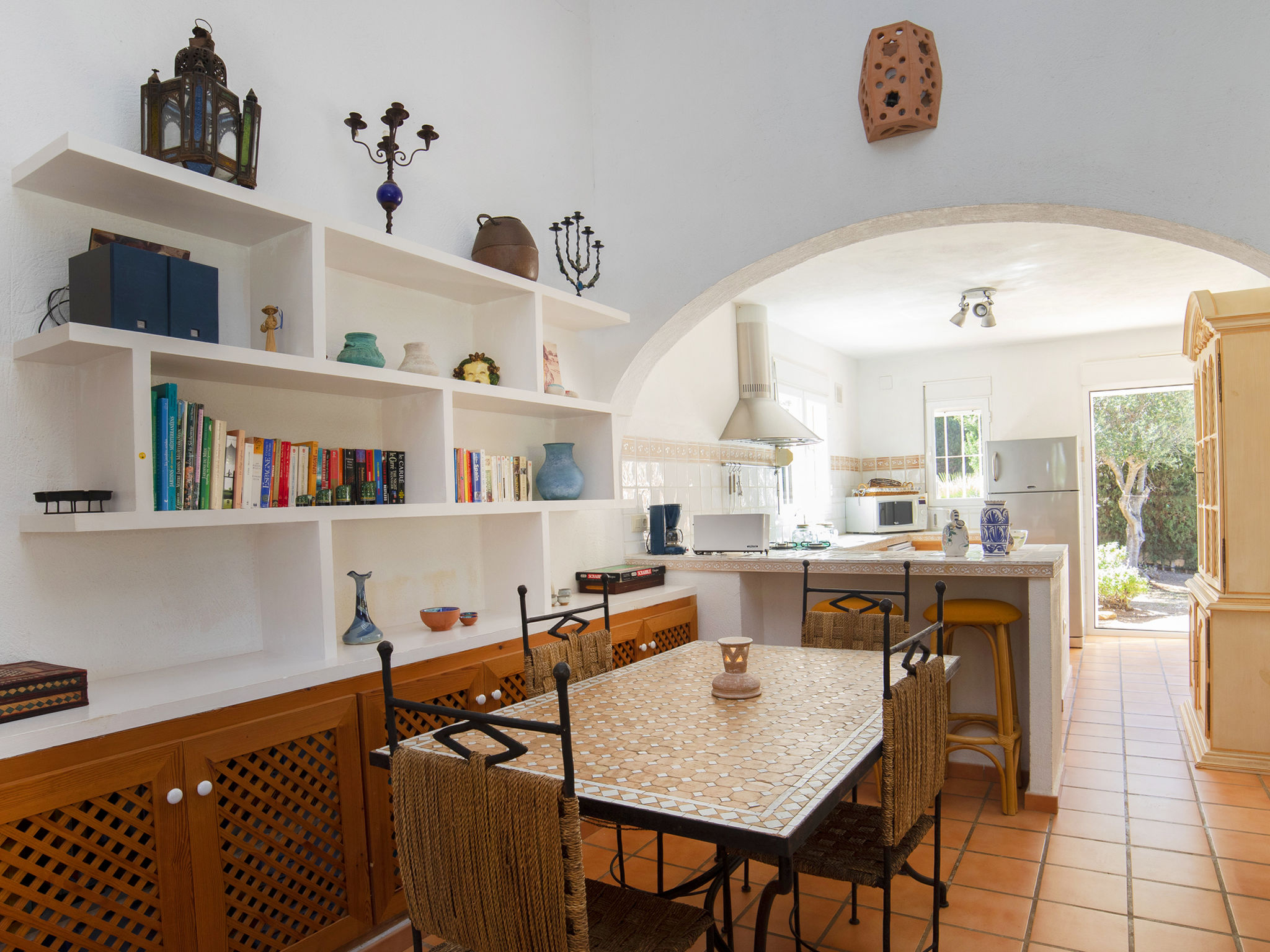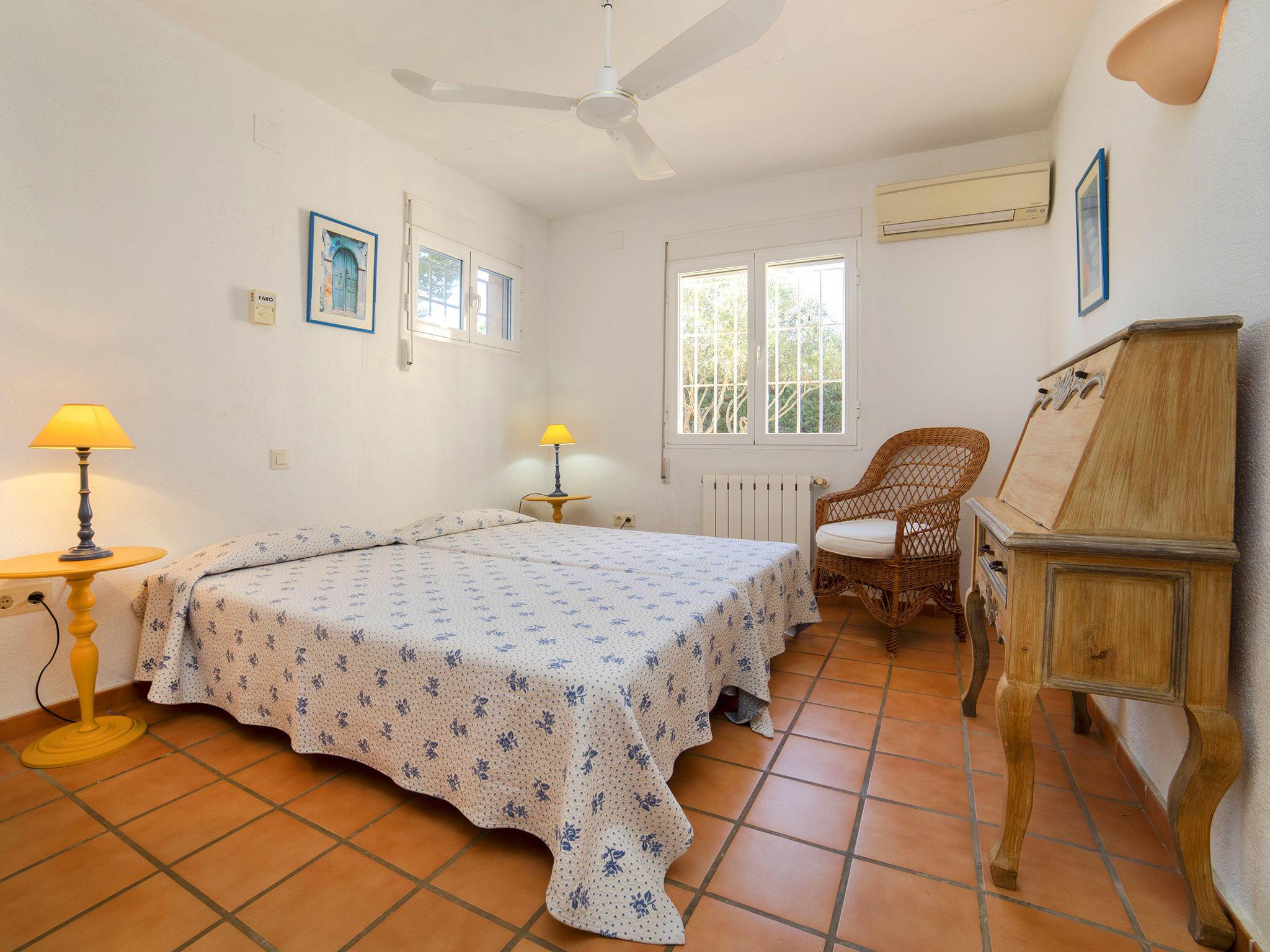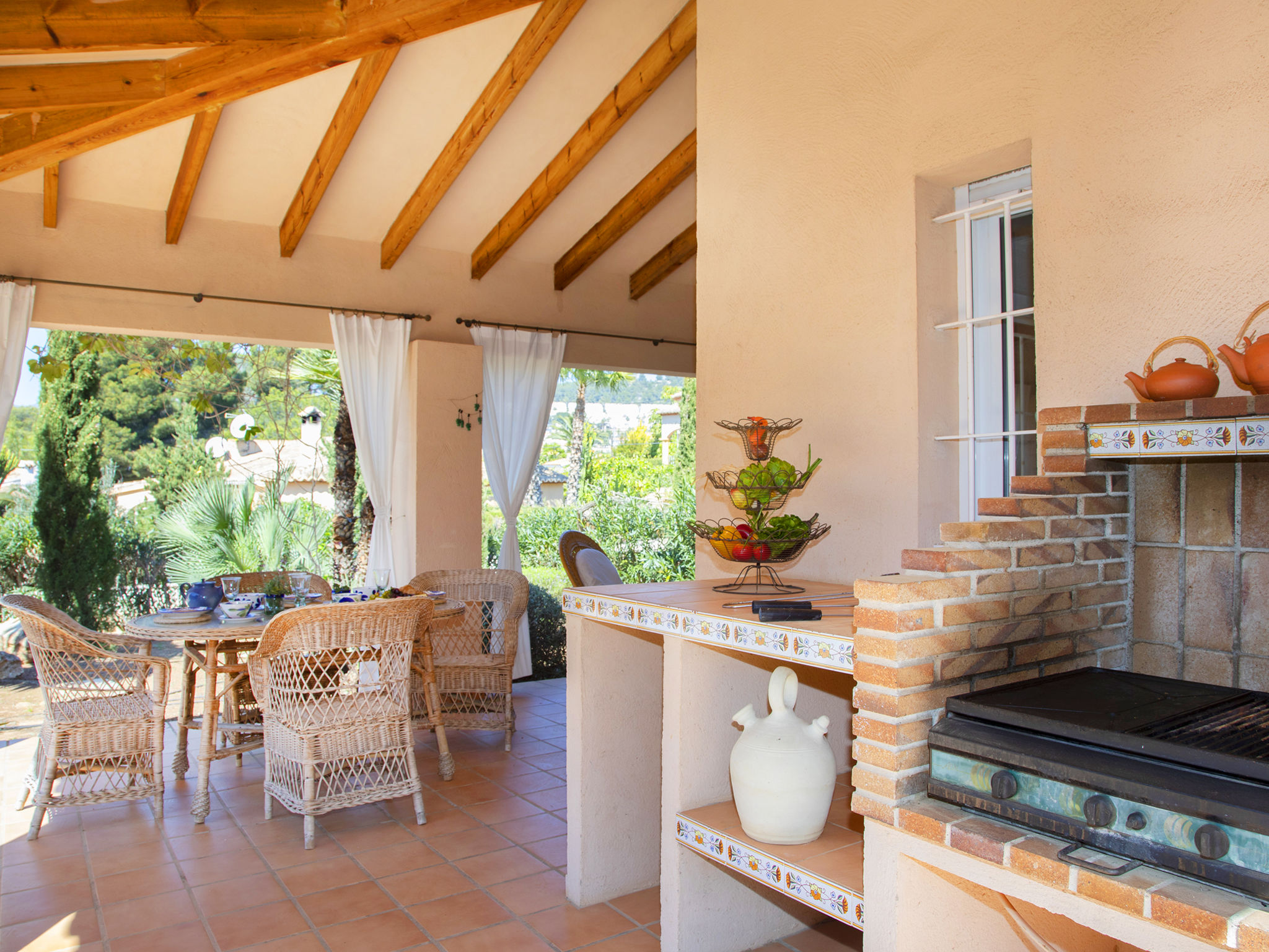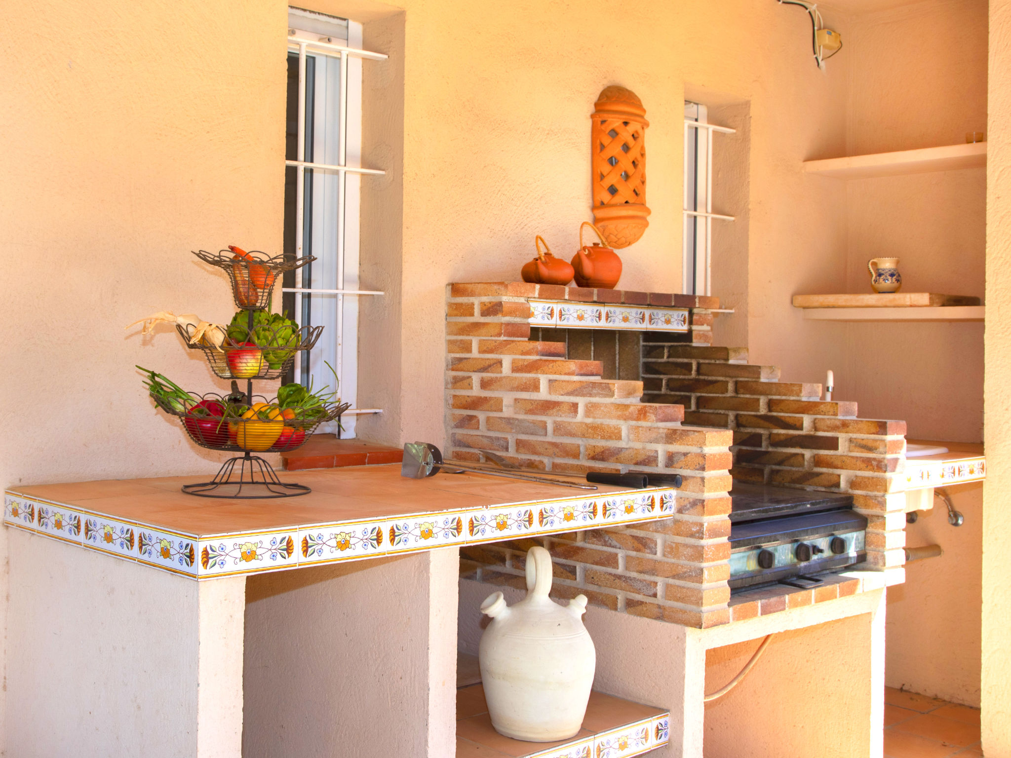 "Flamenco", 3-Zimmer-Villa 140 m2, im ebenerdigen Untergeschoss. Hell, komfortabel und gemütlich eingerichtet: Wohn-/Esszimmer mit Veranda mit Esstisch, Sat-TV, Digital-TV, Flachbildschirm, Stereoanlage und Ventilator. Ausgang zum Gartensitzplatz, zum Schwimmbad. 1 Zimmer mit 2 Betten (90 cm, Länge 190 cm), Klimaanlage, Ventilator und Warmluftheizung. 1 Zimmer mit 1 franz. Bett (150 cm, Länge 190 cm), Bad/Bidet/WC, Klimaanlage, Ventilator und Warmluftheizung. Salon mit 1 Schlafmöglichkeit, offenem Kamin und Stereoanlage. Ausgang zum Gartensitzplatz. Küche (2 Kochplatten, Geschirrspüler, 2 Glaskeramikherd Platten, Toaster, Wasserkocher, Mikrowelle, Tiefkühler, elektrische Kaffeemaschine). Dusche/WC. Terrassenmöbel, Gartengrill, Liegestühle, Loggia. Sicht auf das Schwimmbad und den Garten. Zur Verfügung: Waschmaschine, Bügeleisen, Fliegengitter, Kinderhochstuhl, Babybett bis 2 Jahre, Haartrockner. Internet (Wireless LAN, gratis). Parkplatz (überdacht, eingezäunt, 1 Auto). Geeignet für Familien. VT-487187-A