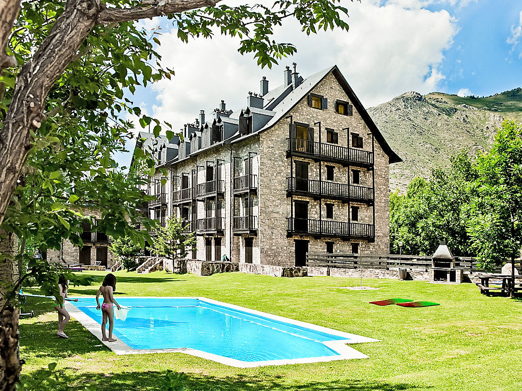 Pla de l'Ermita 2 km von Taüll: Appartementhaus "Herbasabina", auf 4 Stockwerken. Zur Mitbenutzung: Garten mit Rasen, Schwimmbad (4 x 9 m, 2 - 10 cm tief, saisonale Verfügbarkeit: 01.Jun.-11.Sep.). Aussendusche, Kinderspielplatz. In der Anlage: Fahrstuhl. Skipisten 7 km. Der Besitzer akzeptiert keine Jugendgruppen. Bitte beachten: In diesem Haus sind weitere Ferienwohnungen mietbar. Der Komplex Pla de l'Ermita verfügt zudem über 3 gemeinschaftliche und geheizte Schwimmbecken (extra, mit Tages- oder Wochenkarte, Juli-September), Tennisplätze (extra), Minigolf (extra), Bogen- und Gewehrschiessen (extra), Bocciabahn. Zahlreiche Unterhaltungsangebote für Kinder und Erwachsene (einige extra). Fahrrad-Vermietung. Kinderclub mit Malkursen, Kinderhort etc. Kinderspielplatz. Organisierte Ausflüge und Abenteuersport (Wanderungen, Reitausflüge, Hinabsteigen von Schluchten, River-Rafting etc.). Discothek. In der Nebensaison können diese Dienstleistungen nicht angeboten werden.
