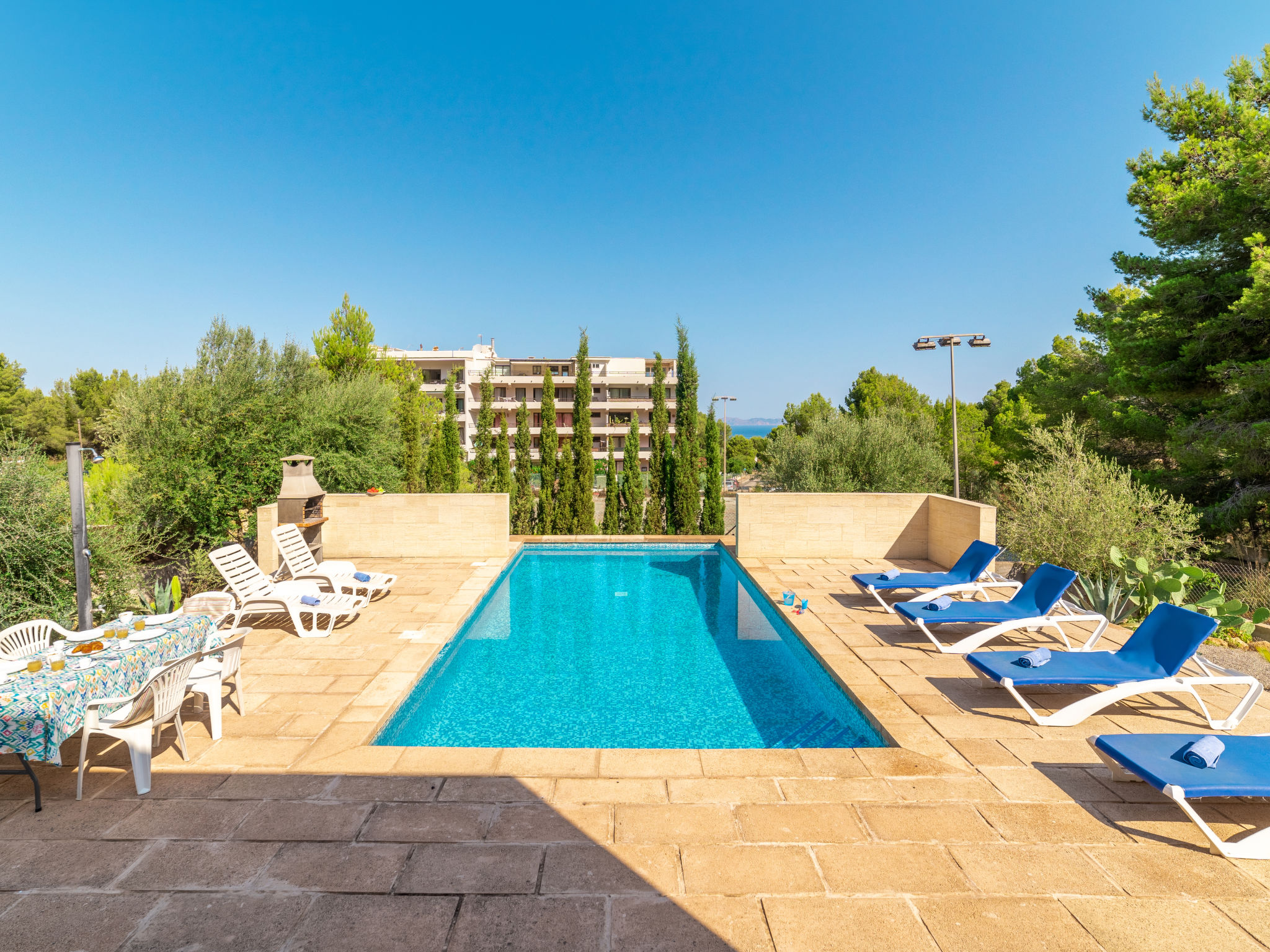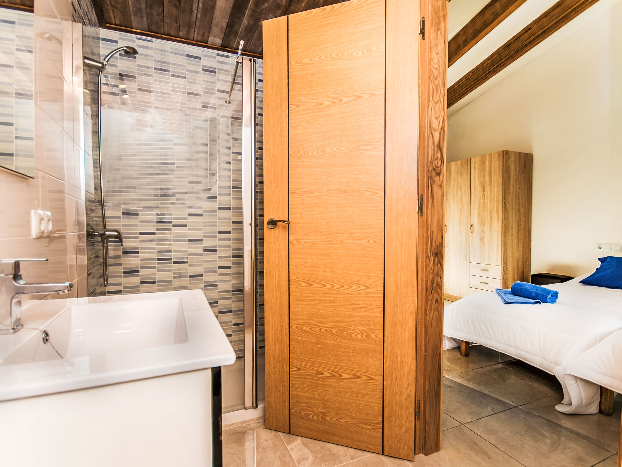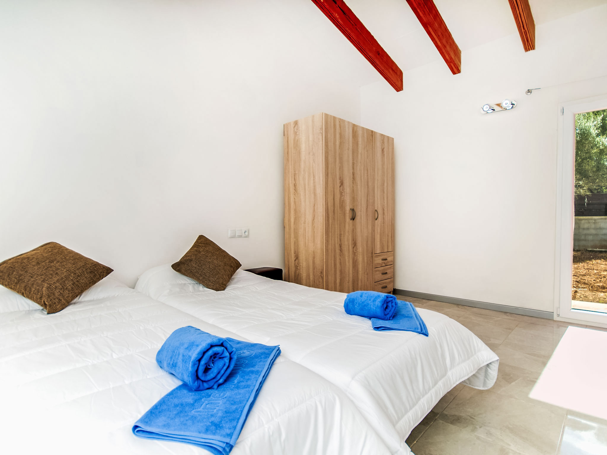 "Betlem", 5-Zimmer-Villa 165 m2 auf 2 Stockwerken. Objekt geeignet für 8 Erwachsene + 1 Kind. Geräumig und hell, vollständig renoviert, sehr zweckmässig und gemütlich eingerichtet: offenes grosses Wohn-/Esszimmer mit Schiebetür, Panoramafenster mit Esstisch, TV, Sat-TV, Flachbildschirm und Holzofen. Ausgang zum Gartensitzplatz, zum Schwimmbad. 1 grosses Doppelzimmer mit Panoramafenster mit 2 Betten (90 cm), Bad/Dusche/WC, Klimaanlage und Warmluftheizung. Ausgang zum Gartensitzplatz. 1 grosses Doppelzimmer mit Panoramafenster mit 2 Betten (90 cm), Klimaanlage und Warmluftheizung. Ausgang zum Gartensitzplatz, zum Schwimmbad. 1 Doppelzimmer mit Schiebetür, Panoramafenster mit 2 Betten (90 cm). Ausgang zum Gartensitzplatz, zum Schwimmbad. Offene Küche (Backofen, Geschirrspüler, 3 Glaskeramikherd Platten, Mikrowelle, Tiefkühler, elektrische Kaffeemaschine). Ausgang zum Gartensitzplatz, zum Schwimmbad. Bad/Dusche/WC. Obergeschoss: (Wendeltreppe) 1 grosses Doppelzimmer mit Schiebetür, Panoramafenster mit 1 Diwanbett und 1 franz. Bett (150 cm), Bad/Dusche/WC, TV, Flachbildschirm, Klimaanlage und Warmluftheizung. Ausgang zur Terrasse. Grosser Balkon, grosser Gartensitzplatz. Terrassenmöbel, Gartengrill, Liegestühle, Loggia. Eingeschränkte Sicht auf das Meer und die Landschaft. Zur Verfügung: Waschmaschine, Bügeleisen, Kinderhochstuhl, Babybett, Haartrockner. Internet (Wireless LAN, gratis). Parkplatz (eingezäunt). Geeignet für Familien. 1 Haustier/Hund erlaubt. L26E218312016