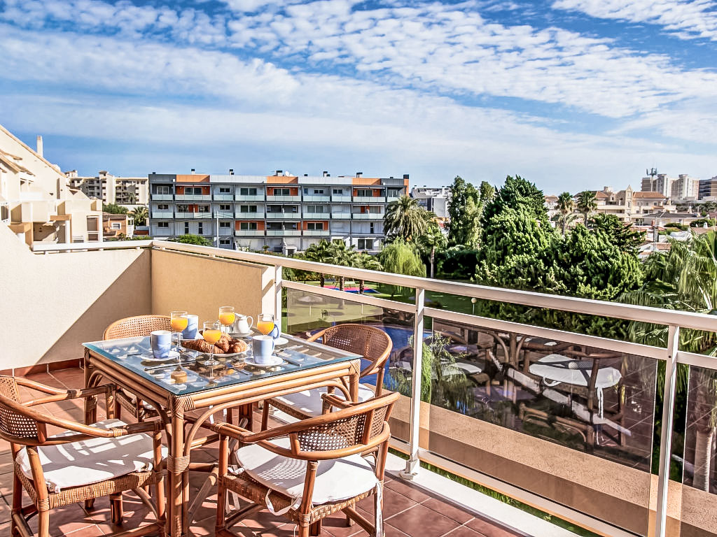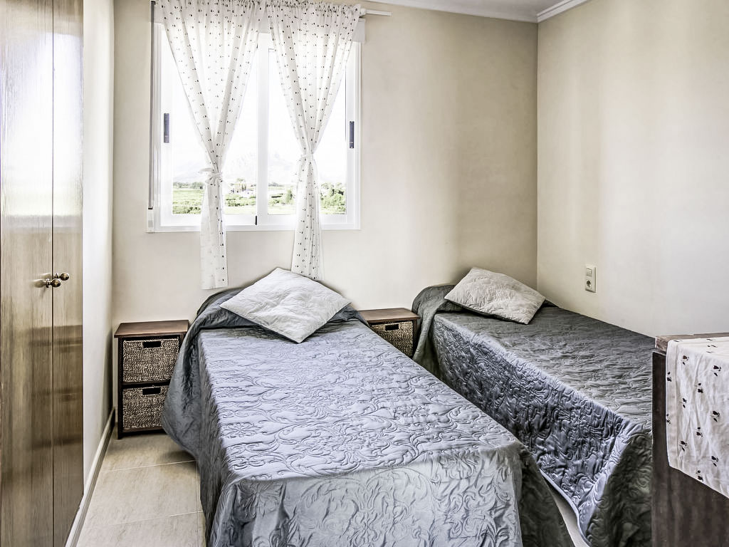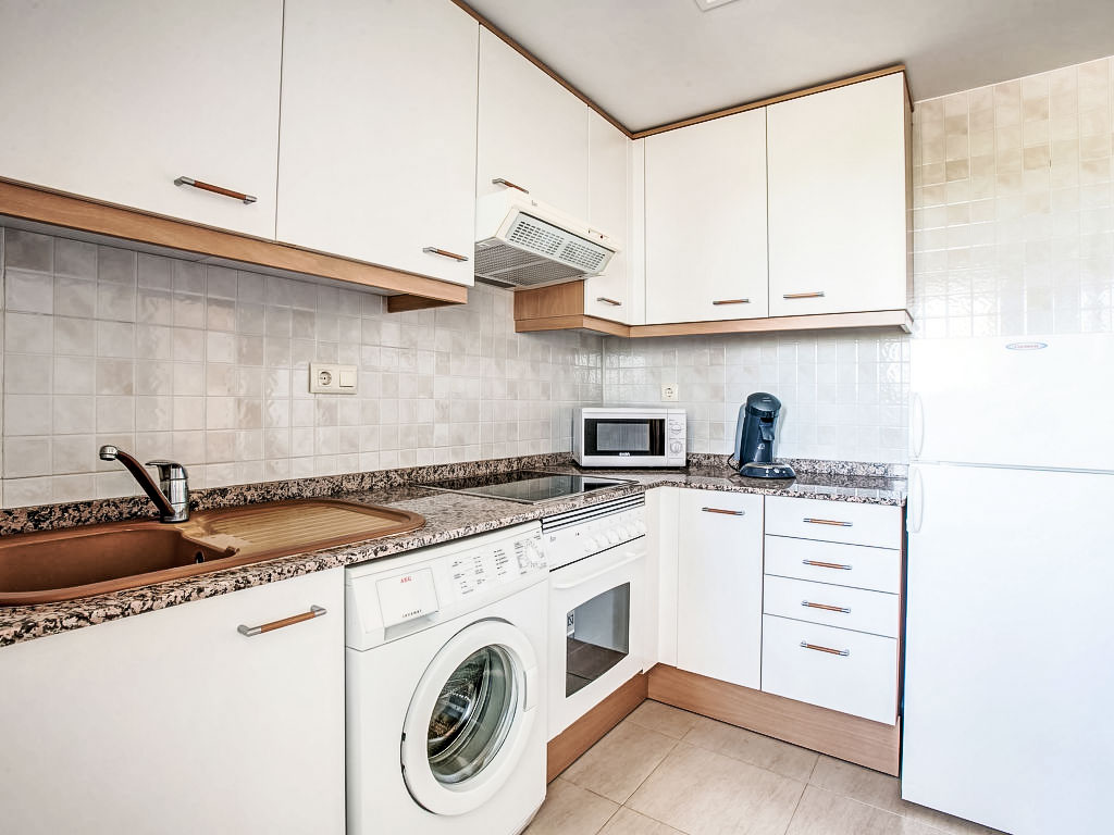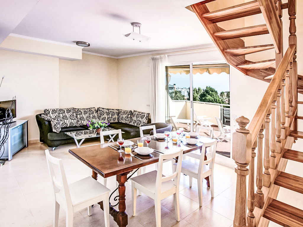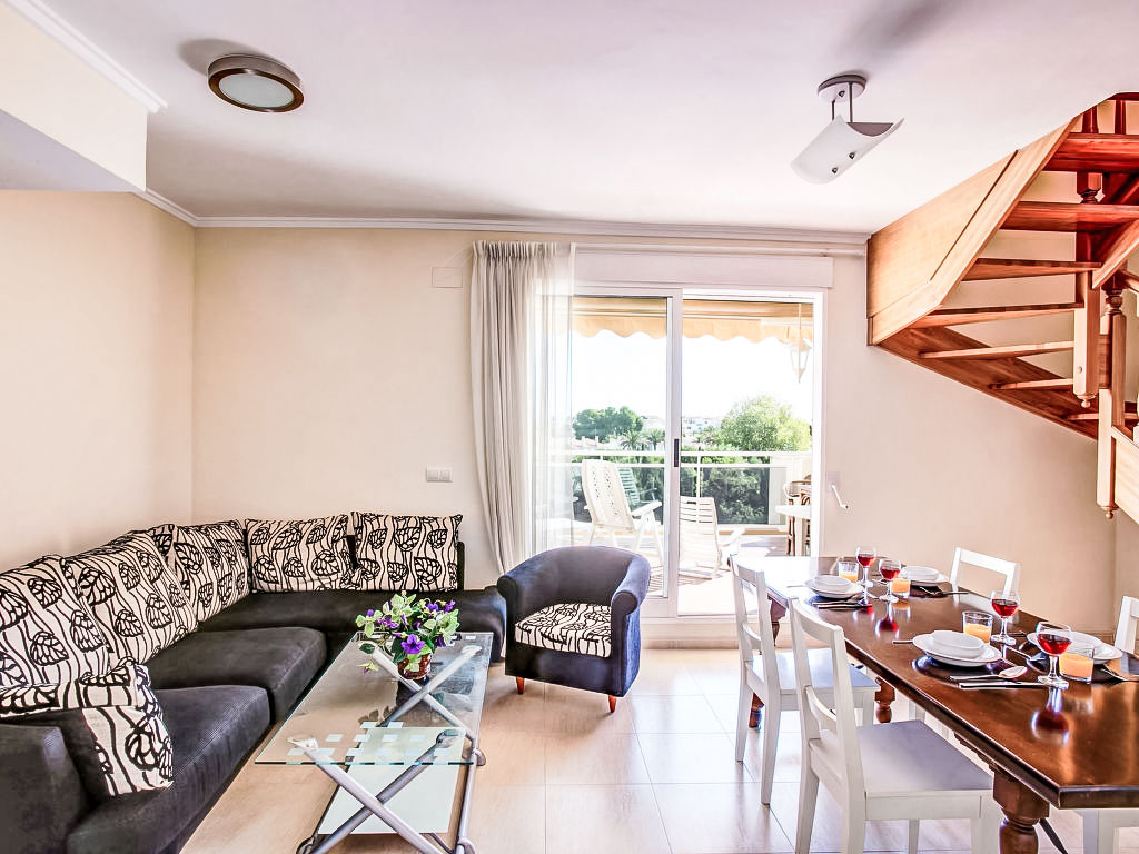 "Residencial Los Sauces", 4-Zimmer-Maisonette-Wohnung. Komfortabel und gemütlich eingerichtet: Wohn-/Esszimmer mit Digital-TV, Klimaanlage und Warmluftheizung. Ausgang zur Terrasse. 1 Zimmer mit 2 Betten, Klimaanlage und Warmluftheizung. Küche (Backofen, 4 Glaskeramikherd Platten, Mikrowelle, Tiefkühler). Dusche/WC. Obergeschoss: 1 Zimmer mit 1 franz. Bett (150 cm, Länge 190 cm), Klimaanlage und Warmluftheizung. 1 Zimmer mit 2 Betten, Klimaanlage und Warmluftheizung. Bad/Bidet/WC. Zur Verfügung: Waschmaschine. Parkplatz Nr. 8. AT-458588-A