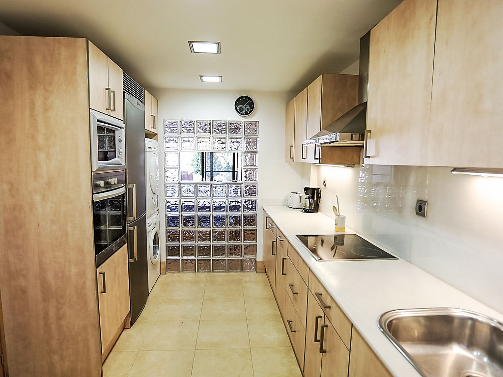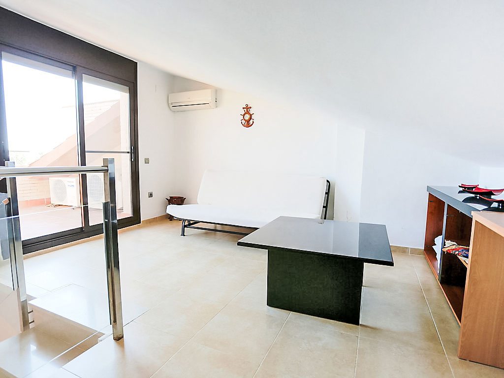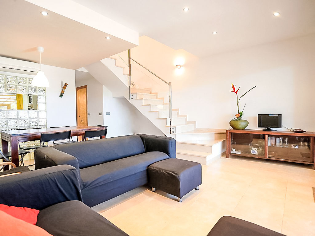 "Residencial Las Palmeras", 5-Zimmer-Reihenhaus 136 m2 auf 3 Stockwerken. Schön und geschmackvoll eingerichtet: Wohn-/Esszimmer mit Esstisch und TV. Ausgang zum Gartensitzplatz. Küche (Backofen, Geschirrspüler, 4 Glaskeramikherd Platten, Mikrowelle, elektrische Kaffeemaschine) mit Durchreiche. Dusche/WC. Obergeschoss: 1 Zimmer mit 1 franz. Bett (150 cm), Bad/Bidet/WC. Ausgang zur Terrasse. 2 Zimmer, jedes Zimmer mit 1 franz. Bett (135 cm). Dusche/WC. 2. Obergeschoss: 1 abgeschrägtes Zimmer mit 2 Betten (90 cm). Ausgang zur Terrasse. Klimaanlage. Grosse Terrasse 18 m2, kleine Terrasse 8 m2, Garten 130 m2. Terrassenmöbel, Gartengrill (mobil), Loggia. Sicht auf das Meer. Zur Verfügung: Waschmaschine, Wäschetrockner, Bügeleisen. Internet (Wireless LAN). Parkplatz (überdacht) beim Haus. Bitte beachten: geeignet für Familien. TV nur ES. HUTTE034090