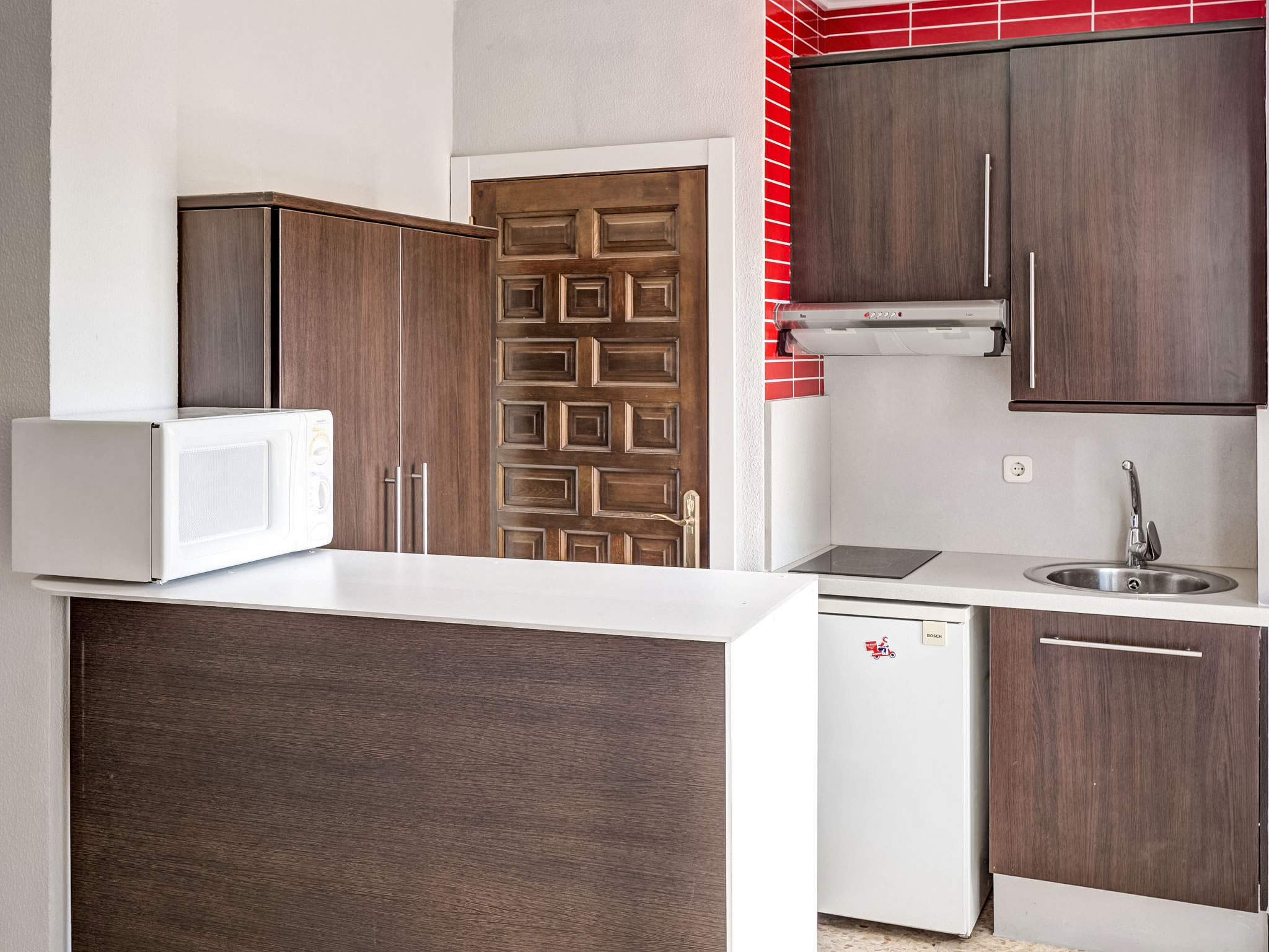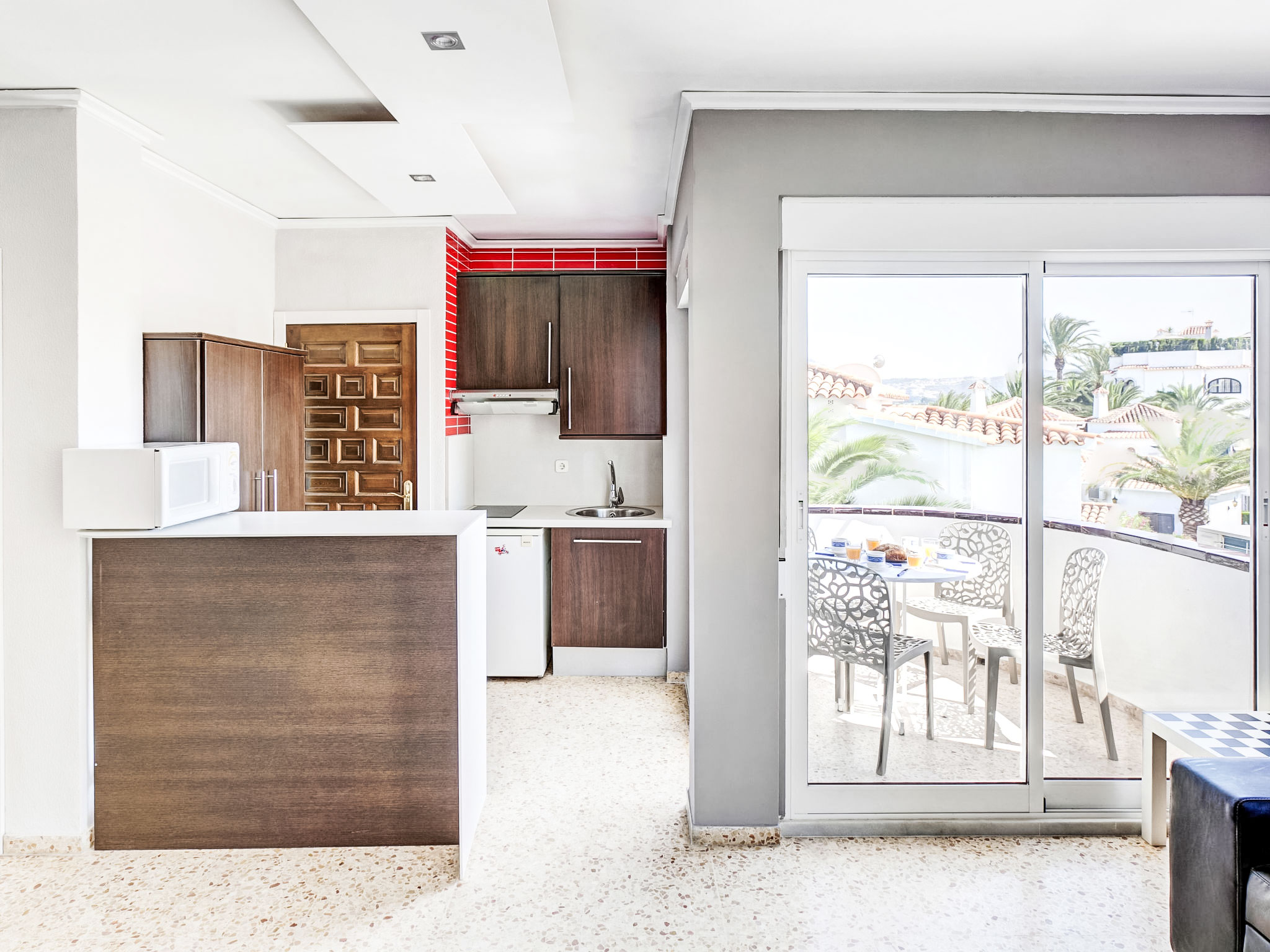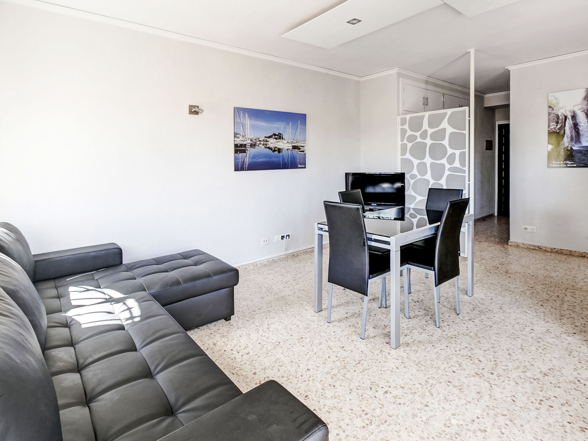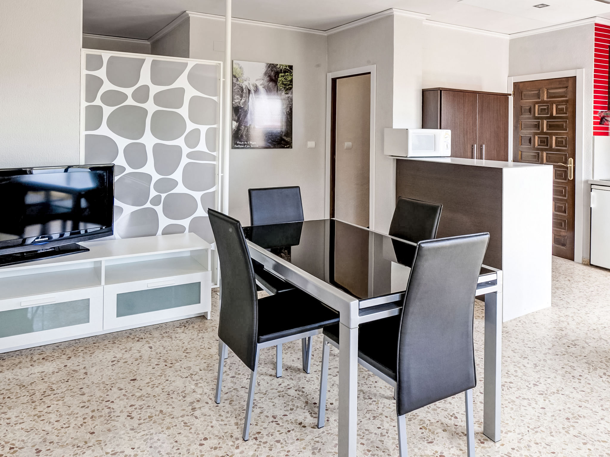 "Residencia El Palmar", 2-Zimmer-Wohnung. Hell, renoviert im Jahre 2017, einfach und geschmackvoll eingerichtet: Wohn-/Esszimmer mit 1 Doppeldiwanbett, Digital-TV, Flachbildschirm, Klimaanlage und Warmluftheizung. Ausgang zum Balkon. 1 Zimmer mit 2 Betten (90 cm, Länge 180 cm). Offene Küche (2 Glaskeramikherd Platten, Toaster, Wasserkocher, Mikrowelle, elektrische Kaffeemaschine) mit Klimaanlage und Warmluftheizung. Ausgang zum Balkon. Dusche/WC. Zur Verfügung: Bügeleisen, Kinderhochstuhl, Babybett bis 2 Jahre. Internet (Wireless LAN, gratis). AT-458589-A