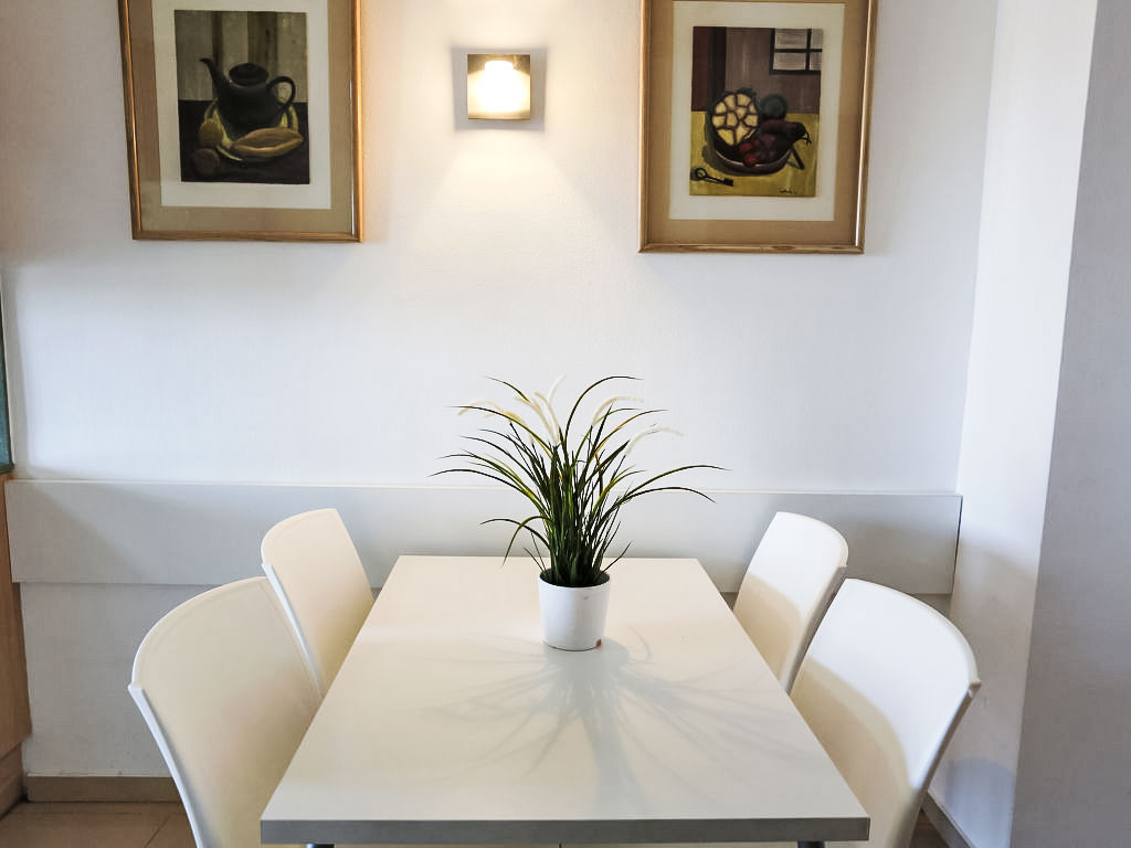 5-Zimmer-Wohnung 100 m2. Geräumig und hell, komfortabel und geschmackvoll eingerichtet: Wohn-/Esszimmer mit Esstisch, Digital-TV, Klimaanlage und Warmluftheizung. Ausgang zur Terrasse. 3 Zimmer, jedes Zimmer mit 2 Betten (90 cm). 1 grosses Zimmer mit 1 franz. Bett und Bad/Bidet/WC. Ausgang zur Terrasse. Grosse Küche (Backofen, Geschirrspüler, 4 Glaskeramikherd Platten, Mikrowelle) mit Esstisch. Ausgang zur Terrasse. Bad/Bidet/WC. Klimaanlage. Grosse Terrasse 20 m2. Terrassenmöbel. Sicht auf das Schwimmbad und die Landschaft. Zur Verfügung: Waschmaschine. Parkplatz Nr. 47 (überdacht). Geeignet für Familien. HUTT007117