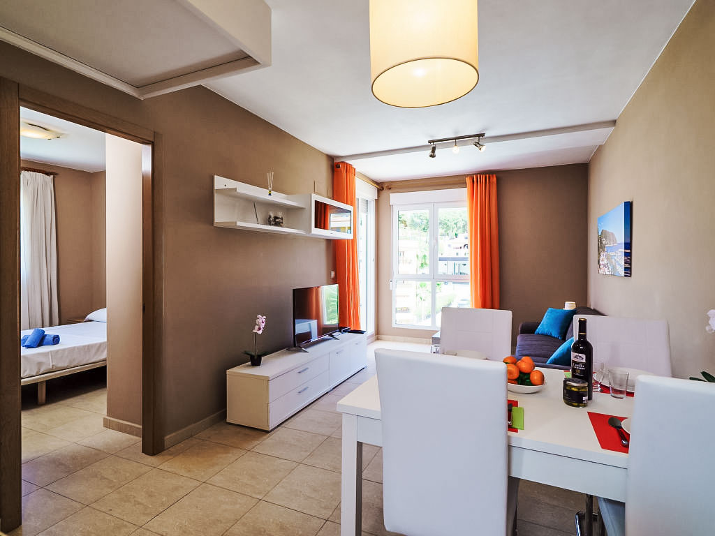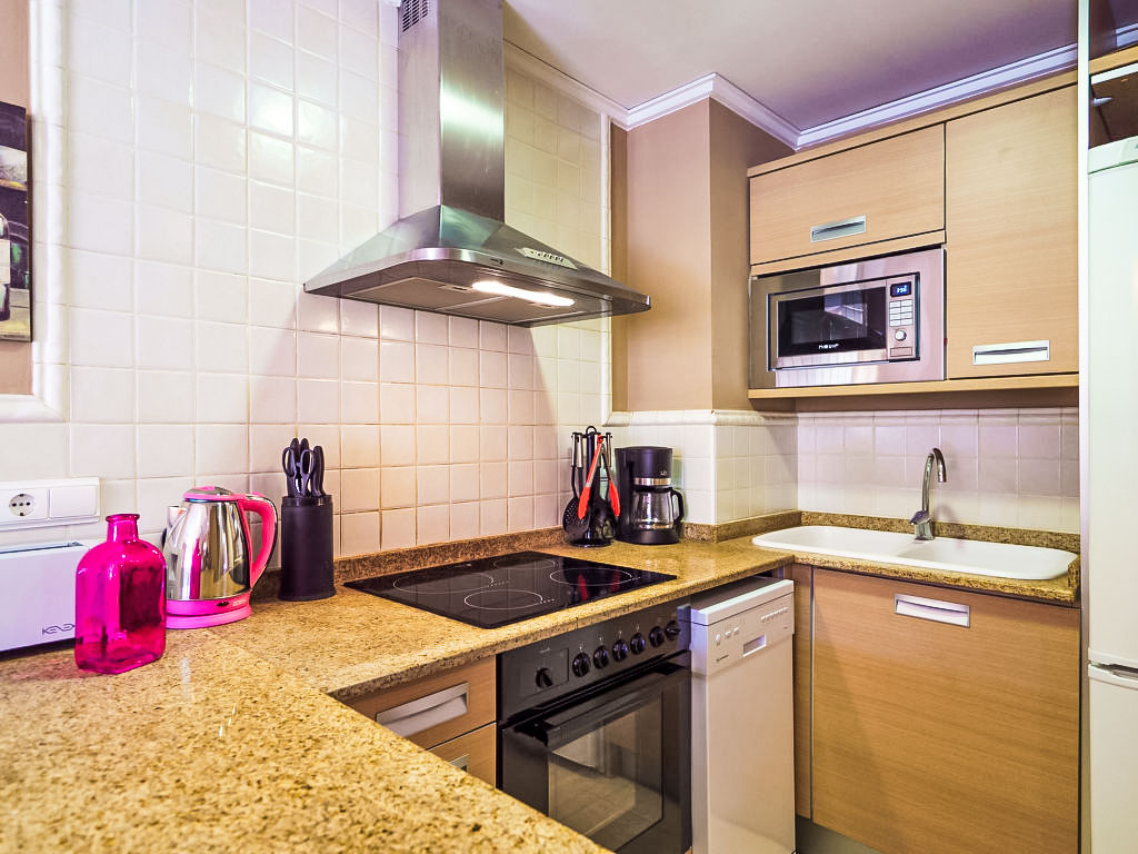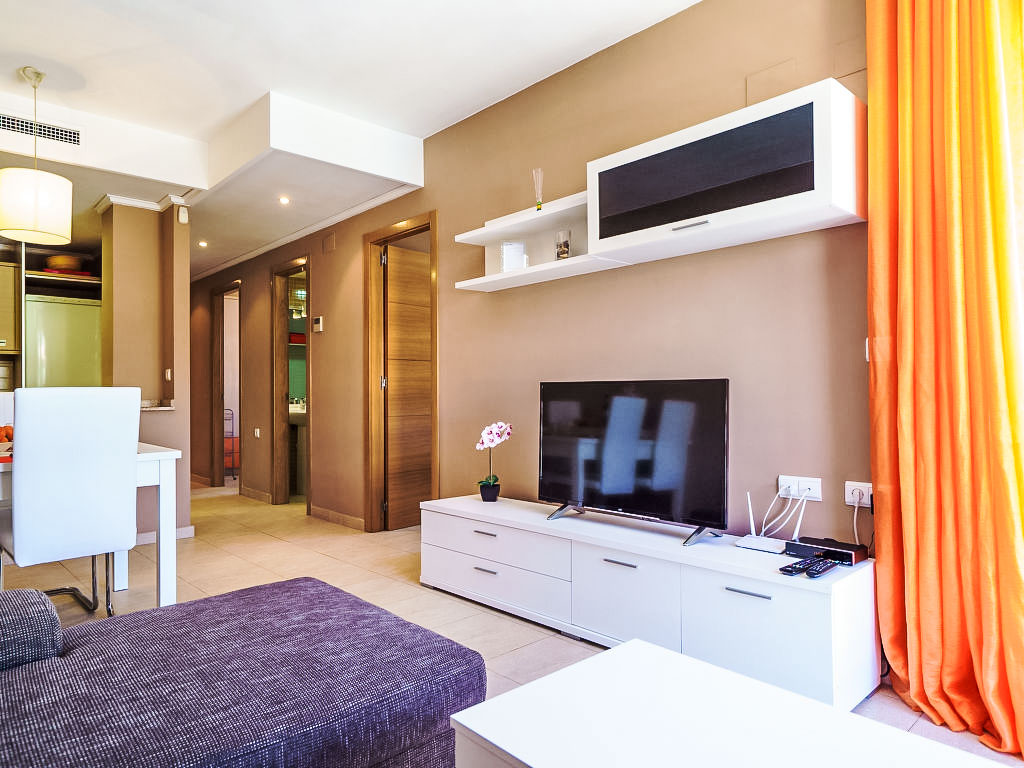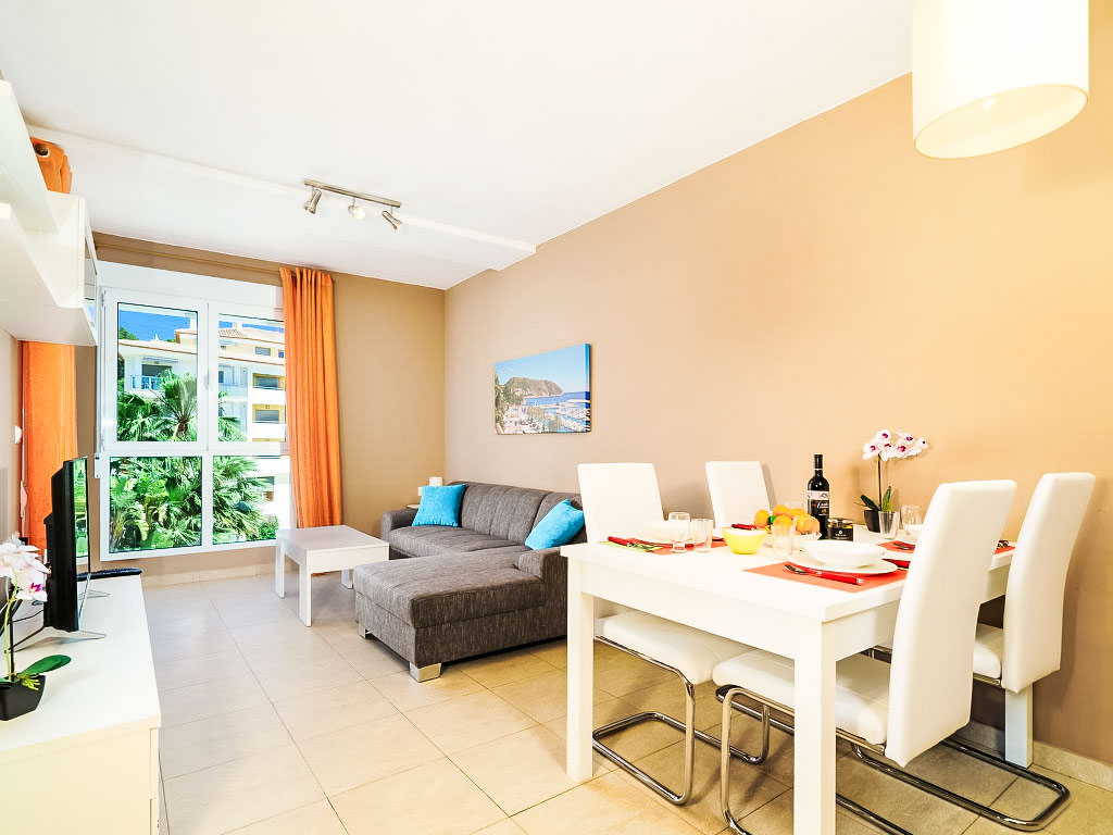 "Sueno del Mar", 3-Zimmer-Wohnung 60 m2. Hell, sehr schön und gemütlich eingerichtet: Wohn-/Esszimmer mit Internationale TV-Sender, Flachbildschirm und Klimaanlage. Ausgang zur Terrasse. 1 Doppelzimmer mit (2 x 90 cm, Länge 200 cm), Dusche/WC und Klimaanlage. 1 Zimmer mit 2 Betten (90 cm, Länge 200 cm), Klimaanlage. Offene Küche (Backofen, Geschirrspüler, 4 Glaskeramikherd Platten, Mikrowelle, Tiefkühler, elektrische Kaffeemaschine). Dusche/WC. Balkon. Terrassenmöbel. Zur Verfügung: Waschmaschine, Bügeleisen. Internet (Wireless LAN, gratis). Garage. Bitte beachten: geeignet für Familien Wohnung auf Hofseite. Nichtraucher-Unterkunft. AT-458126-A